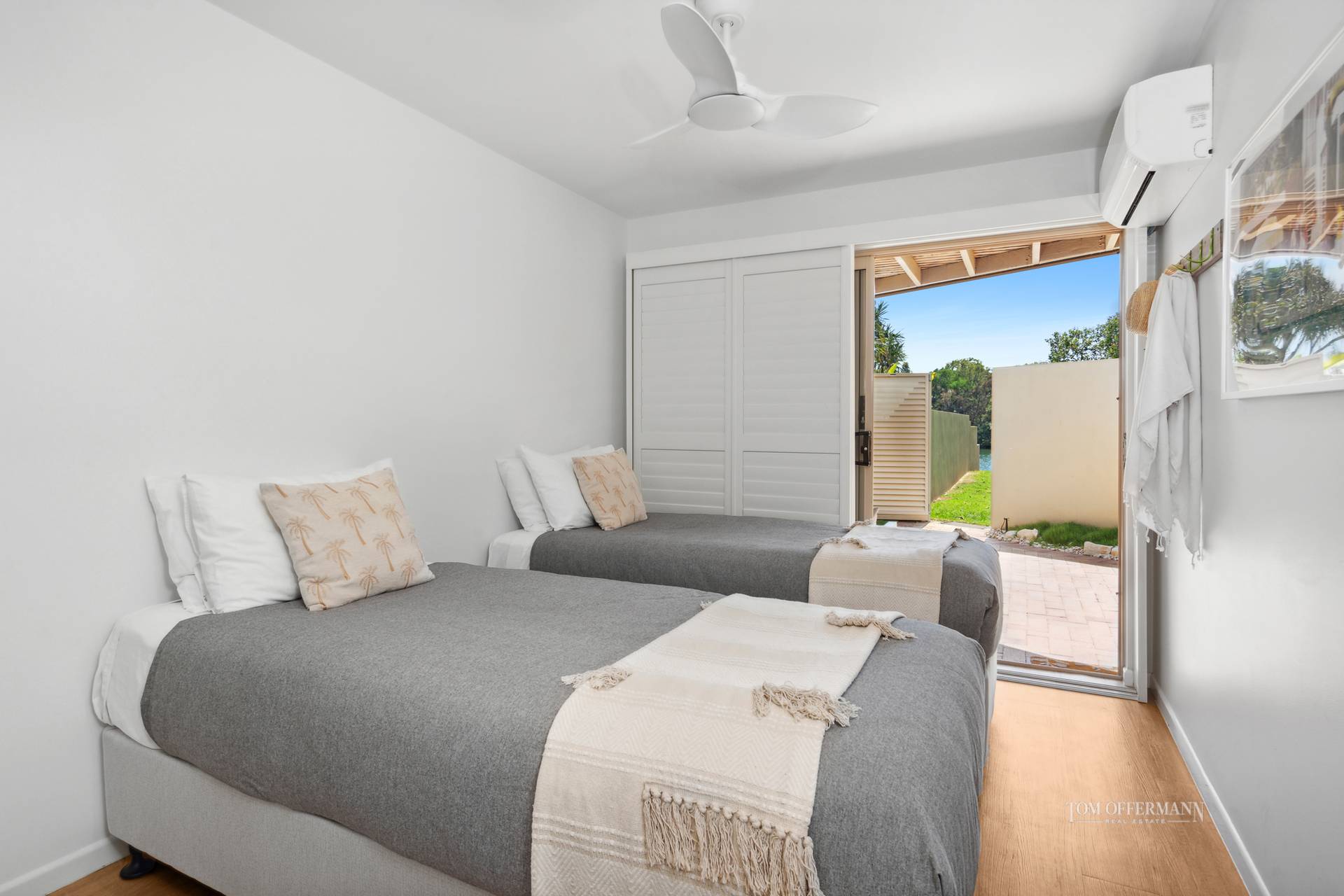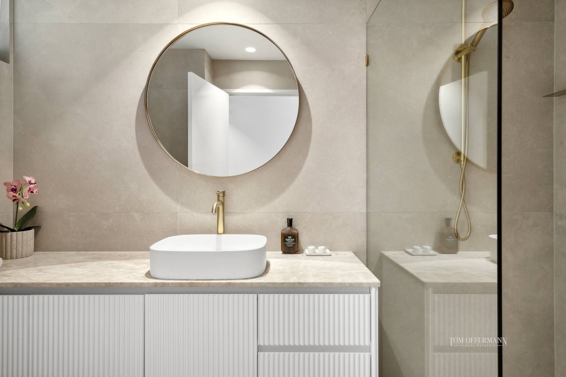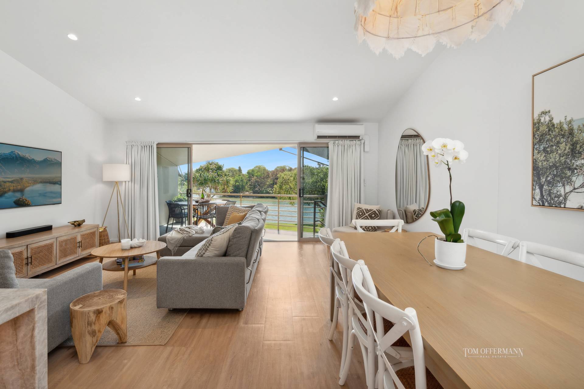 • About: total contemporary makeover completed Aug 2024; timber flooring; white plantation shutters; monochromatic/beachy aesthetic; seaside inspired artworks; fans/aircon; open plan living w views over to pool, park and river; white venetian blinds; pale grey fabric modular sofa & 2 armchairs; Smart TV; timber console & coffee table; timber dining table & 8 white & rattan chairs; 2 designer feathery pendants; custom cabinetry/bar w wine fridge; 2-bedrooms w sliders out to terrace premier king suite w fluted timber bedhead, WIR & ensuite w pale grey/white tiles; white stone-topped single basin fluted cabinetry & rose gold tapware; twin bedroom w BIR & bathroom as previous