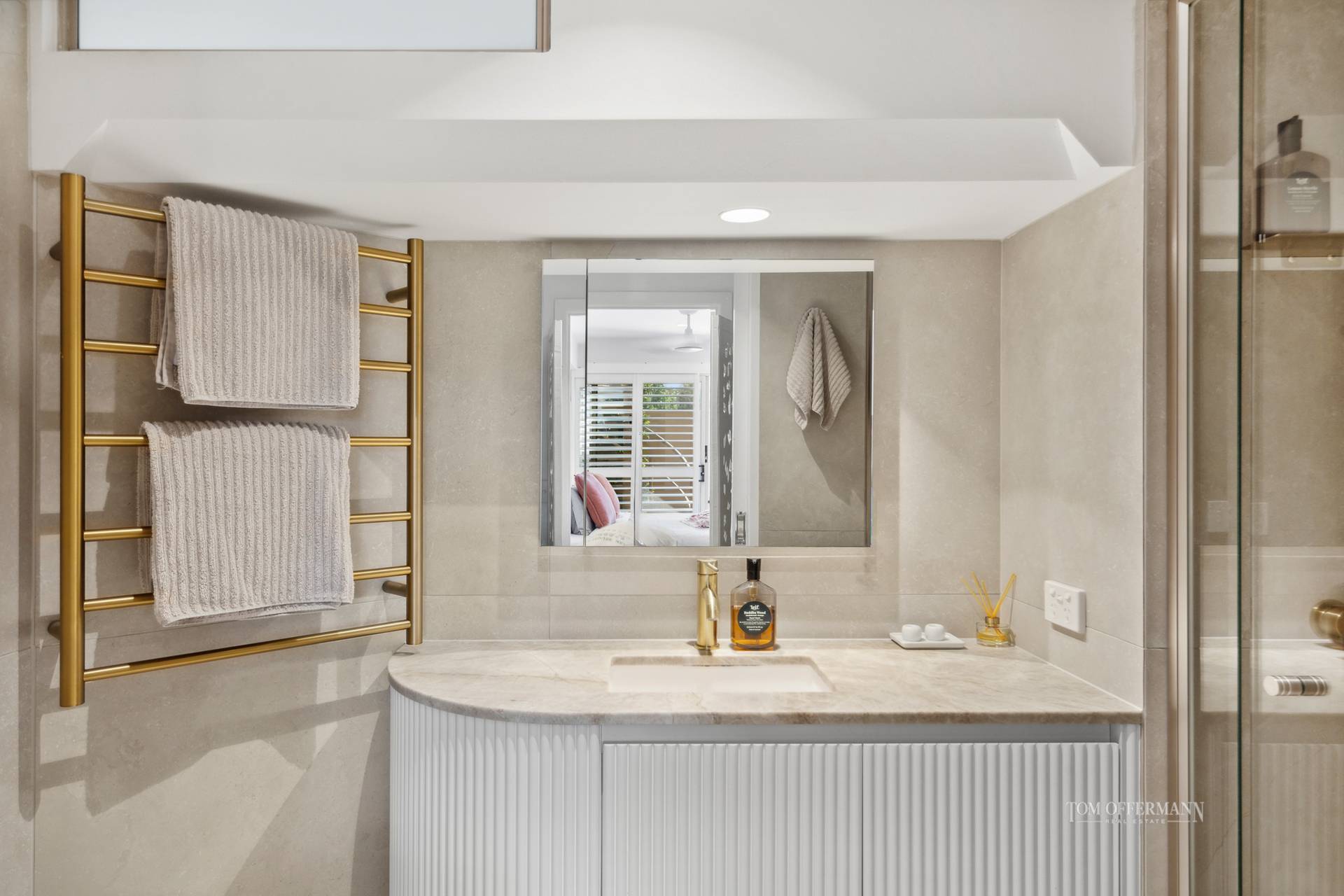 Downstairs are two bedrooms with slide away doors to the undercover terrace. The premier king suite has a fluted timber bedhead, walk-in robe and an ensuite with pale grey and white tiles, white stone-topped single basin and fluted cabinetry plus brushed rose gold tapware. The bathroom adjoining the twin bedroom with built-in robe, has been similarly renovated.
