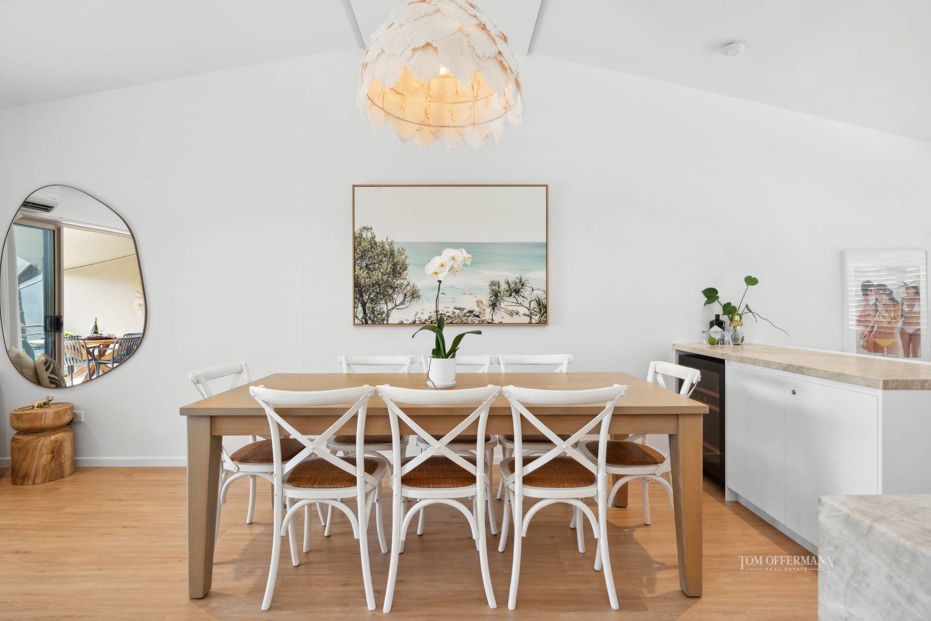 Come inside, admire the contemporary monochromatic albeit beachy aesthetic and predominantly white and ecru-toned palette, in the upstairs open plan dining and living areas, with beautiful timber flooring, white plantation shutters and venetians.
