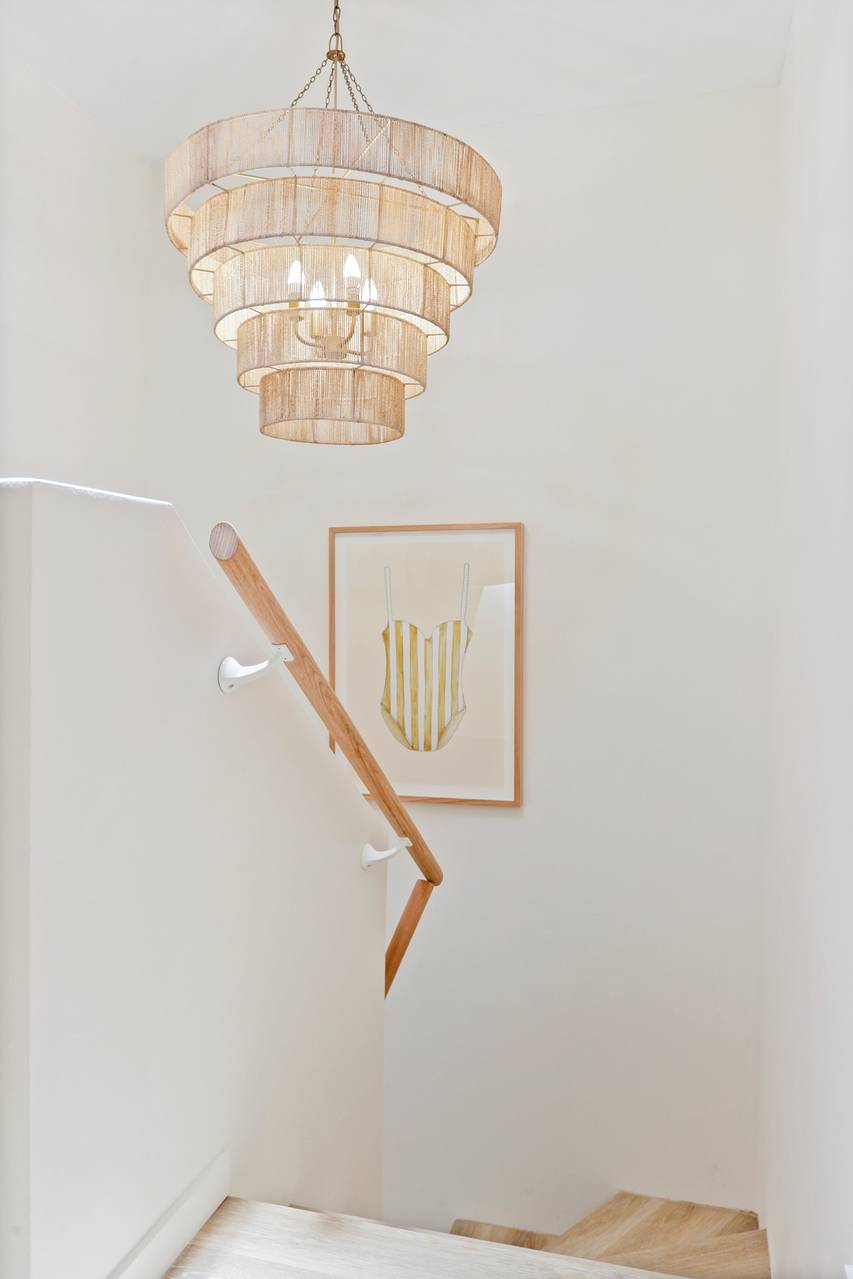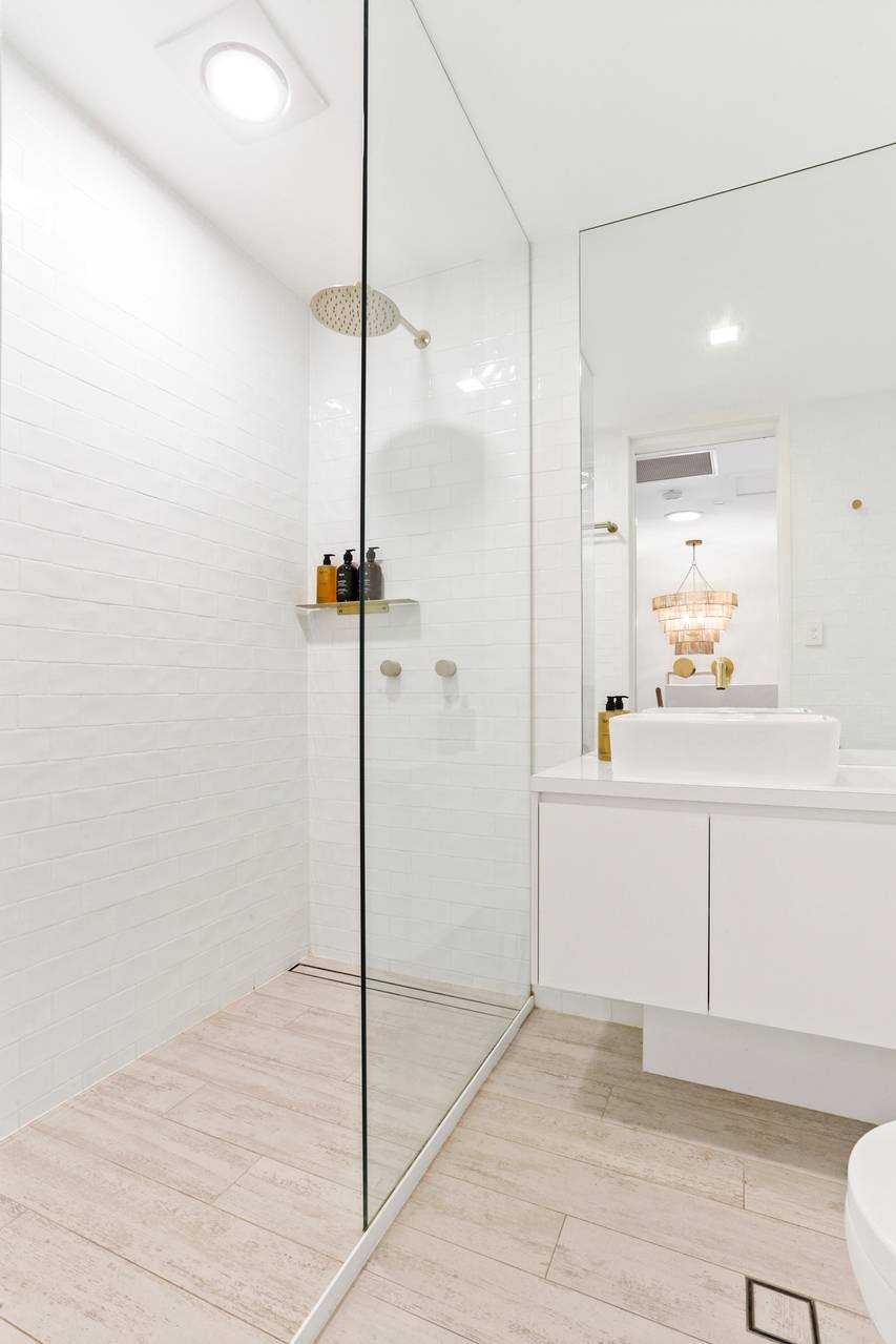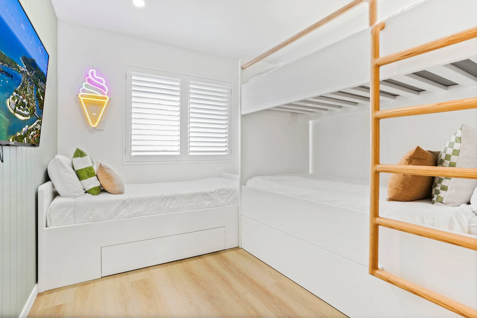 On the upper level are three generous-sized bedrooms, all featuring the pale timber flooring. On the north side, the generous master suite has a good sized covered balcony running the width of the townhome, a king sized bed and a walk-in robe and ensuite featuring a large dual person basin. Bedroom 2 has 3 bunk beds and features a pretty multi coloured fluoro icecream wall light, and the third has a queen sized bed. The two minor bedrooms have built-in robes and share a family-size bathroom which has high-gloss white wall tiles, gold tapware and 'lime-washed' floor tiles, as per the ensuite.