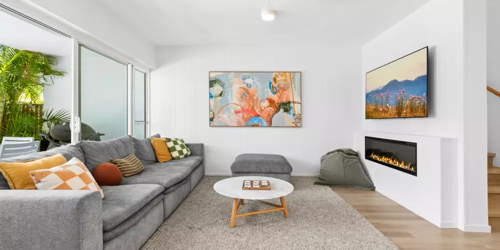 In an almost seamless fashion, outside morphs indoors, where pale timber floors and unique light fittings lend a decidedly chic aesthetic, to the bright and roomy open plan living, kitchen and dining spaces. Sink into the large soft grey faux suede lounge with ottoman and watch the cricket on the giant curved tv screen. A stylish gas fire is bliss on a cold day.