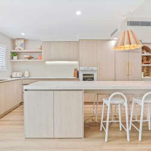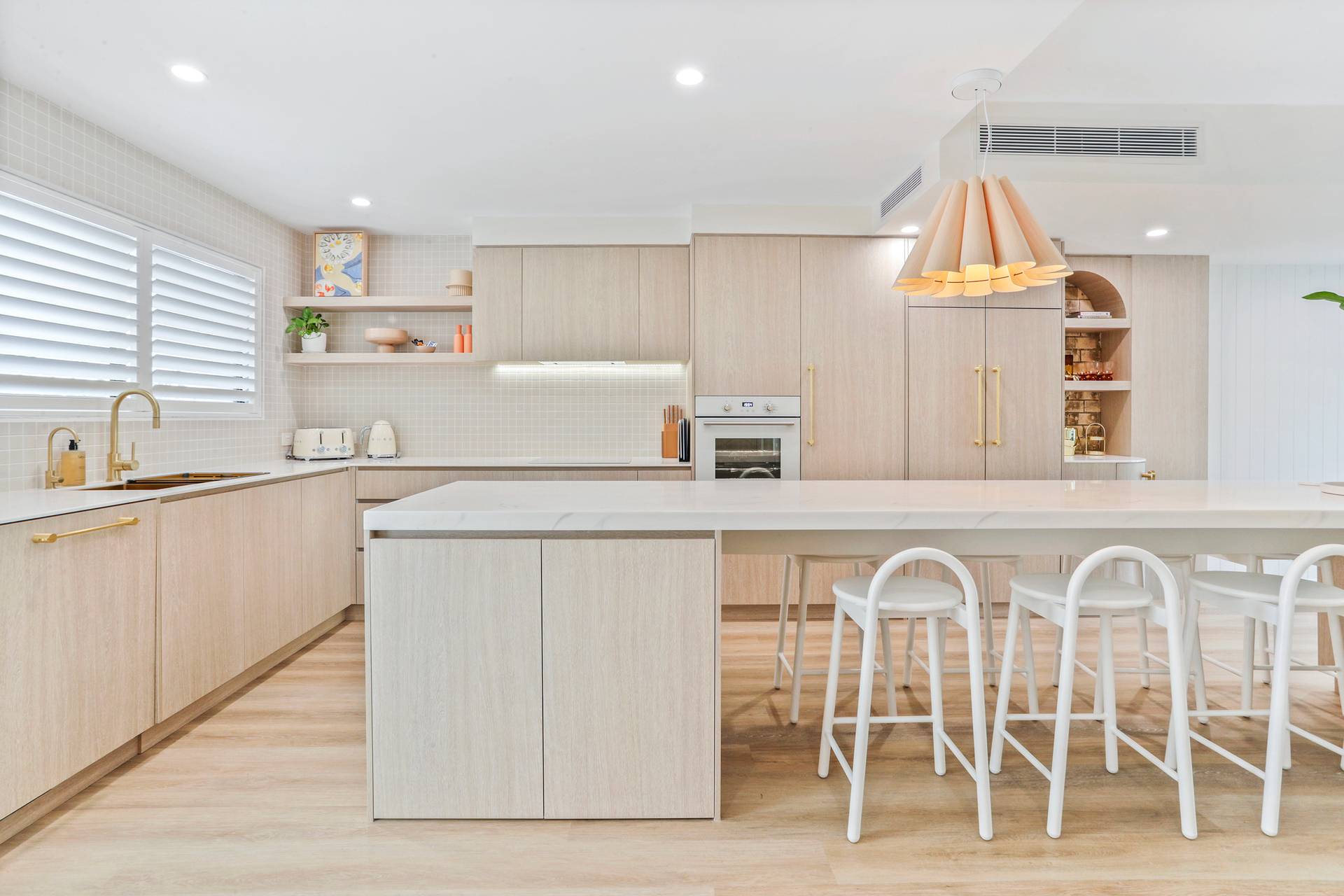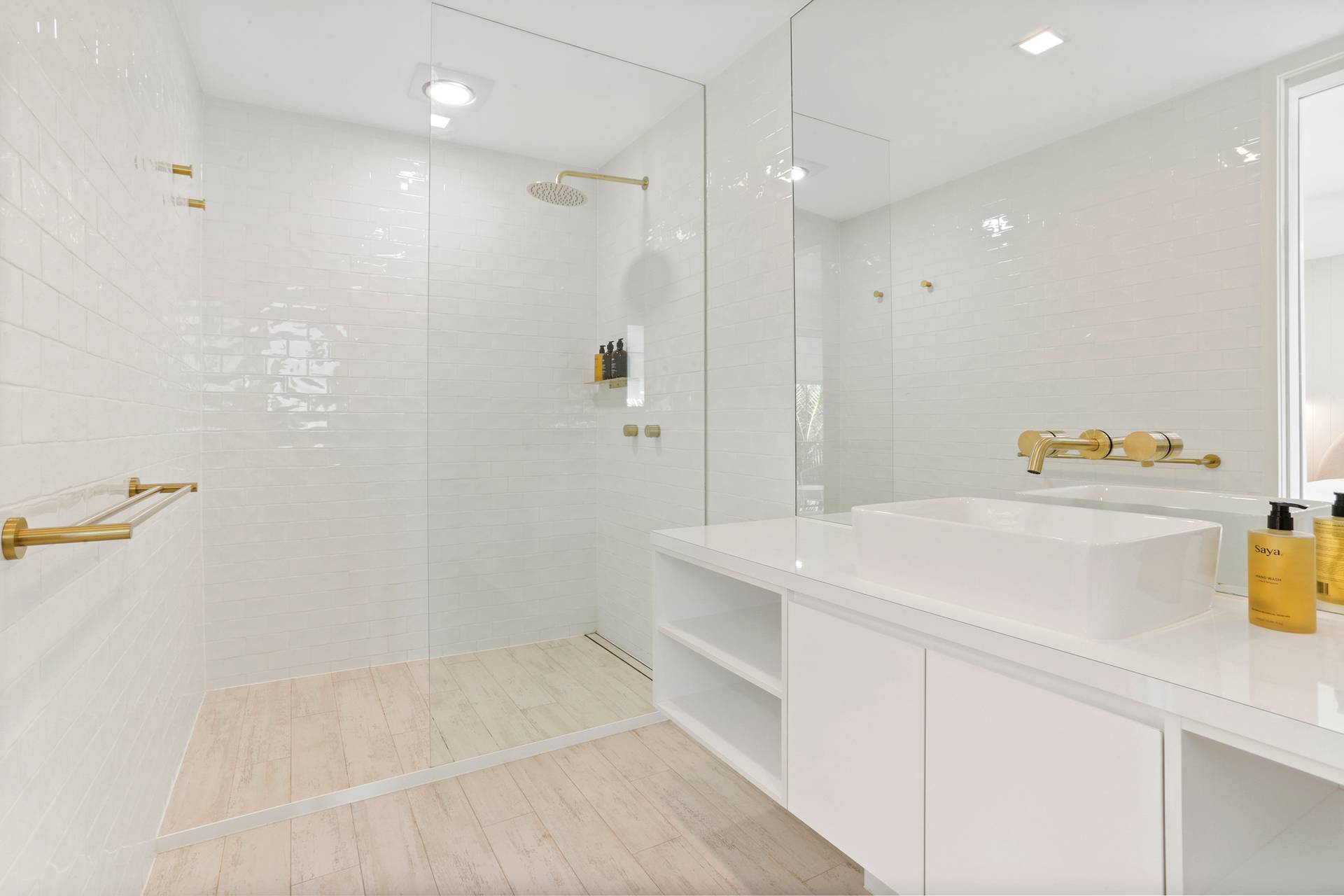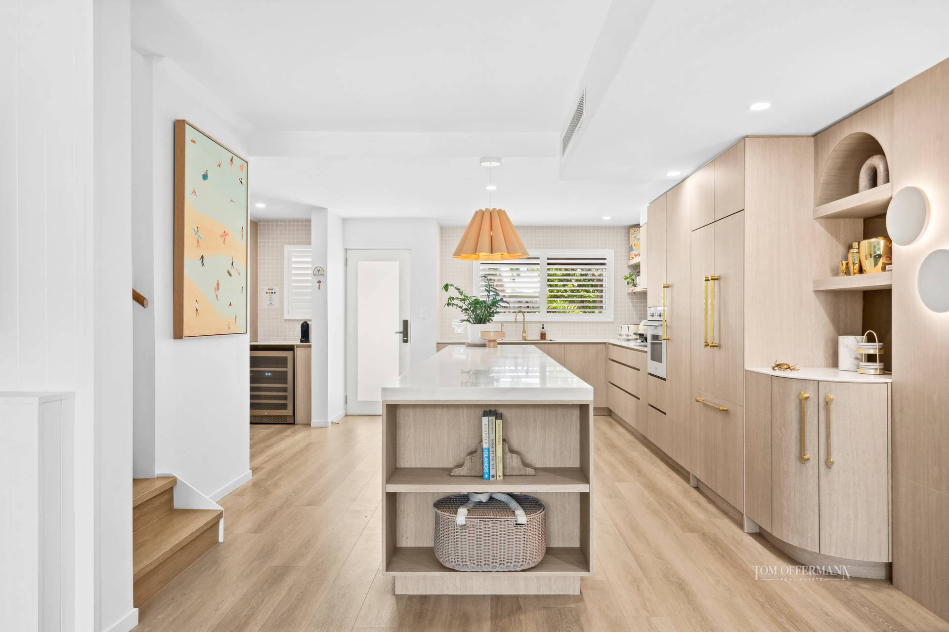 Glossy timber kitchen shutters, tiled splashback, gold sink, taps and door handles are very sophisticated. The refrigerator is integrated and there is storage galore,plus all the appliances and accoutrements necessary for breakfast or creating dinner under the stars. Every nook and cranny has been utilised for storage. Opposite the kitchen is an inbuilt wine frig, discreet laundry and more storage. A long bar table seats 8 for dining or drinks, freeing up the living area for more entertaining.