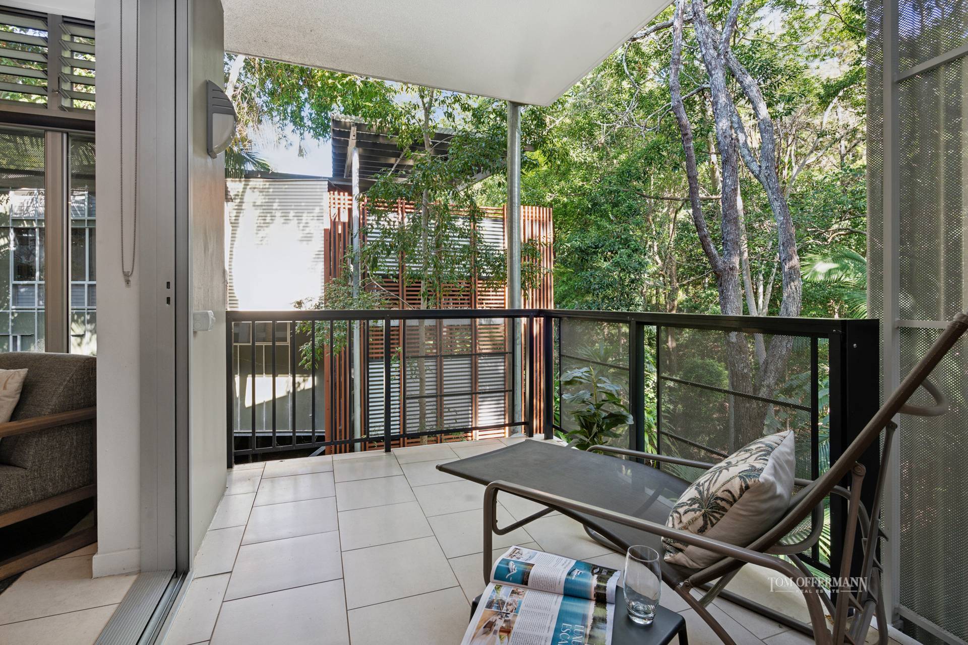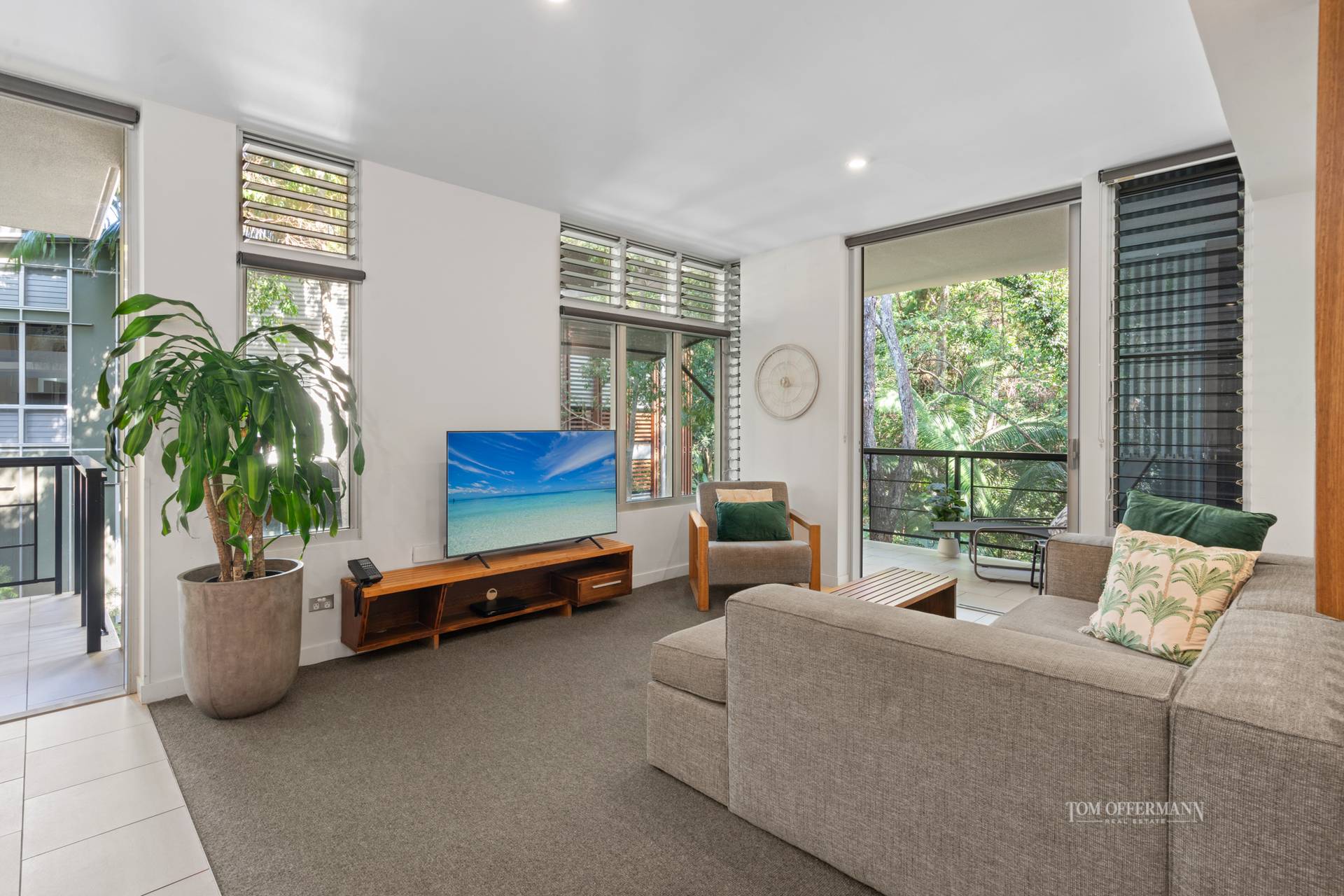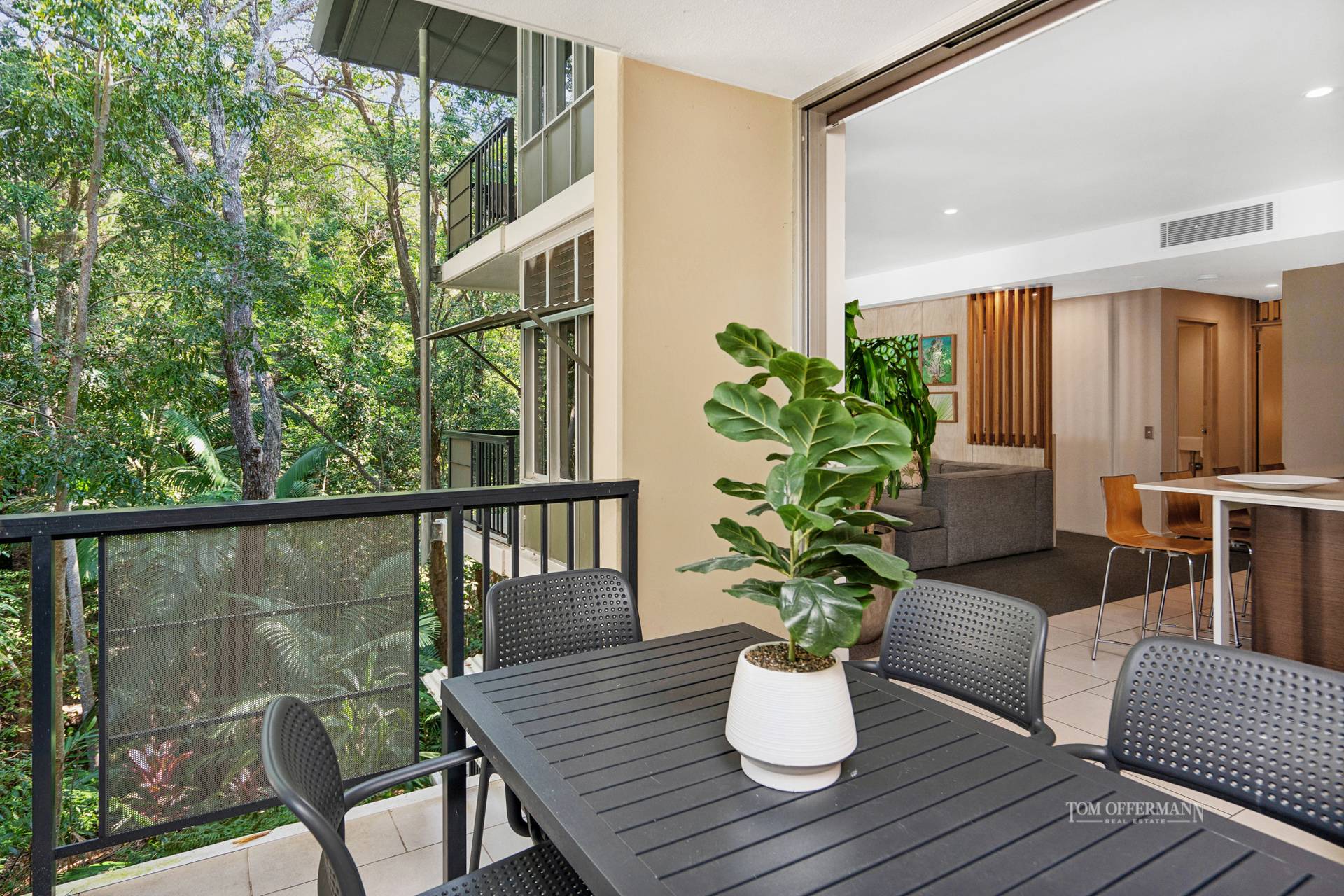 - About: lift from car park; second floor; private tranquil corner position; outlook over & into rainforest & babbling brook; recent refurbishment; high ceilings; louvres & timber features; aesthetic reflects exterior; banks of doors slide away to terrace w leisure furniture incl loungers; generous open plan carpeted living w natural-toned fabric modular lounge + armchair; timber coffee table & console w TV; accesses both terraces; artworks & accessories incl plants; 2-carpeted bedrooms w WIRs & white tiled ensuites – premier king accesses terrace; 2nd twin king singles; powder room; laundry w Fisher & Paykel washer & dryer; aircon/fans; single car space