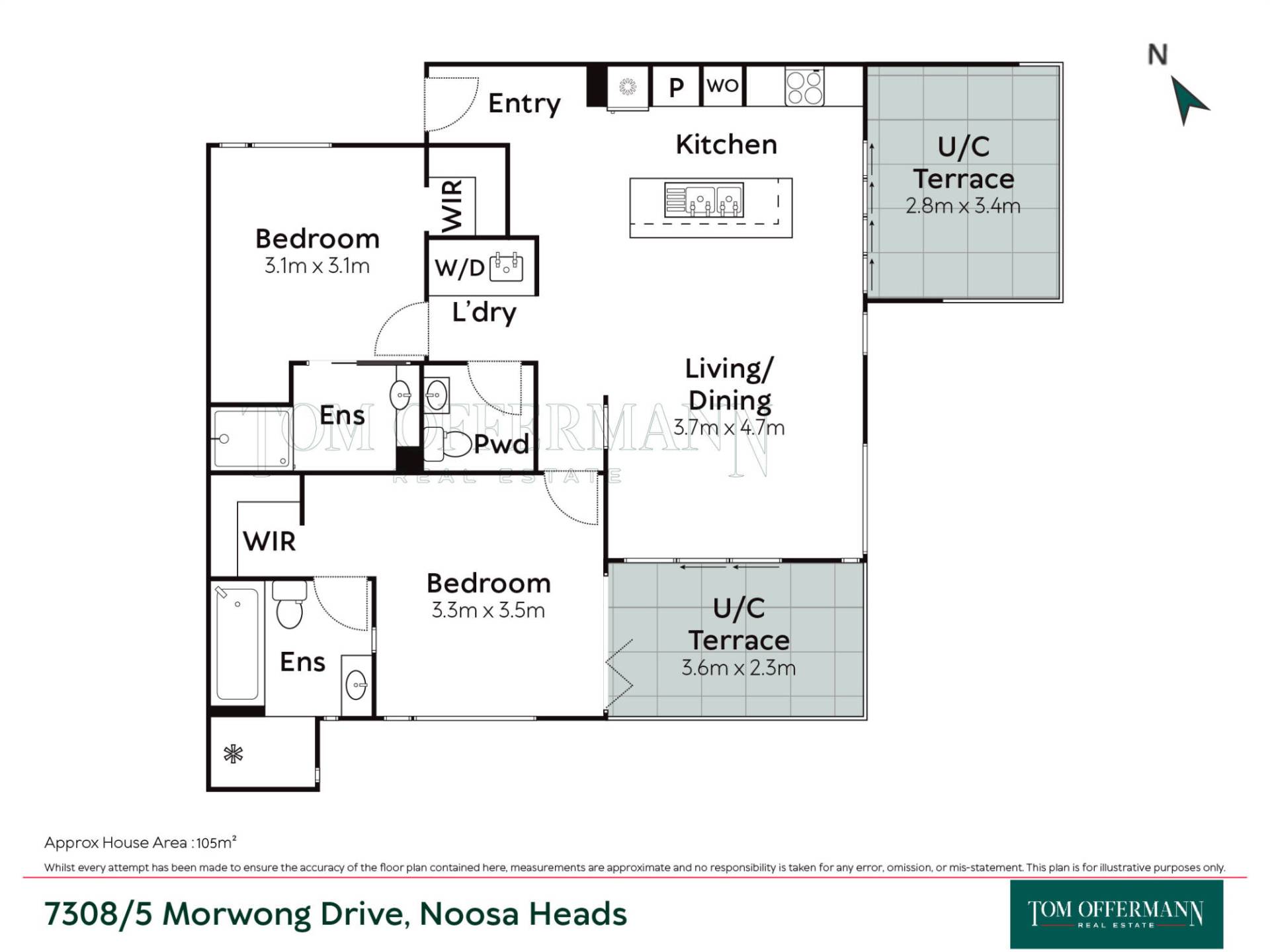 - Terraces: 3.6mx2.3m off living/dining & bedroom & 2.8mx3.4m off living/ding; both undercover