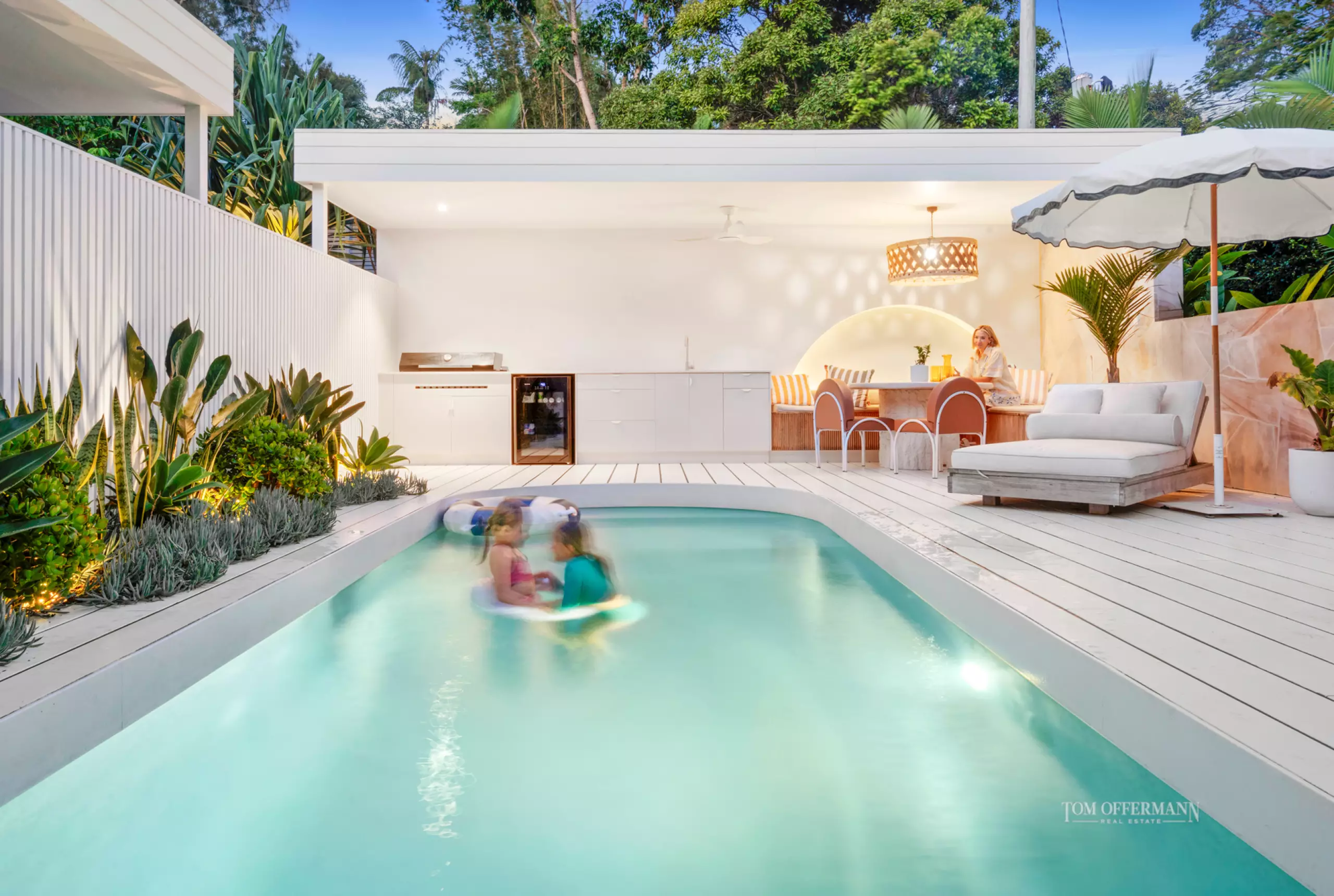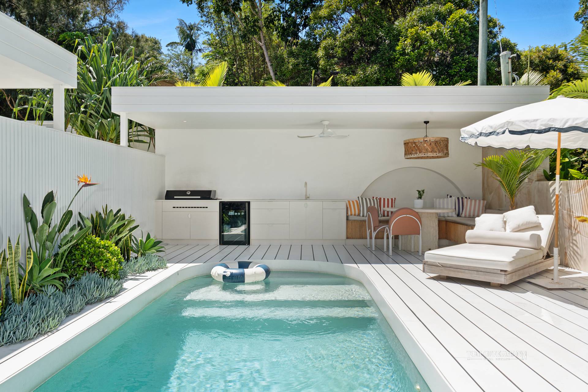 • Pool Area: North-facing 2.5mx7.6m heated w 6.8mx2.2m undercover white timber terraces & cabana w custom seating, outdoor kitchen, BBQ + 3mx8.3m sun terrace w outdoor shower