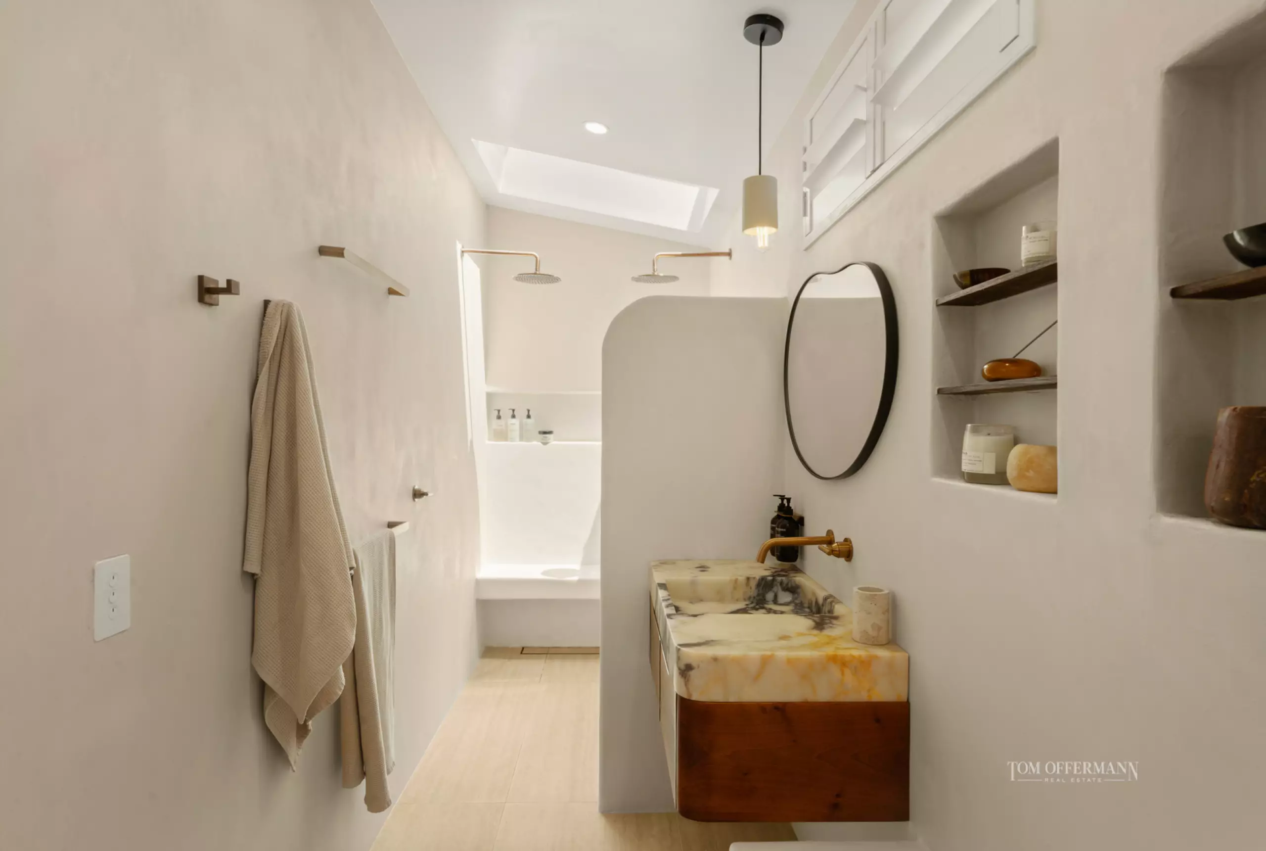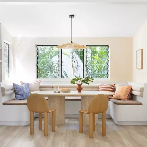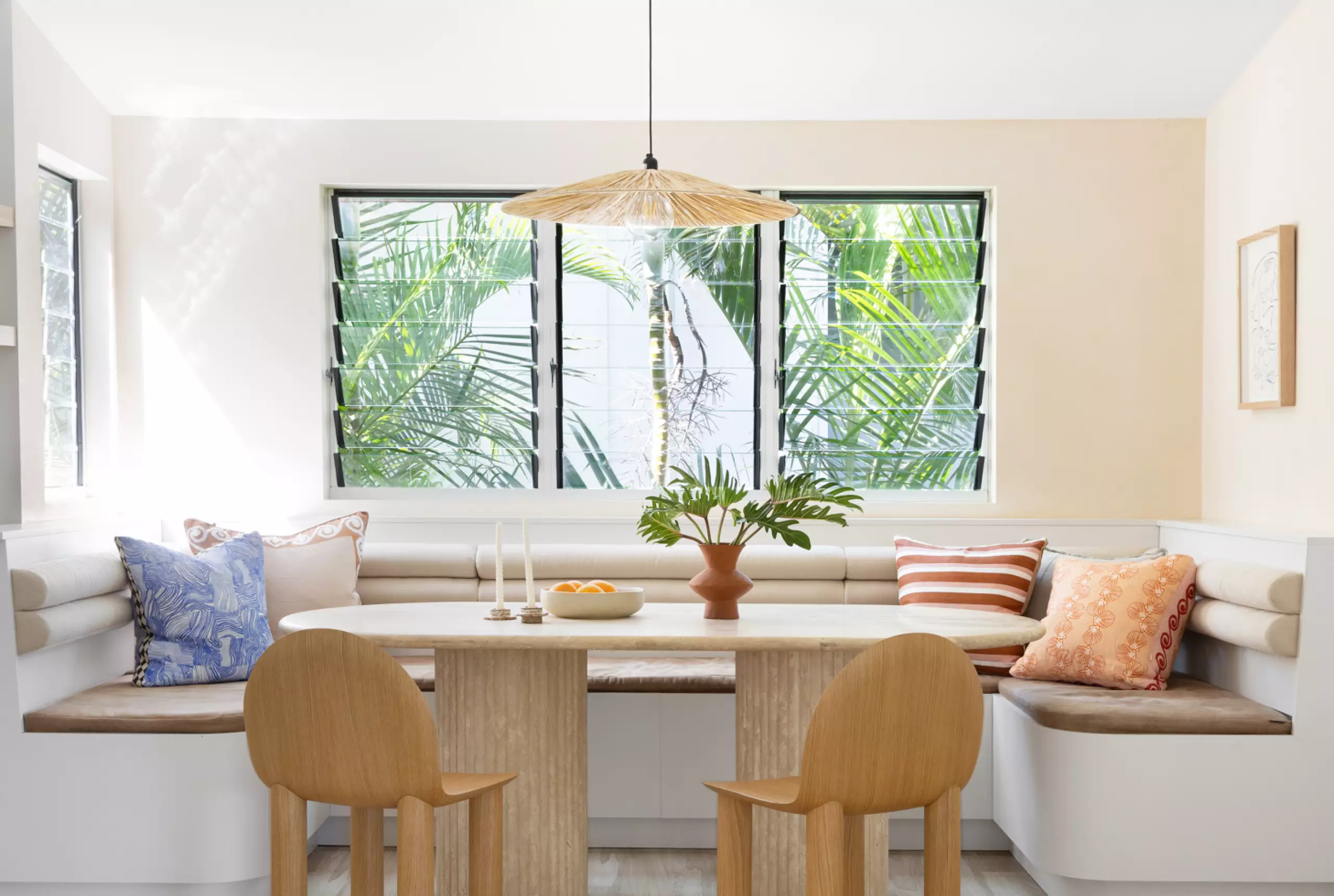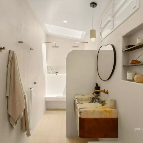 There are recurring elements throughout, such as archways, niches, features and specific furnishings, adding a soft organic feel. Eyes are quickly fixed on the custom designed leather and corduroy-backed banquette, also the complementary oak chairs around the stunning oval gold rosetta travertine table, adorned with a designer Panama raffia pendant.