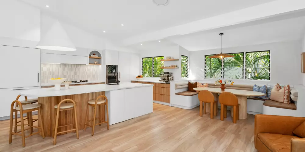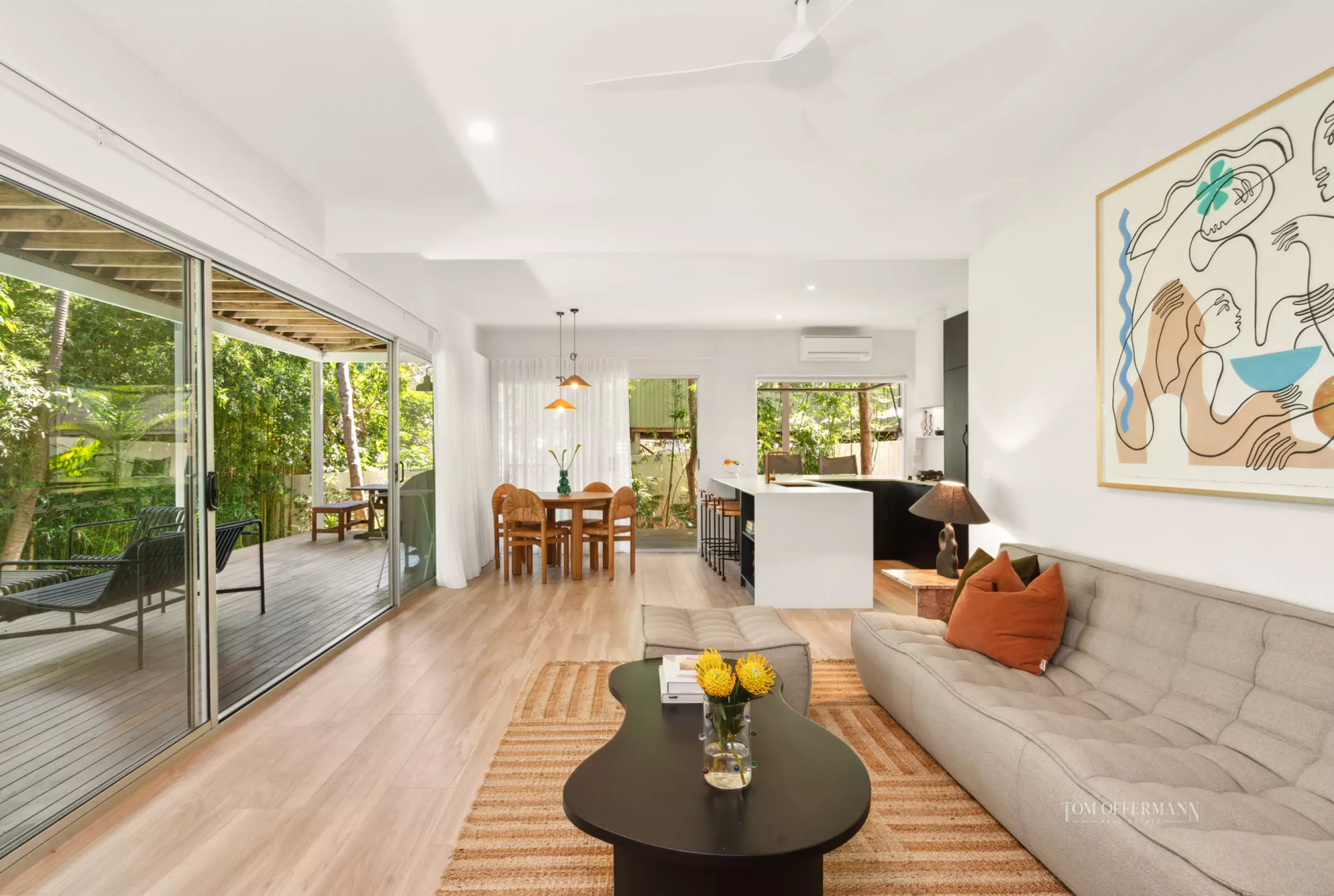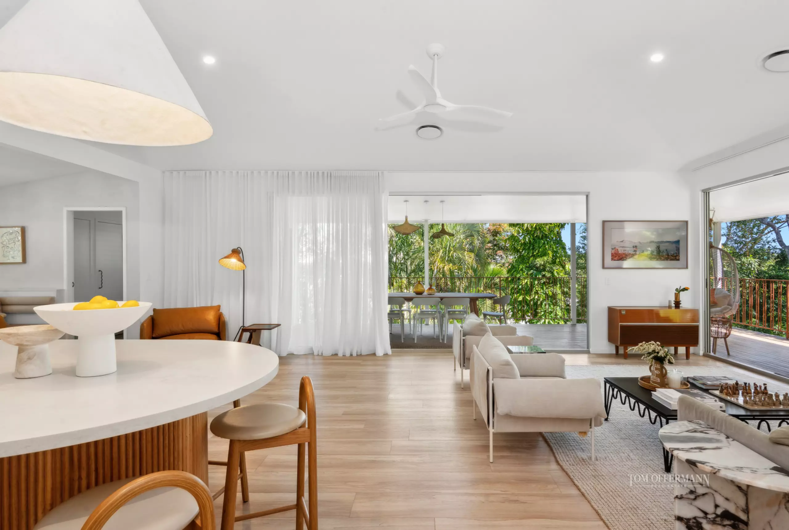 Come inside. It's easy-breezy, warm and inviting, a little unexpected until at the top of the stairs, when it's a definitive wow moment. Admire how doors on the west and south side of the expansive living area, seeming almost disappear and bright natural light invites itself in from the undercover terraces, and dances shadow-like over the timber flooring.
