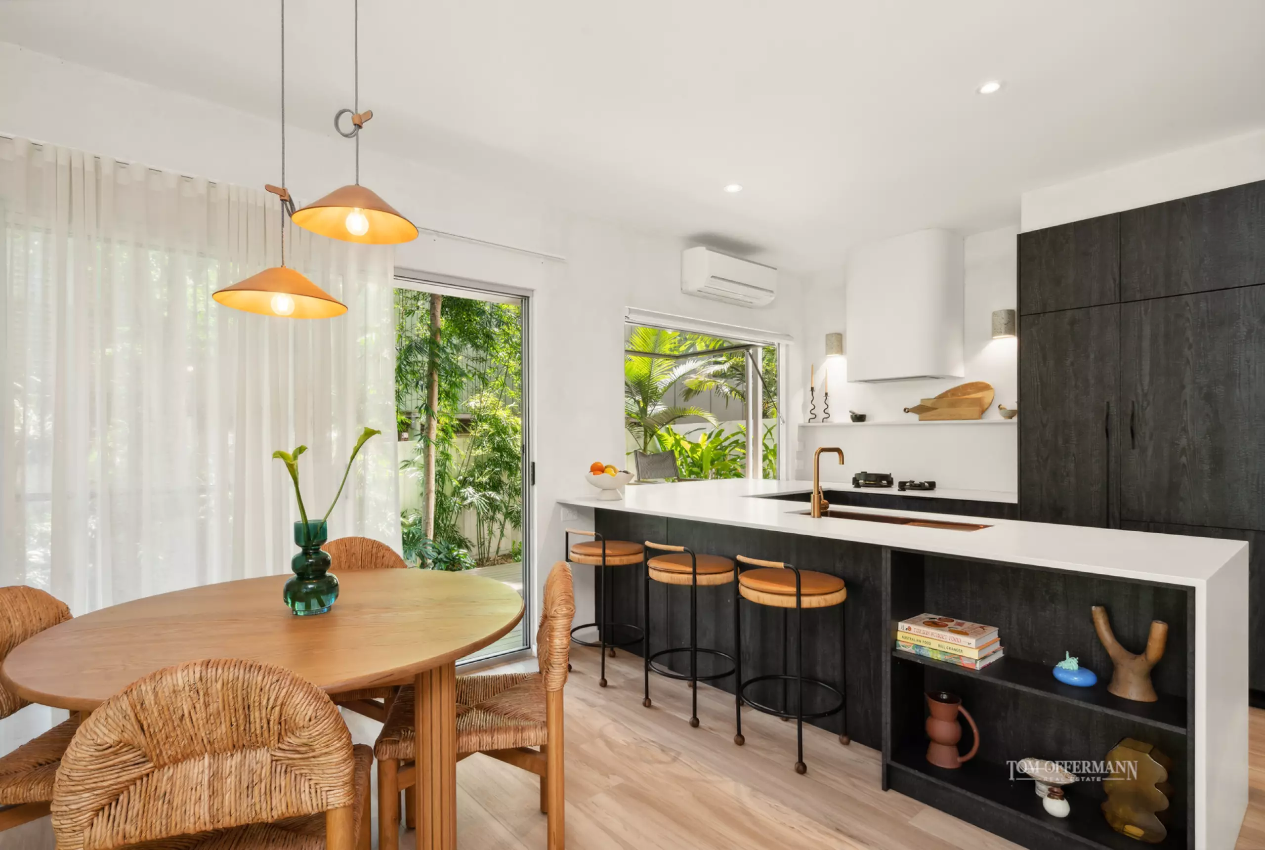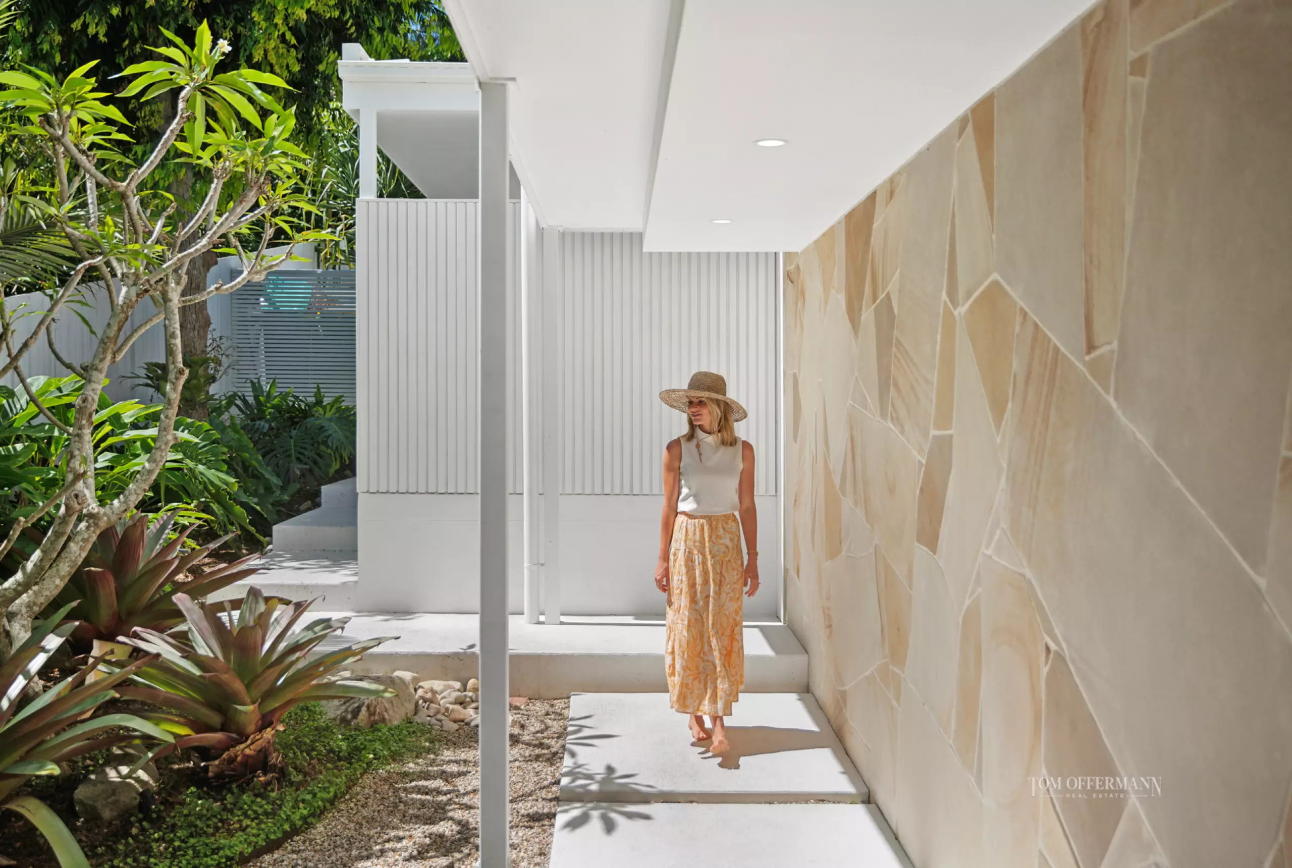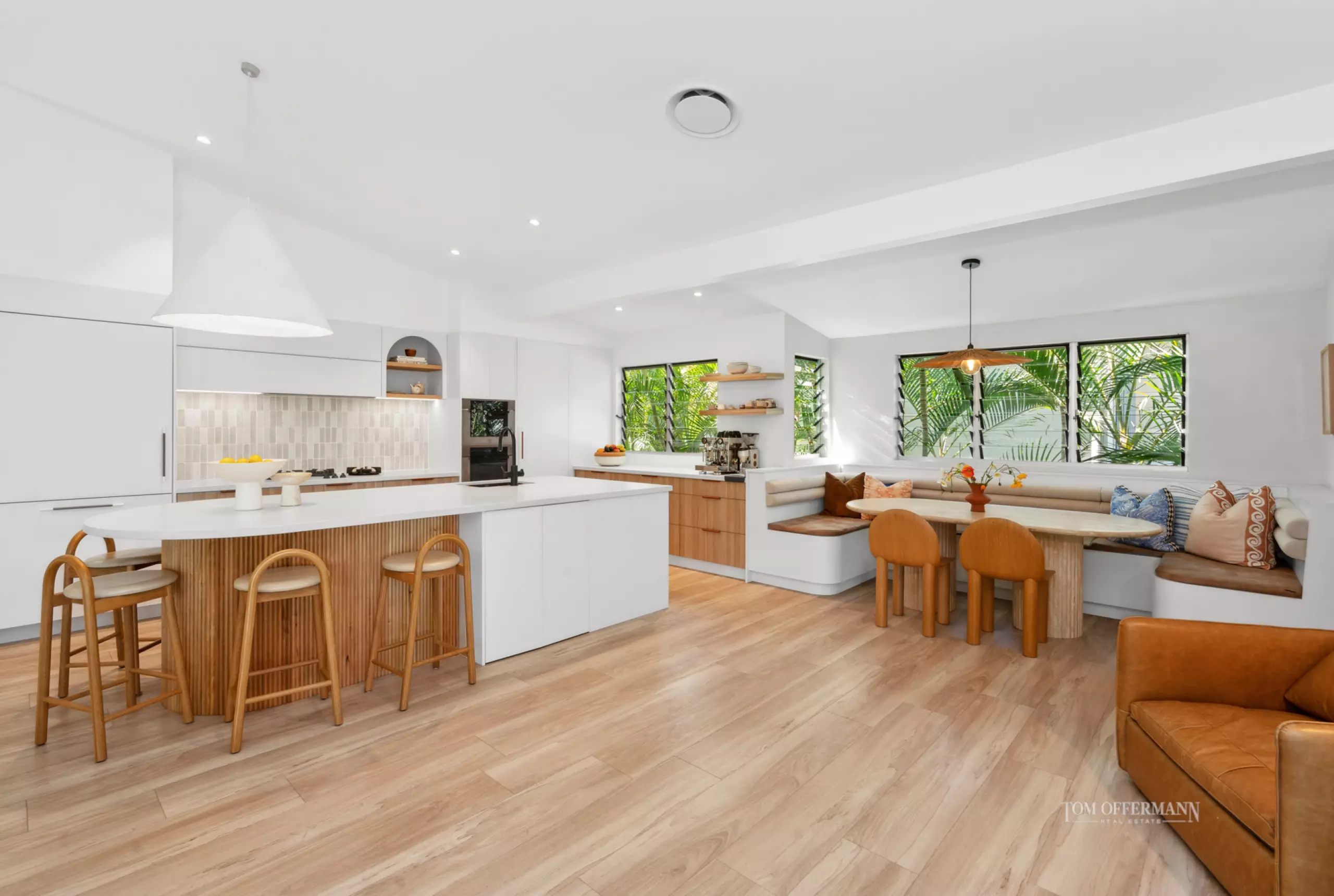 Come inside. It's easy-breezy, warm and inviting, a little unexpected until at the top of the stairs, when it's a definitive wow moment. Admire how doors on the west and south side of the expansive living area, seeming almost disappear and bright natural light invites itself in from the undercover terraces, and dances shadow-like over the timber flooring.