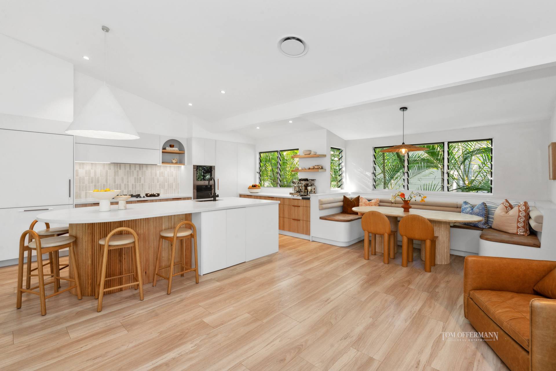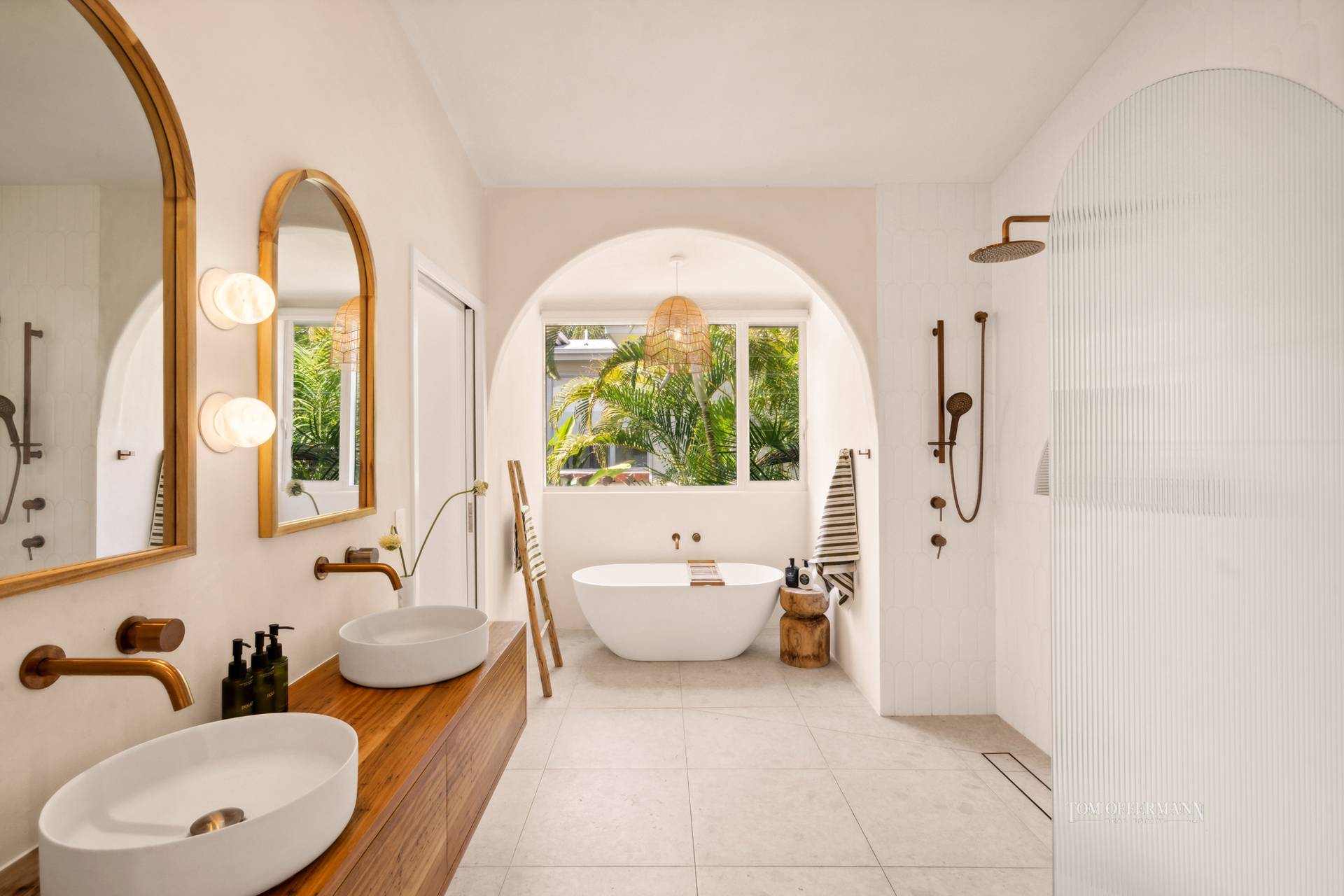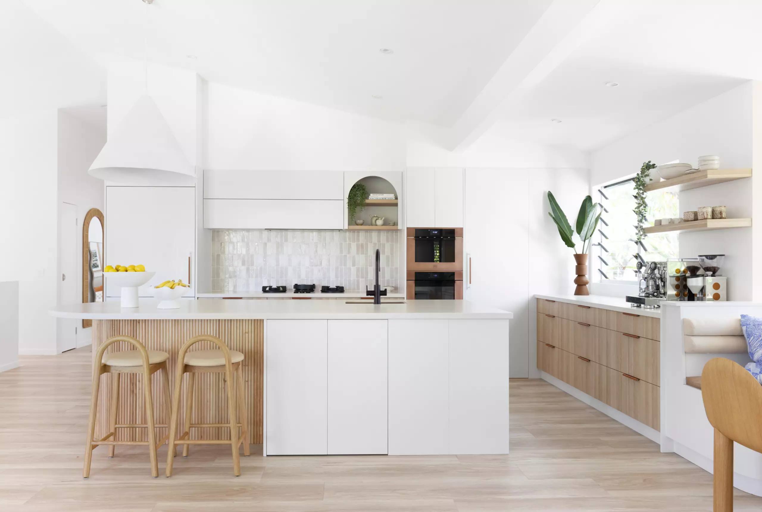 Although the palette overall is neutral, textures also create interest, such as the kitchen with its creamy stone-topped black and fluted natural oak timber cabinetry including curved island breakfast bar, leather cabinet pulls and handmade Bijmat Moroccan splashback tiles. Ultra-premium appliances include integrated Pitt gas burners, Bertazzoni copper finish ovens, Fisher & Paykel dish drawers and a fridge/freezer, also a Zip tap and a walk-in pantry/appliance store.