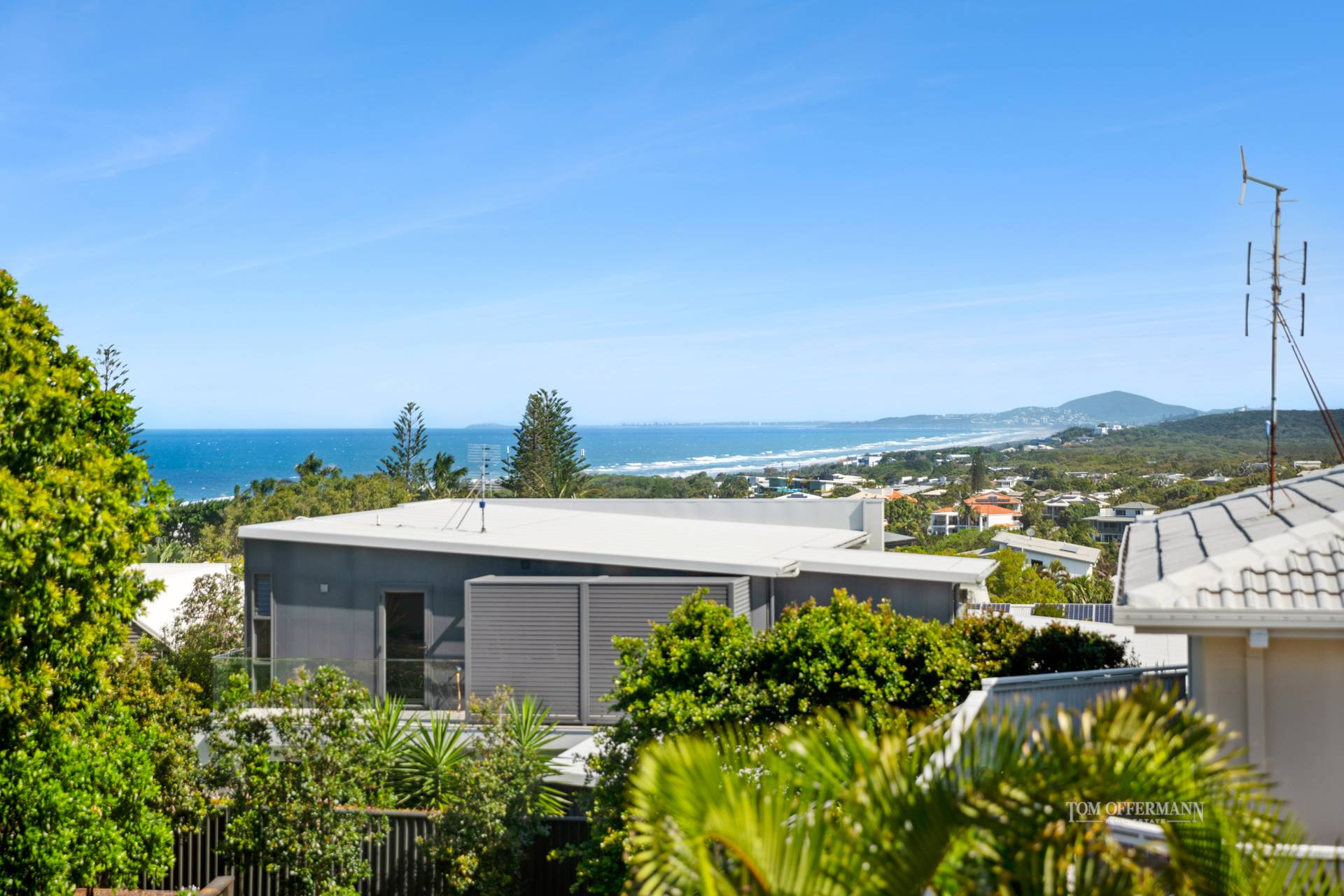 Come inside and head up the stairs to the expansive open plan living and dining areas with lime-washed timber-look flooring. Look ahead to full height windows with peeks of the Coral Sea and on the right, open the plantation shutters to extend the view from Sunrise Beach to Mooloolaba and Point Cartwright, then sweep west across the National Park, Hinterland and backdrop of Mt Cooroy. Similarly, from the undercover cover terrace on the north side, where it's also one of several options for entertaining, and naturally sundowners.