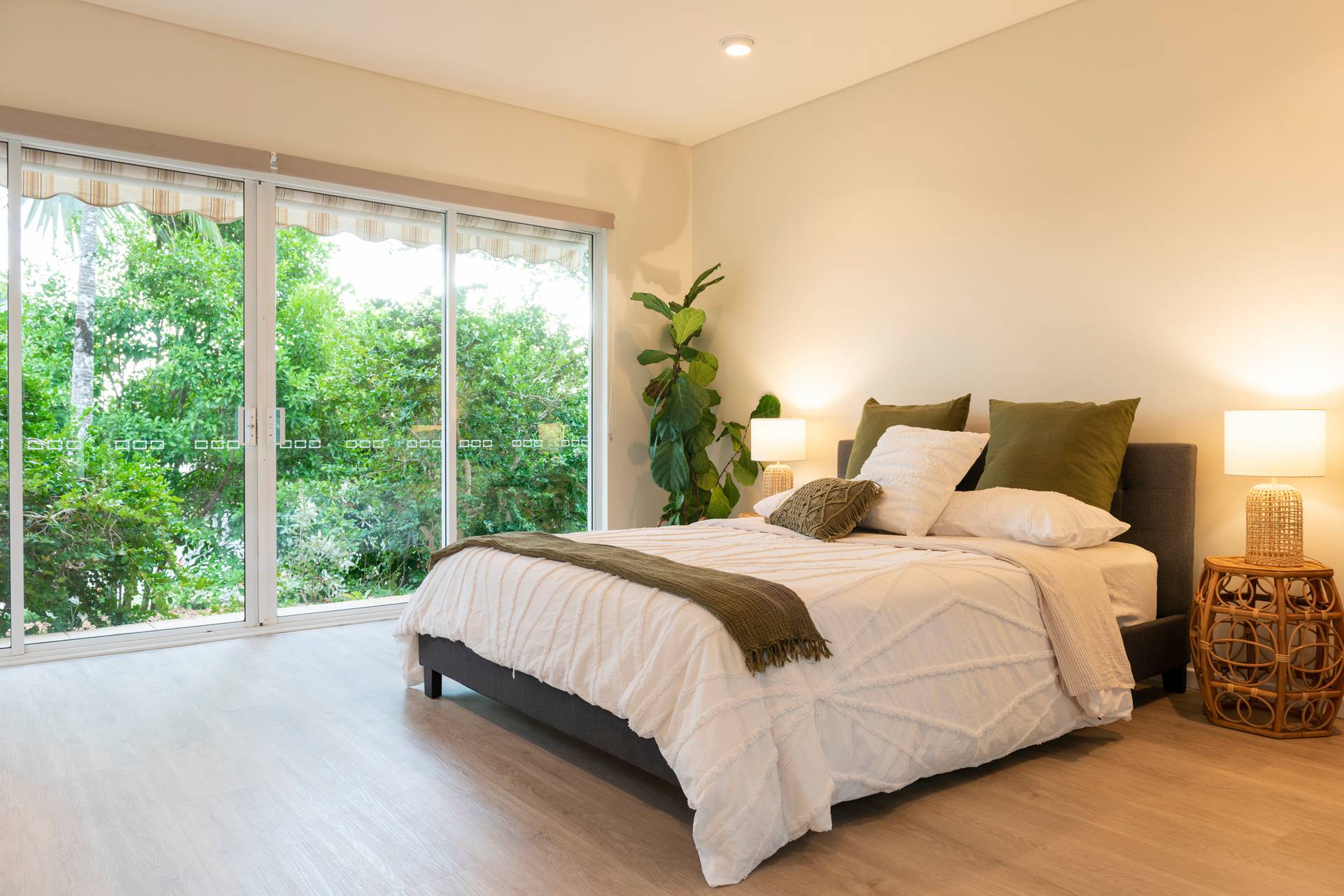 There are four bedrooms. On the upper level along the hallway, the premier suite has hinterland views, a walk-in robe and ensuite/bathrooms shared by the second bedroom, which has an undercover terrace with ocean views. On the ground level are two bedrooms with built-in robes and a share bathroom. The larger one has access to the rear garden.