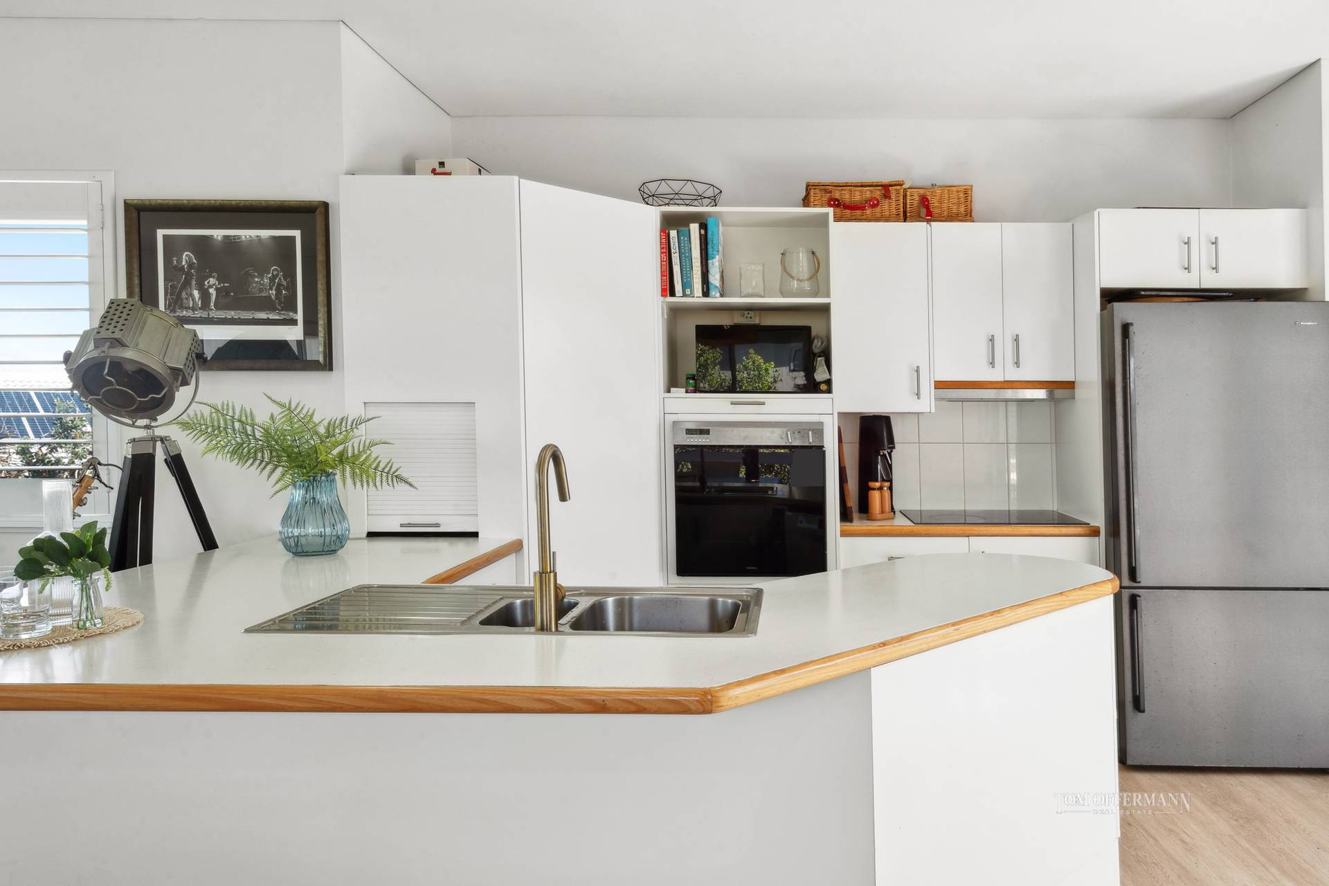 • Kitchen: C-shape timber edged laminated topped 2 pac cabinetry;