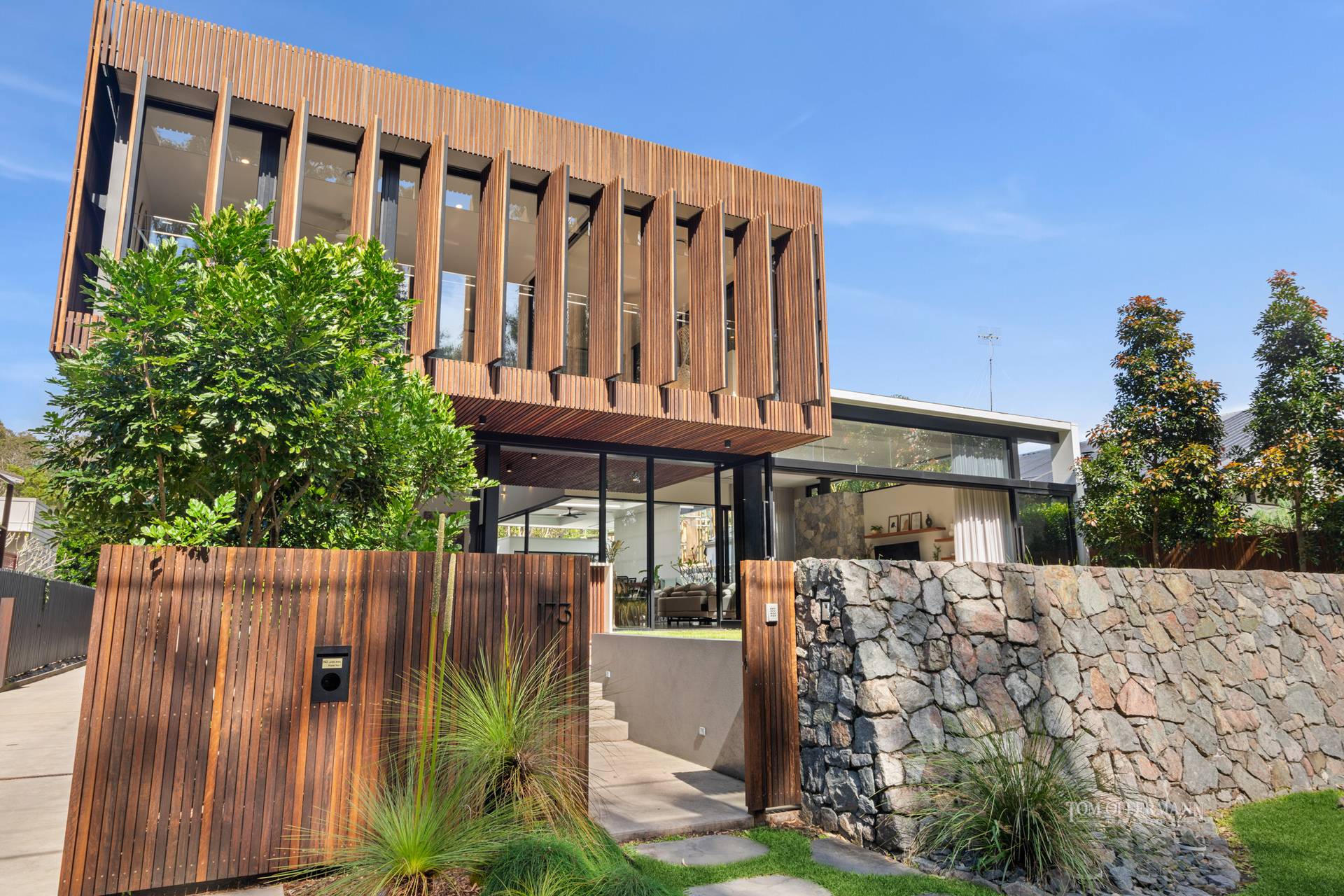 Polished concrete flooring, Australian Hardwood detailing, and wall to wall glass make the expansive main living zone an inviting place to gather with family and friends around the wood burning fireplace. The showstopping kitchen makes preparing meals a delight with premium appliances, 5 burner gas stove, Blackbutt veneer cabinetry, Clean Touch Satin 2 pac finish drawers, bar fridge, double ovens, butler's pantry, and a stone waterfall island bench with seating.