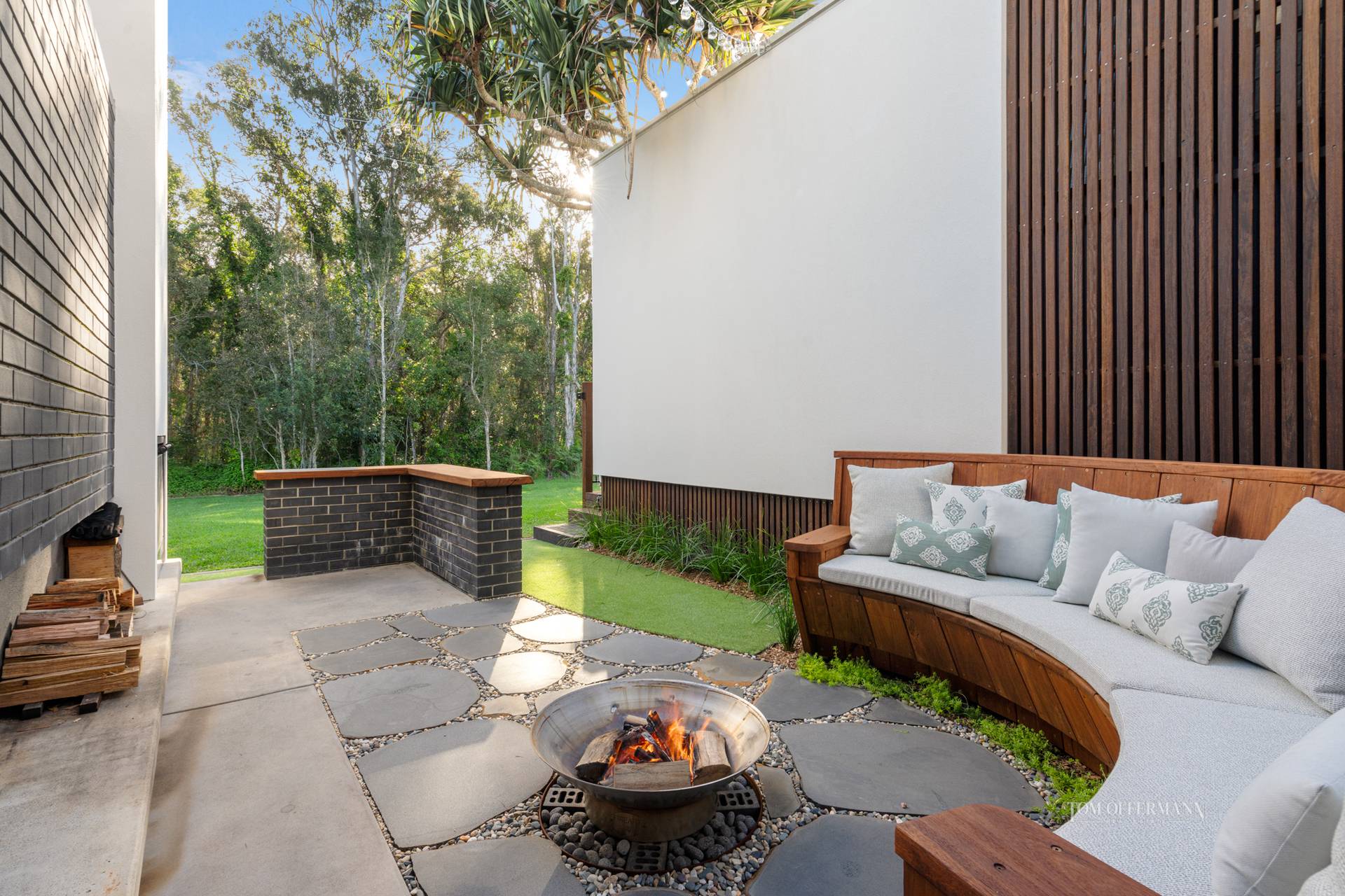 • Terraces: Outdoor kitchen with built in barbeque, sink and bar fridge – stone benchtops and weather proof cabinetry; fully automated Vergola over entertaining area; second rear outdoor entertaining area overlooking the Noosa National Park with fire pit (included in sale); fire box including a smoker that cooks like a big outdoor oven; a custom designed hardwood curved timber seat