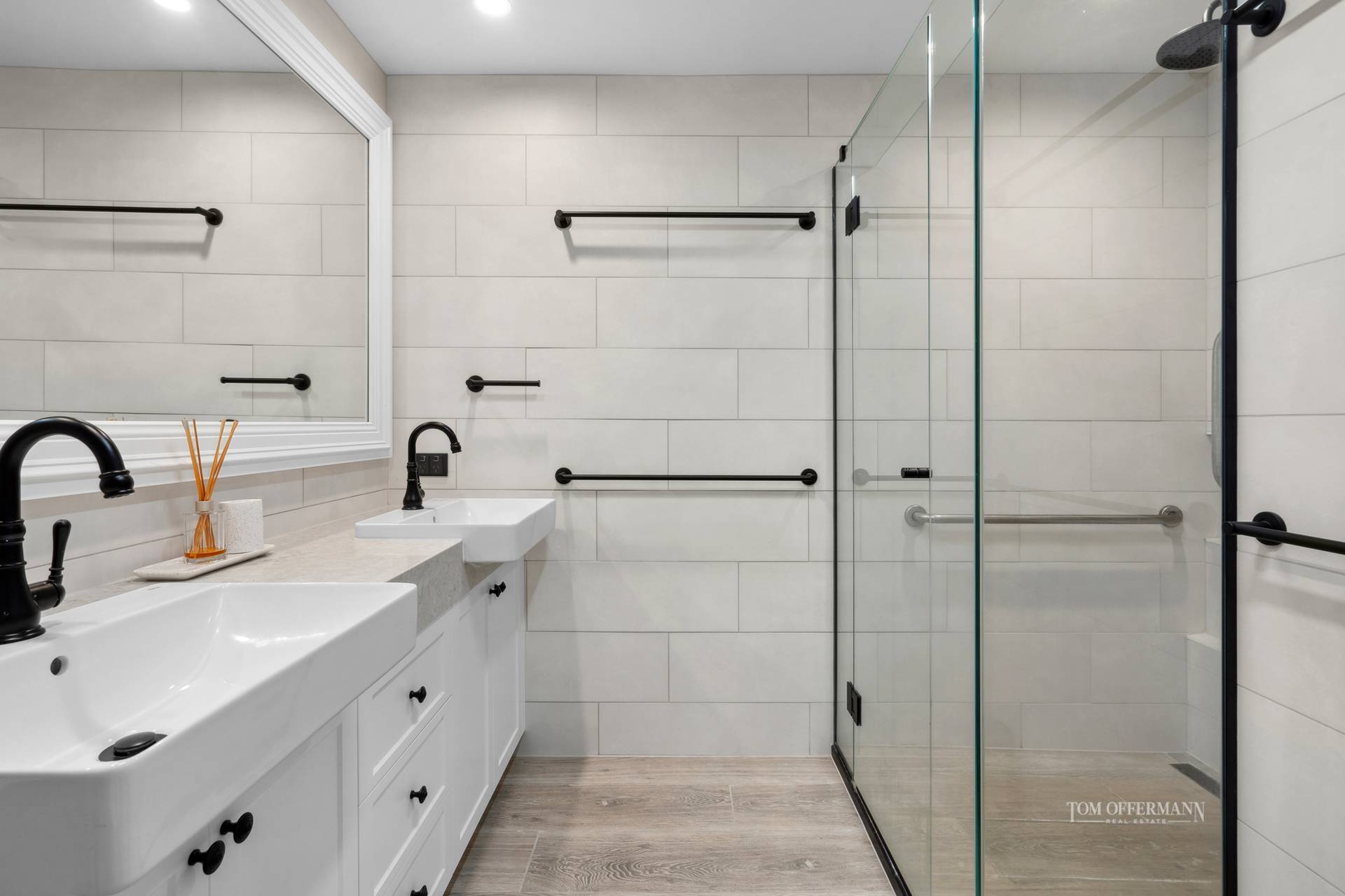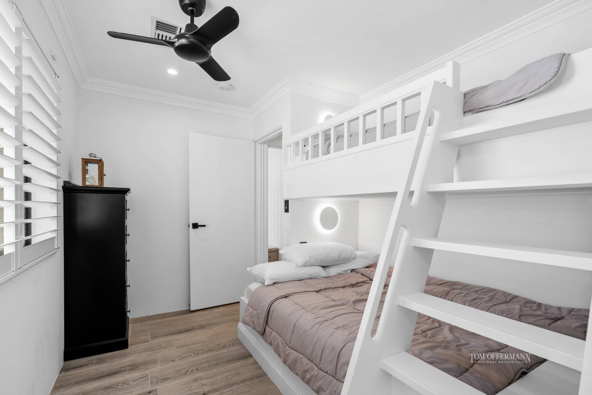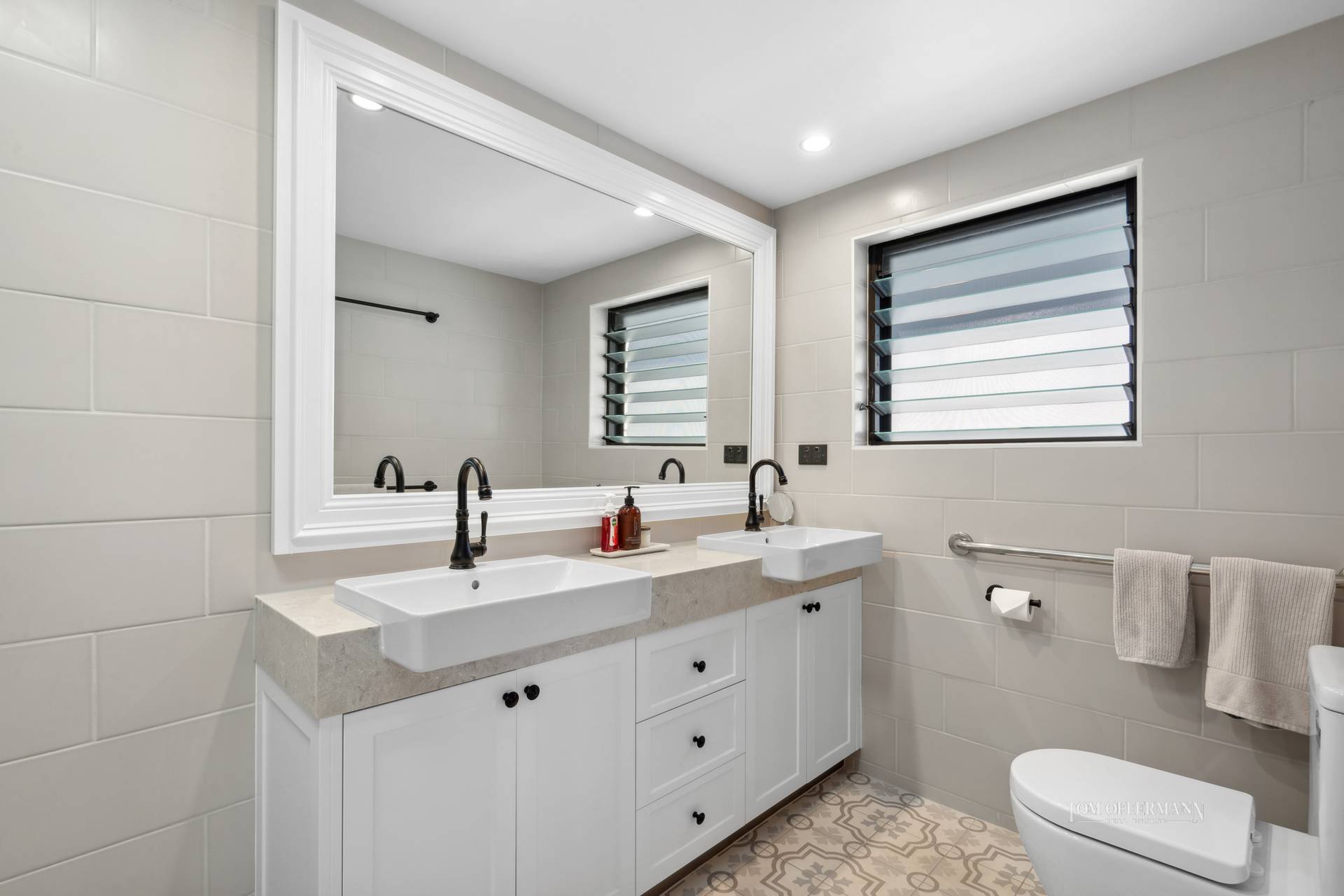 Along the hallway are two large bedrooms, a purpose-built queen size bunk room, a share bathroom similarly styled with mirror above the stone-topped two basin cabinetry, and a powder room.