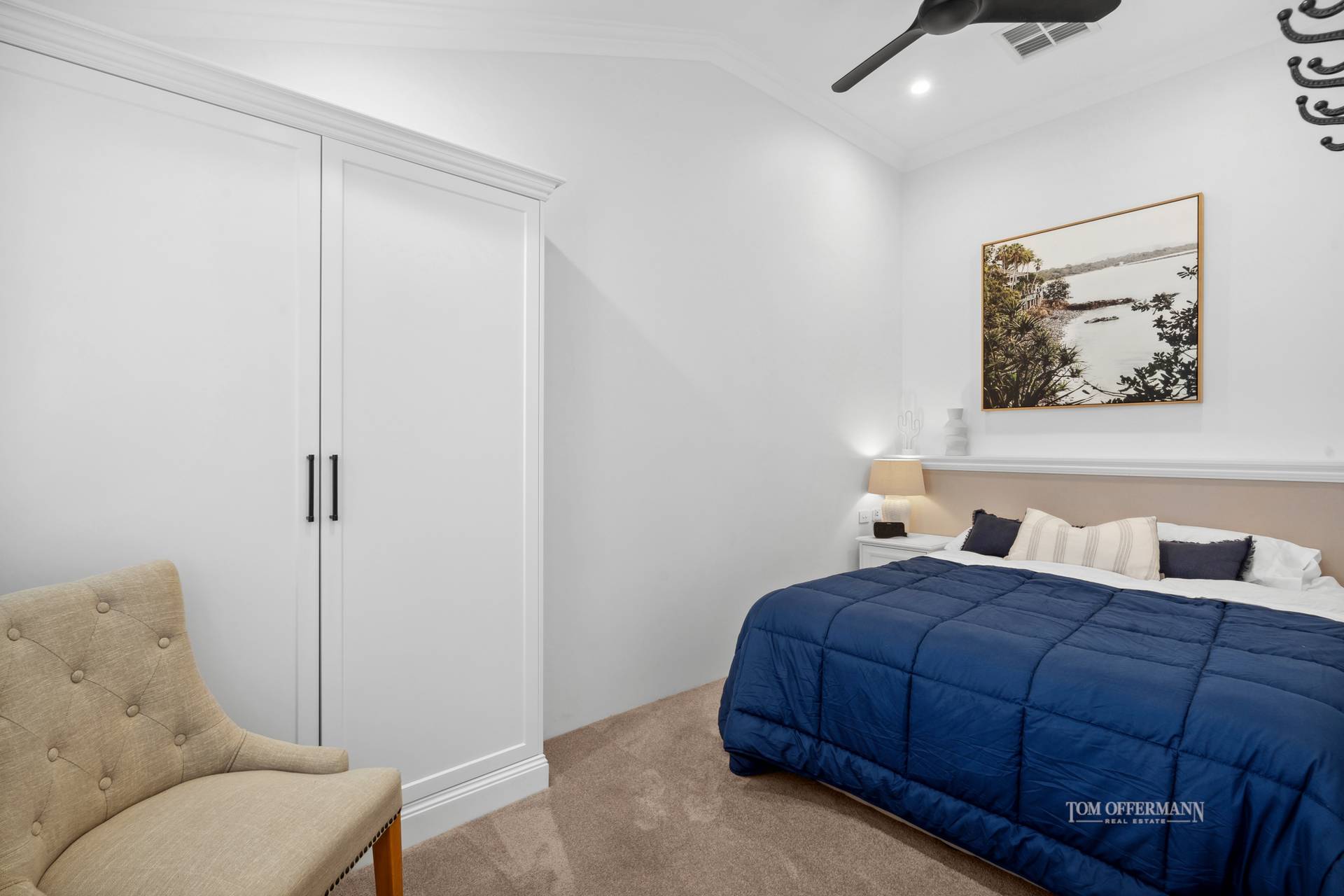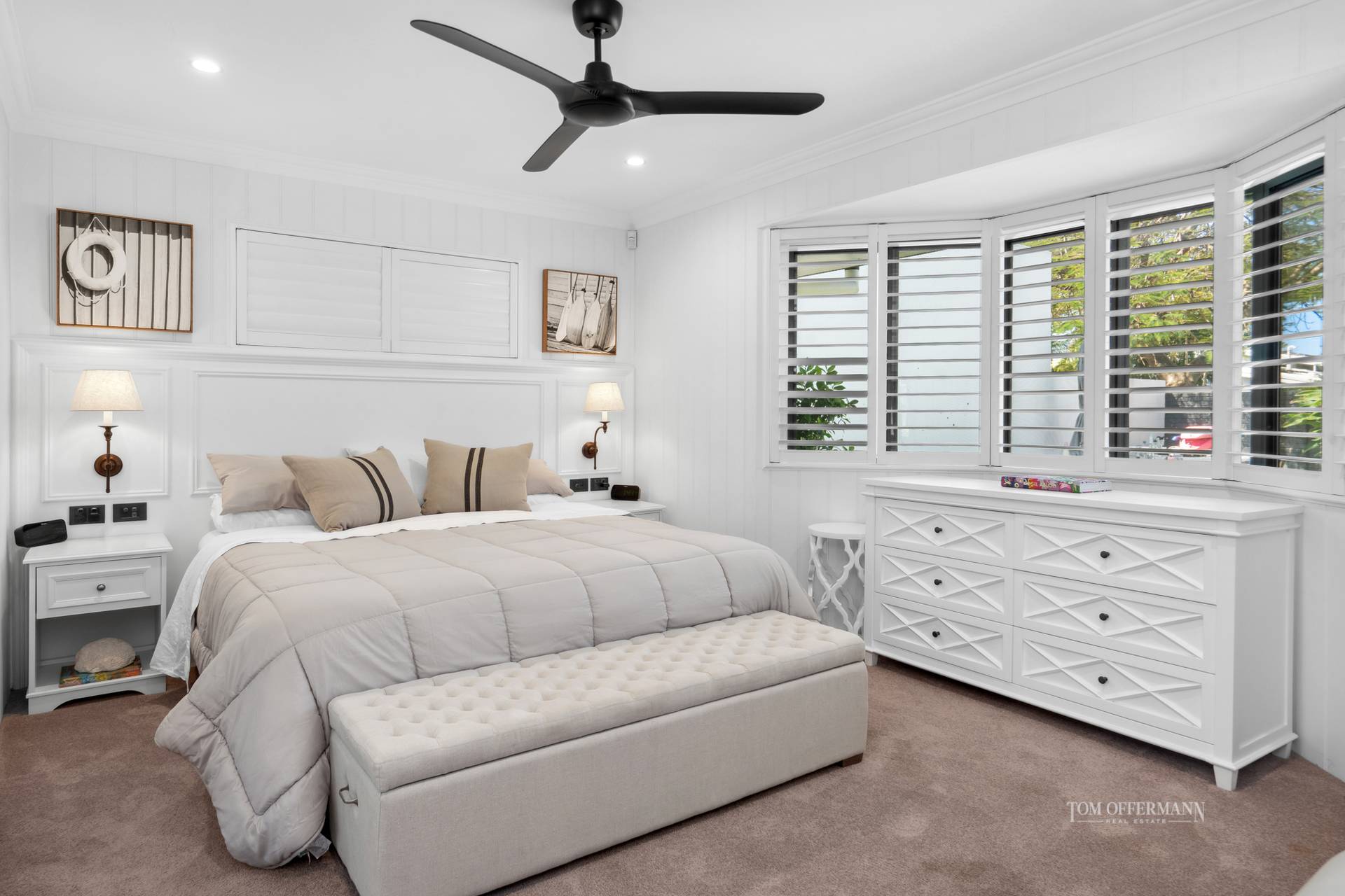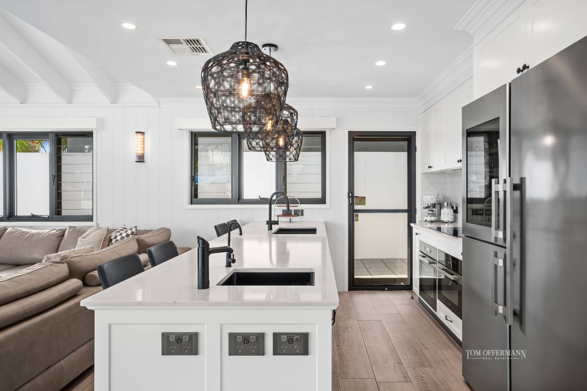 • About: entry glass door, monochromatic palette; nautical artworks & accessories; raked ceiling; washed timber look plank tiles; VJ walls, shutters, entry pendant; Crimsafe windows & doors; custom lighting w stainless steel central switching panel; internal and external auto blinds & aluminium shutters to all windows & doors; fans/commercial grade ducted air; white-tiled laundry room w Miele washer & dryer; access to drying area + garage; intercom system & security alarm; separate owner lock-up storage w large garage attic storage. Clean land parcel, no easements.