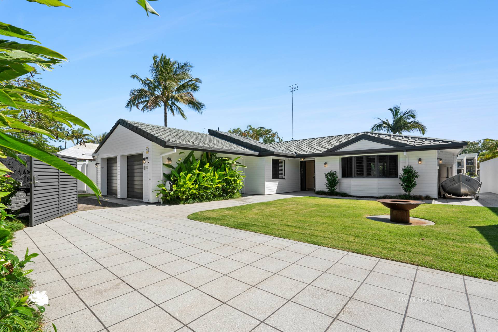 From the leafy streetscape in a quiet cul-de-sac accented by a mature Pandanus, open the gate into the extensive front garden with central lawned area, boat space and ramp on the side, plus plenty of space elsewhere for more water toys.