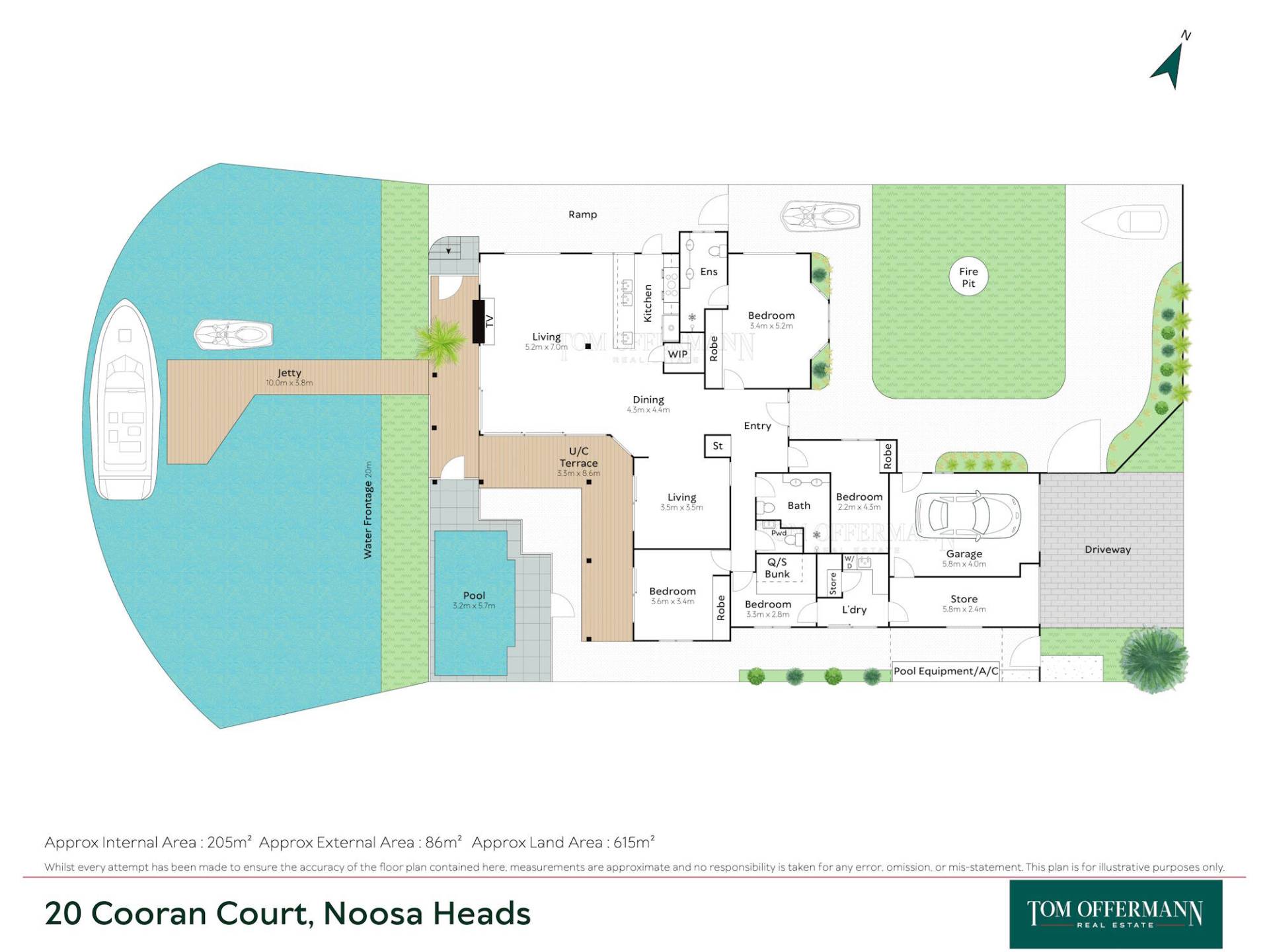 • Land Area: 615m2 Waterfrontage/Jetty/Pontoon: 20m w crystal clear tidal white sand beach; wide canal & end of cul de sac; 50m lawn area; 10mx3.8m jetty; pontoon 2 x floating jet ski docks