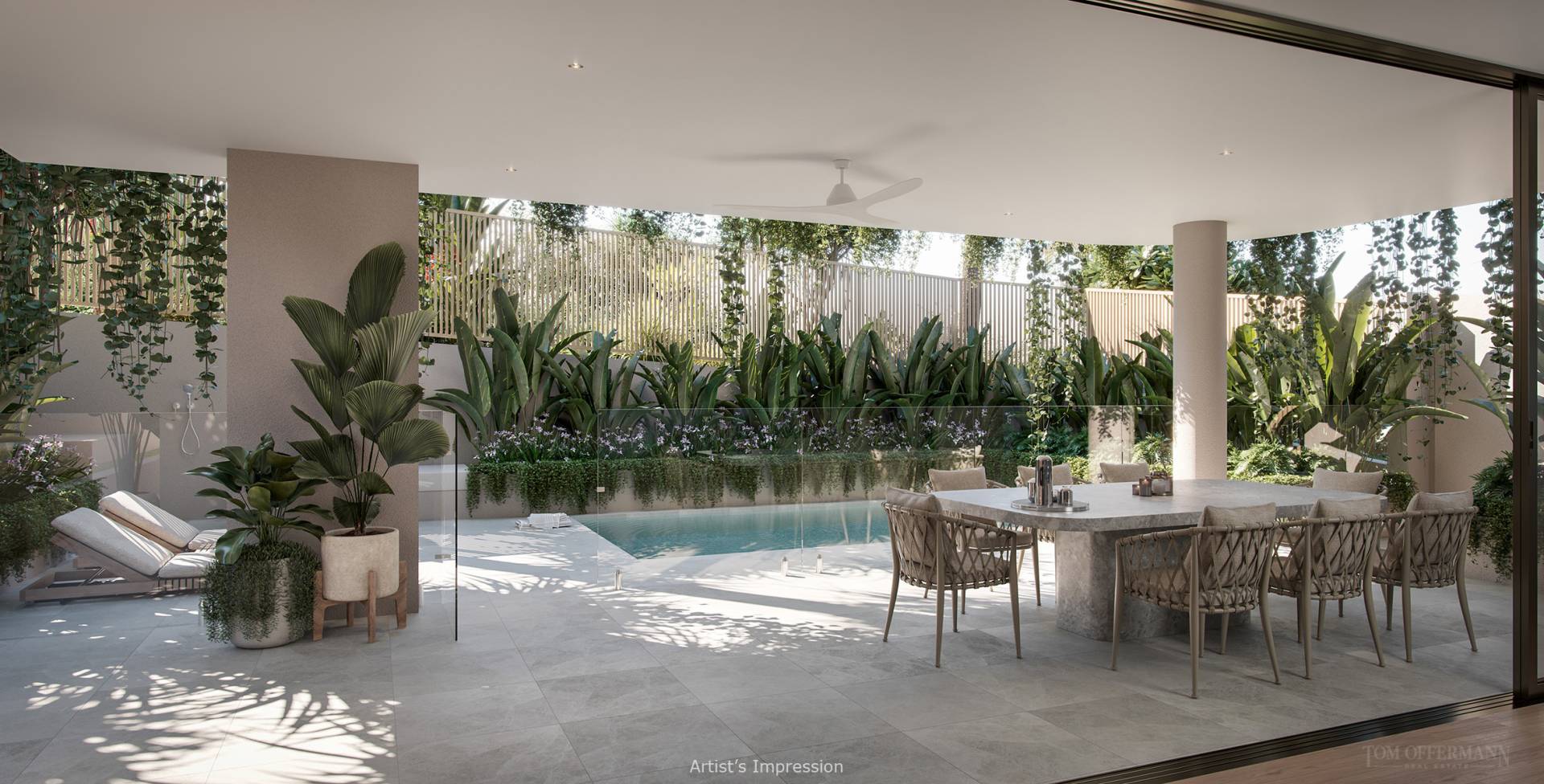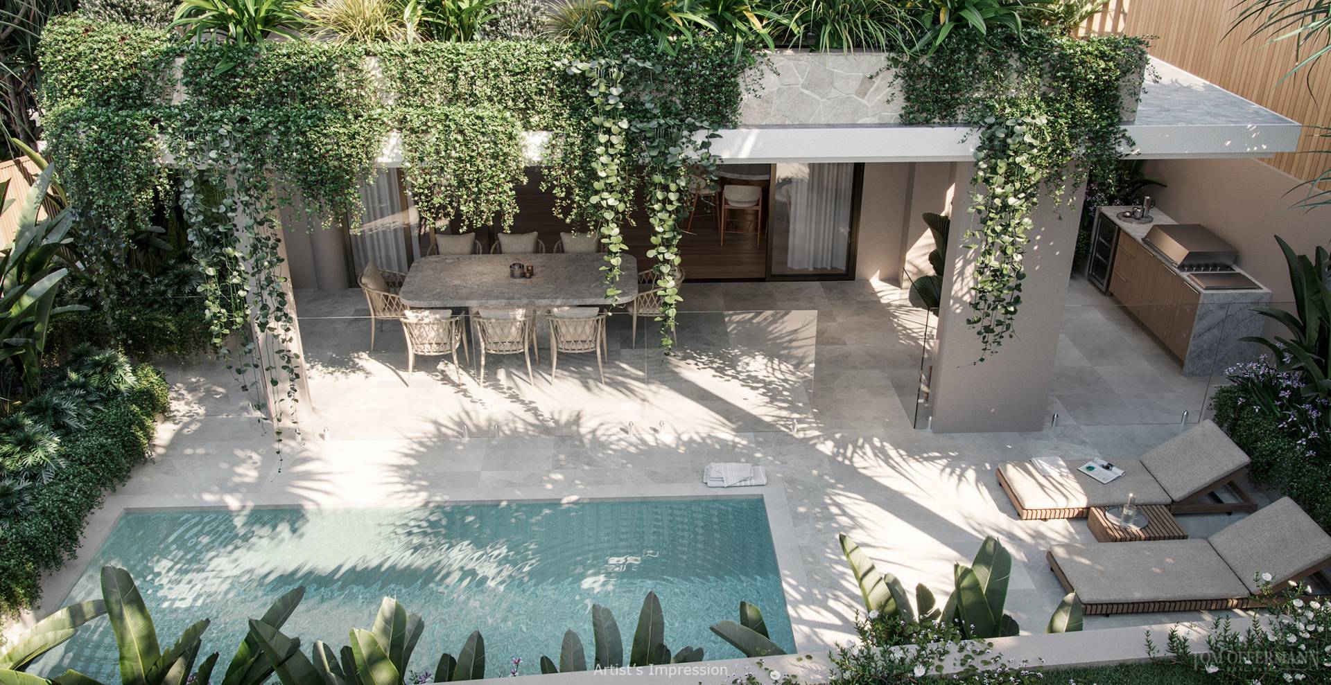 Residences #1 and #2 have three bedrooms, two and a half bathrooms, a separate retreat, laundry, and a study nook. Residence #1 is further enhanced with a private plunge pool and integrated barbeque area set within a lush subtropical landscaped terrace. Both also have large terraces that include a drying area.