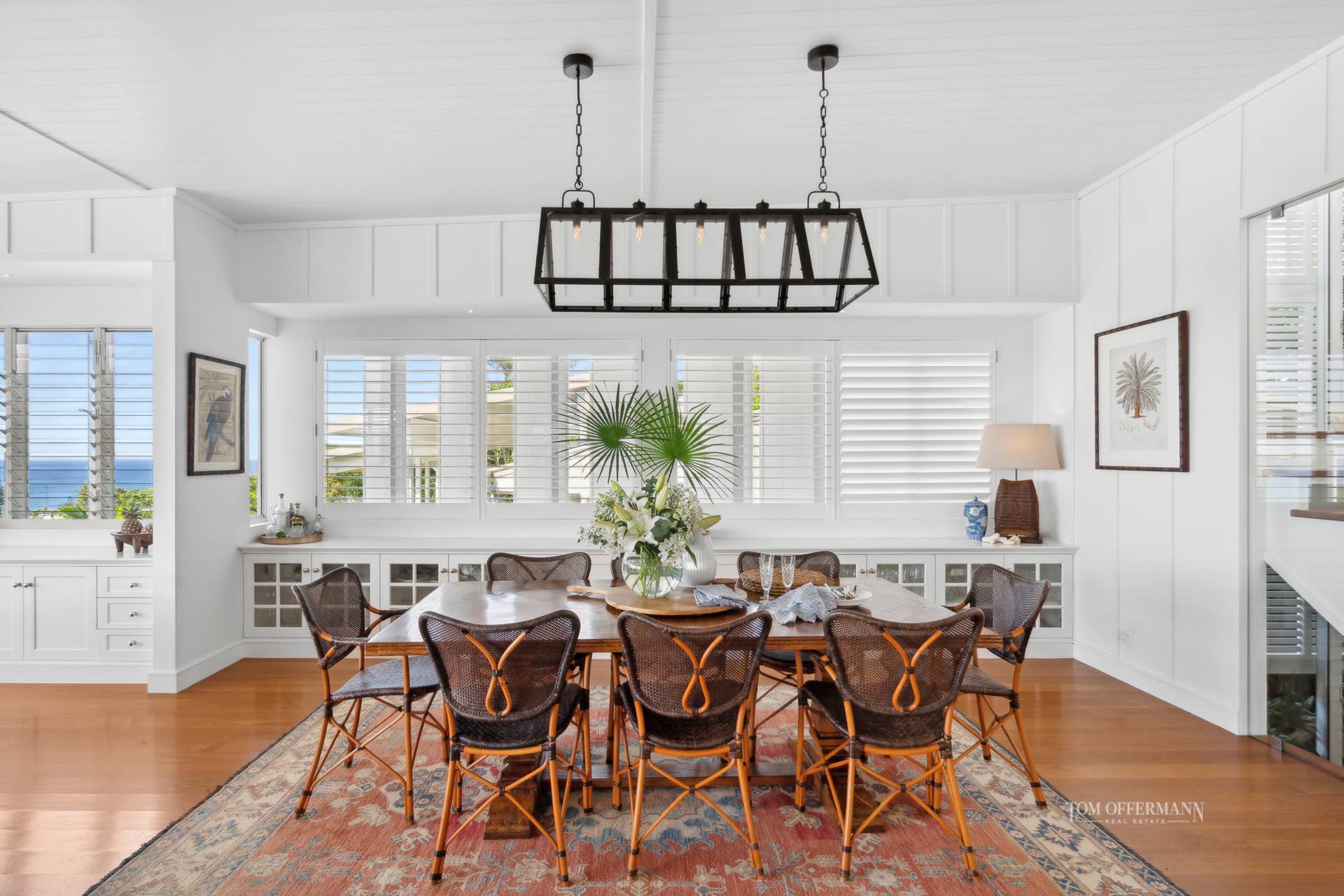 As expected, there are numerous bespoke finishes of zenith quality, craftsmanship and obvious practicality such as seemingly endless rich blackbutt flooring, white VJ ceilings, walls with timber slats, custom cabinetry, designer lights, and an abundance of plantation shutters in the extensive dining and living areas.