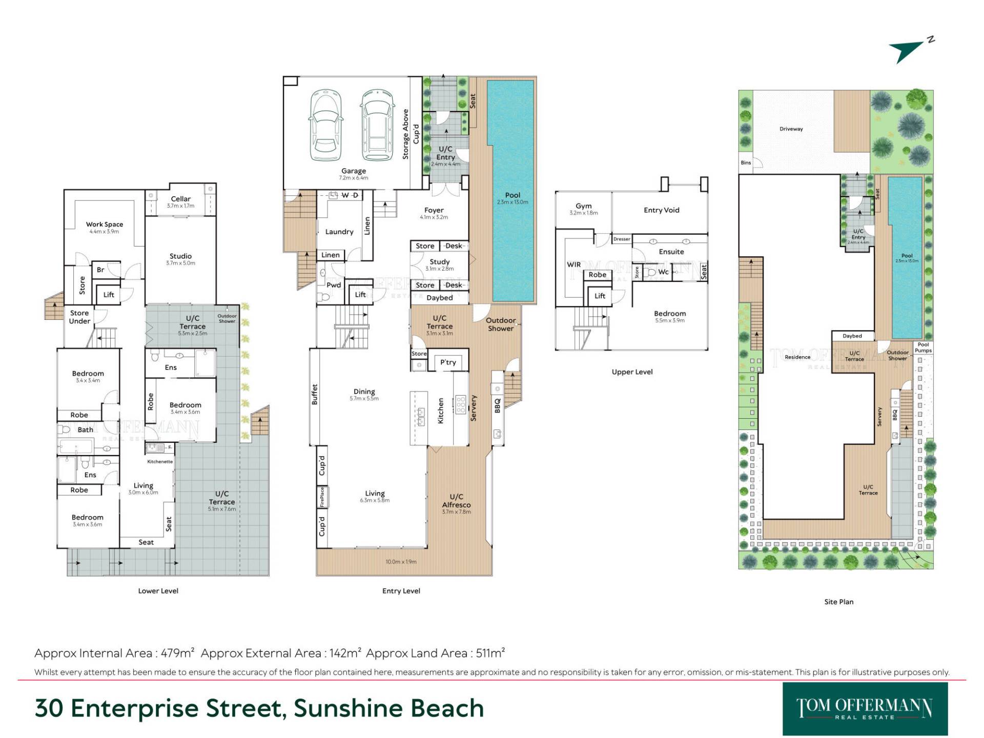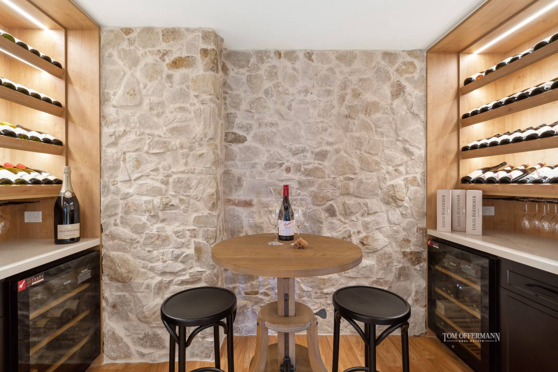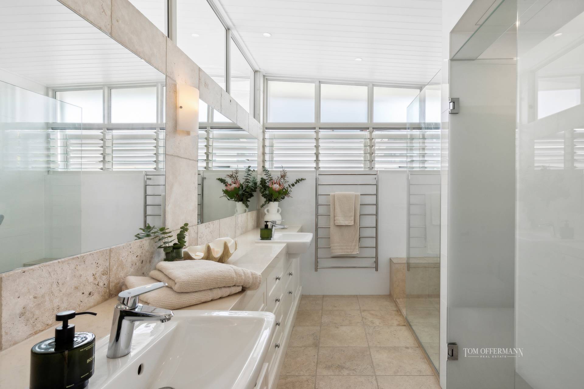 • Bedrooms Plus: 4 upper level - premier king suite retreat w view, plantation shutters, blackout blinds, custom cabinetry incl bedhead; WIR & BIR; ensuite w marble topped 2-basin cabinetry, heated towel rails & WI shower; gym/yoga room; lower level 3 bedrooms w BIRs & ensuites/ bathrooms: living area w custom seating & kitchenette opens to undercover terrace w stairs to entry/main living/pool level & extends to undercover terrace w outdoor shower; northerly wing w leisure/studio space w exposed beams + wine room; adjoining work/art/craft space w BI storage + additional store room & storage
