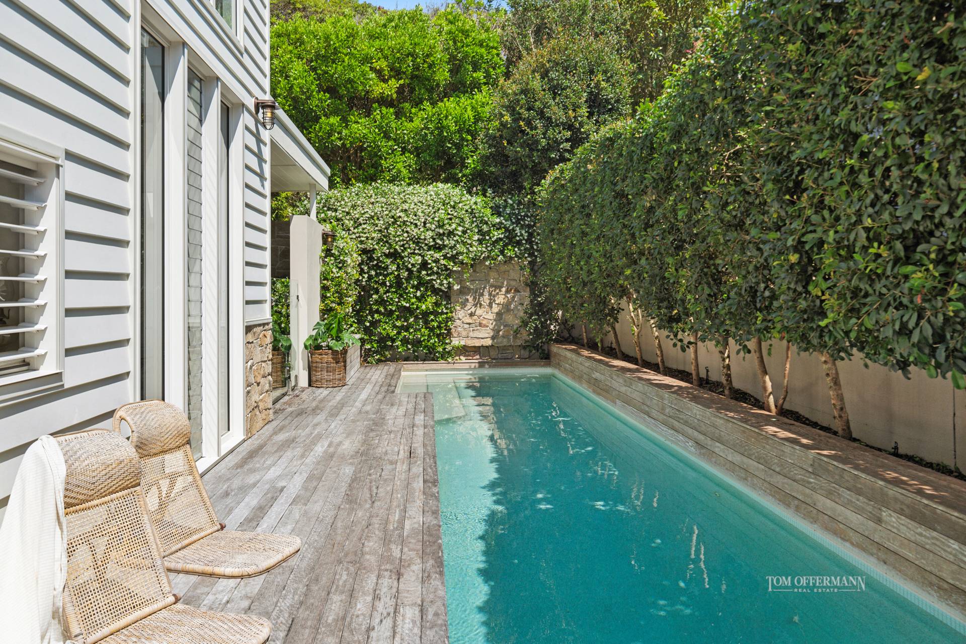 The northside terrace extends in a dramatic fashion, and length of the residence to the pool with washed timber decking and walls of fragrant jasmine, an alfresco dining area in-between, also an outdoor kitchen with barbeque. Genius design at play here with gas-lift windows spanning the lengthy kitchen bench and transforming it into a servery, maybe another space for breakfast with a view, or kids to enjoy a snag after a dip.