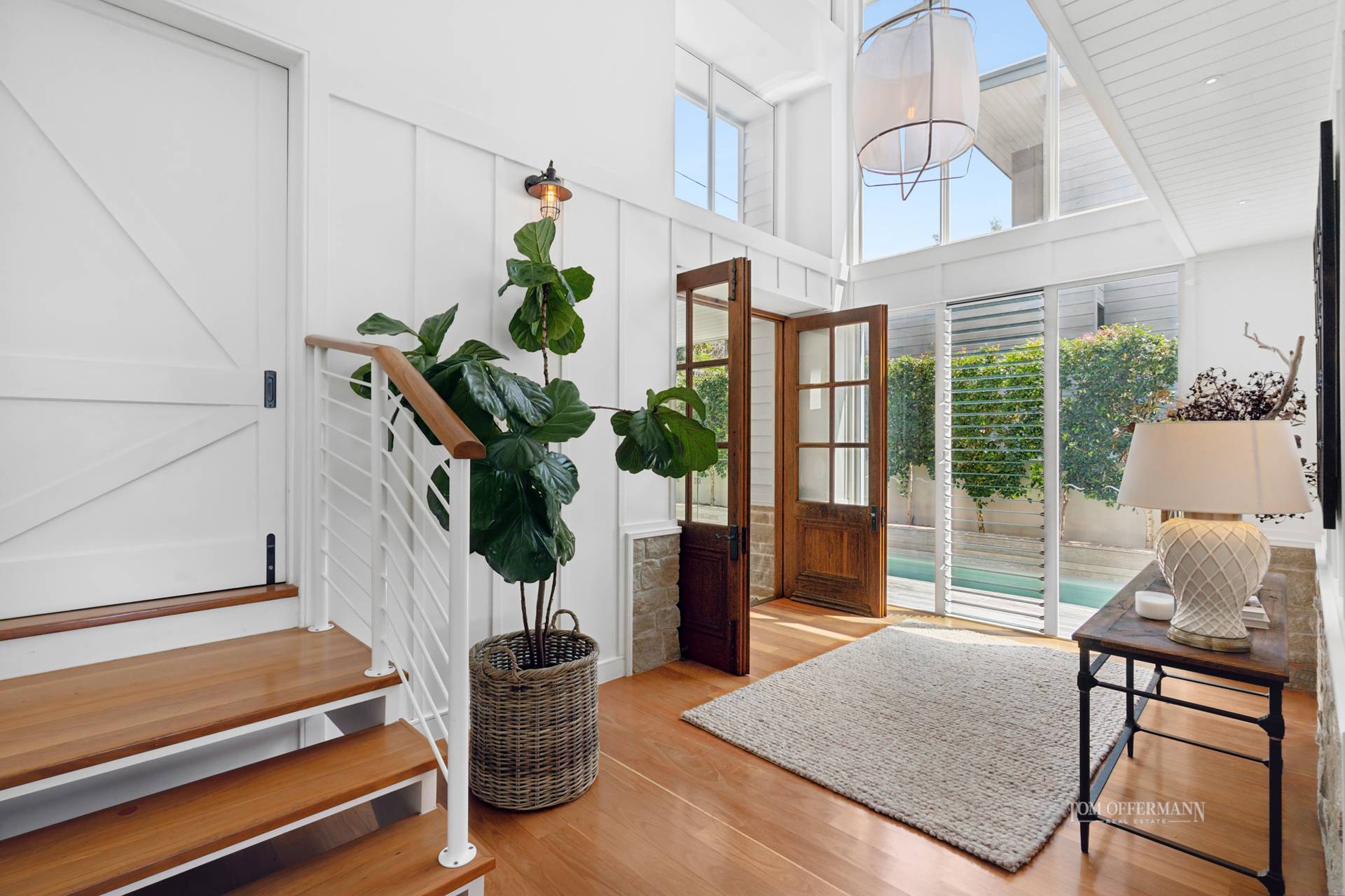 • About: granite flooring front entry; foyer w statement linen covered barrel shape pendant; blackbutt flooring throughout; 4-person lift; white VJ ceilings, walls w feature slats, walls of plantation shutters; ducted air/fans; entry level - study w custom cabinetry; 2-car garage w polished concrete flooring & potential mezzanine/hoist parking; laundry room white tiled, stone-topped cabinetry; main living w wall of white custom cabinetry & integrated gas fireplace; dining w statement designer chandelier; slide away doors extend to undercover terraces eastside to ocean & beach views & nth side (3.7mx7.8m) extends to poolside w daybed & outdoor shower
