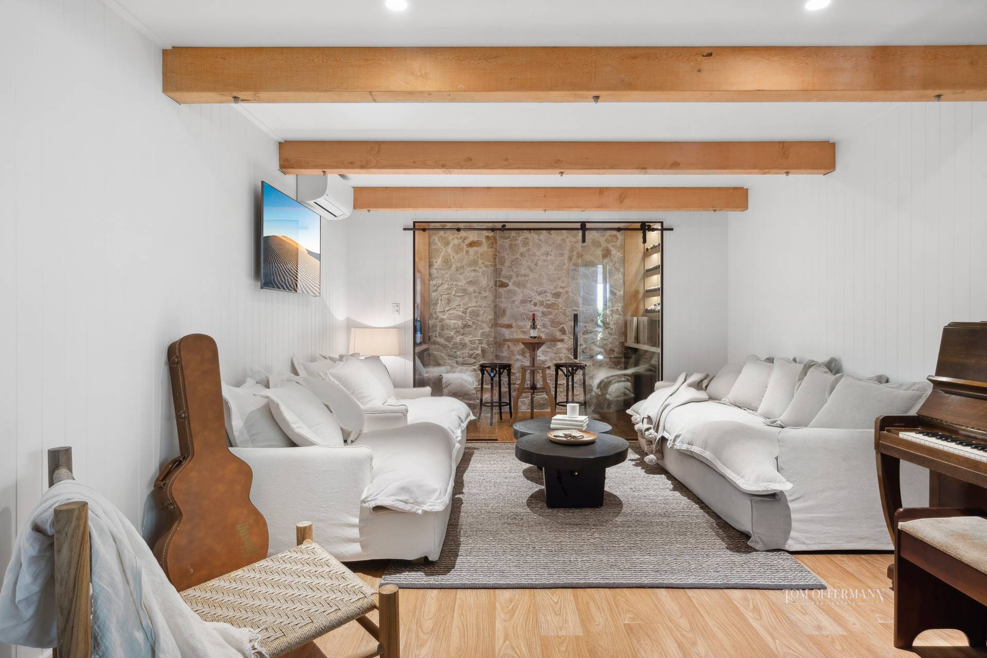 The living area with custom seating and a kitchenette opens to a sizeable undercover terrace with stairs to the main and pool levels, plus pots of bougainvillea. It extends to an additional undercover terrace. The north wing has a leisure/studio space with exposed beams and a separate wine room. Adjoining is a work aka creative space.