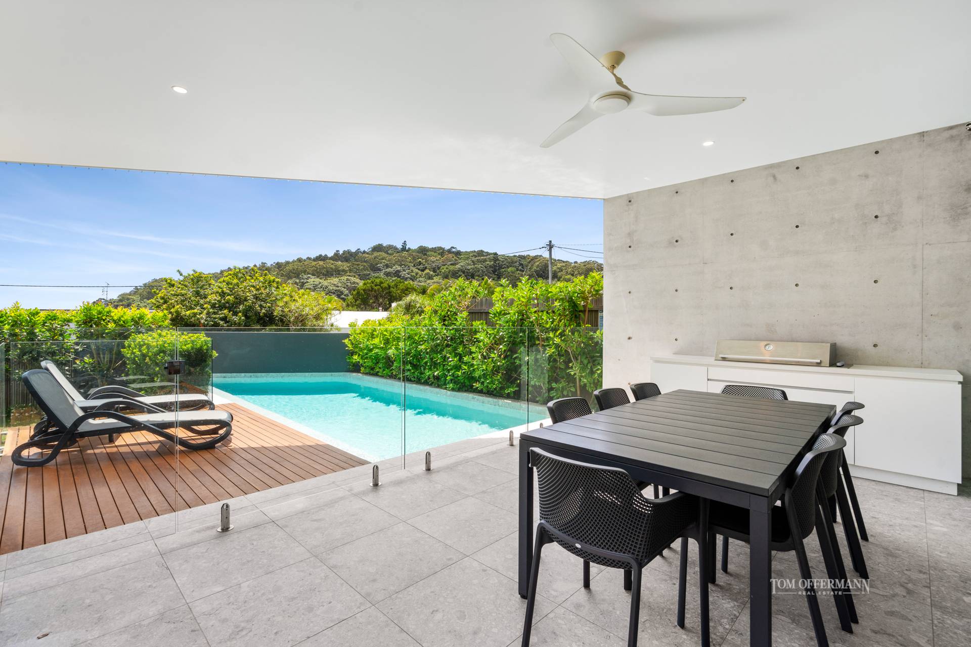 Eyes are drawn to the right and not surprisedly it's a bright living - more a favourite, leisure space, with a monochromatic palette of muted greys and warm whites, custom-built cabinetry designed for entertainers, and doors which slide away into oblivion to reveal an undercover terrace with integrated barbeque. And there's more. A ravishing luminescent pool with a timber sun deck, spells endless summers lolling on a lounge in-between dips.