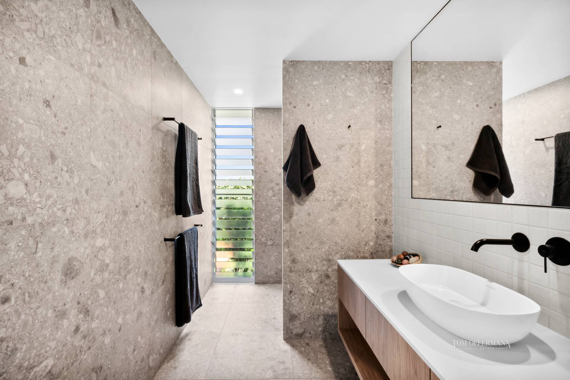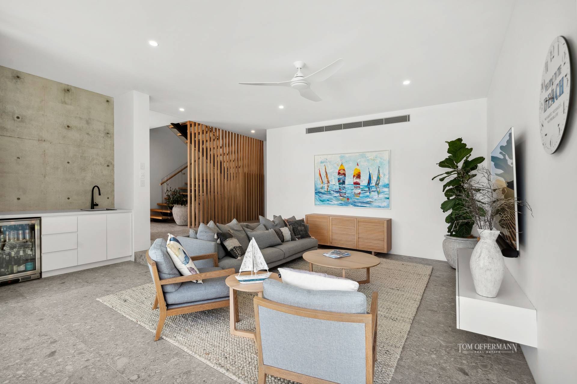• About: 2.7m ceiling height; French oak flooring & stair treads; glass panes & banks of louvres; Normann Copenhagen bell pendant; bespoke American oak front door; security camera/auto lights; ducted aircon/fans; 2-car garage w store; mud/sand room/laundry w drying court; muted greys & warm white palette; living/dining first level w nth facing 5.7mx4.7m undercover terrace; ground floor living/leisure space w custom cabinetry incl sink & beverage fridge; alfresco covered terrace w integrated BBQ/kitchen; 4-bedrooms – upper level nth facing premier king w walk-in robe, ensuite w bath + study area; 2 bedrooms w BIRs & shower room/powder room/toilet; ground level bedroom w BIR, terrace to side garden, + ensuite; powder room nearby