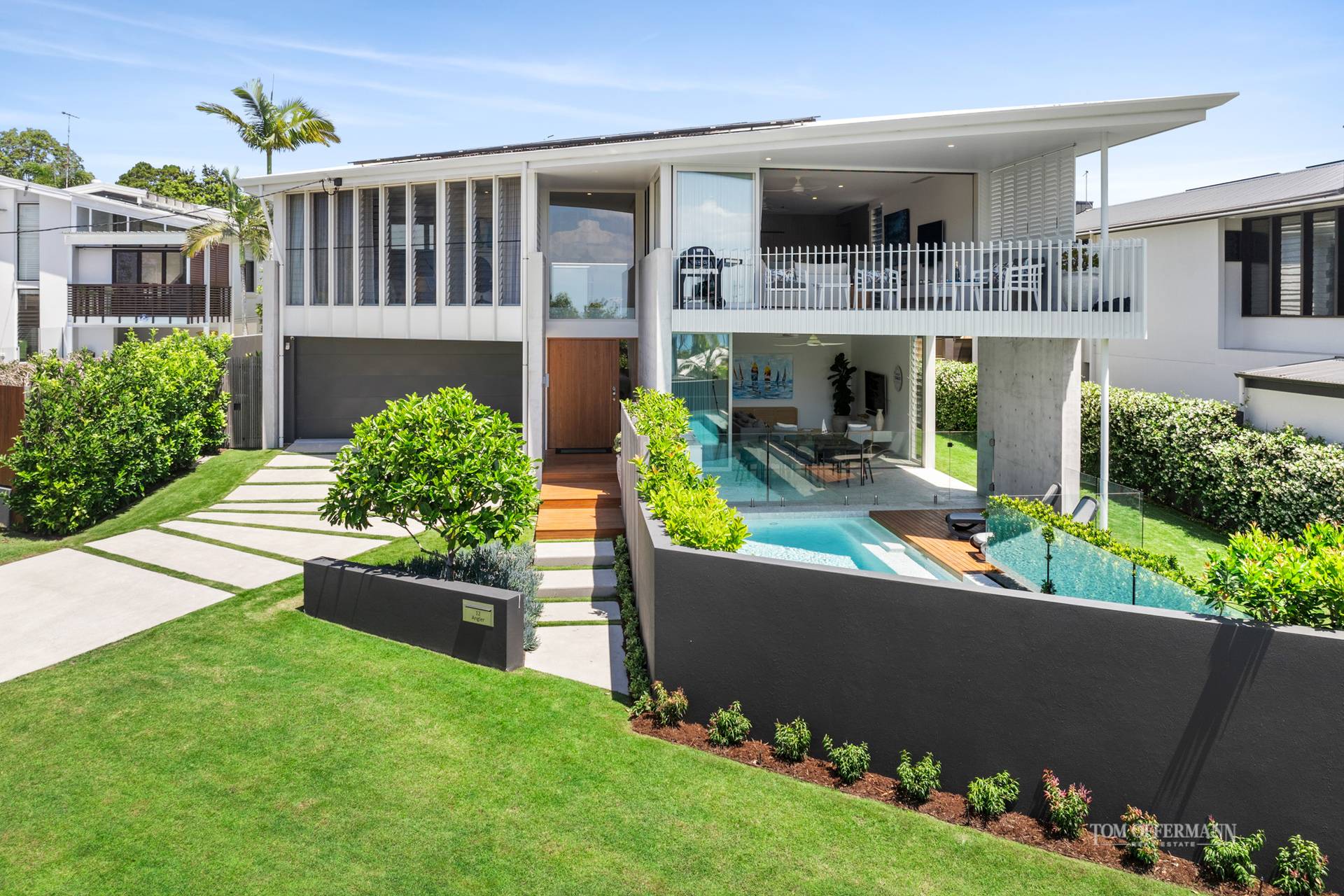 Beyond the tall, streamlined exterior aesthetic of stylistic formed concrete fins with feature studs, slatted timber grills and scaled fenestrations, and surrounding landscaped gardens, the residence's striking beauty overwhelms the pursuer, and it is undeniably top of the class.