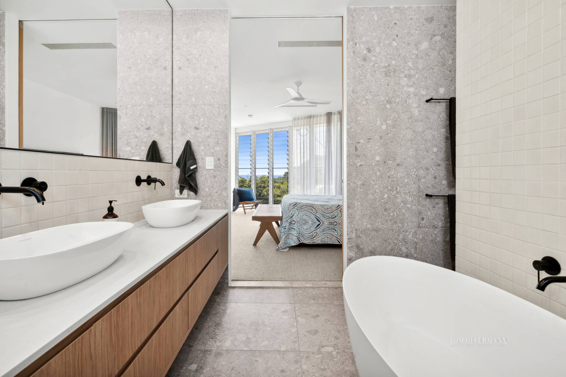 Wake to the big picture of sweeping ocean vistas and a verdant outlook from the premier king bedroom suite. It has a dedicated study area, walk-in robe with designer dresser, and an ensuite bathroom with free-standing tub and stone-topped double basin cabinetry.