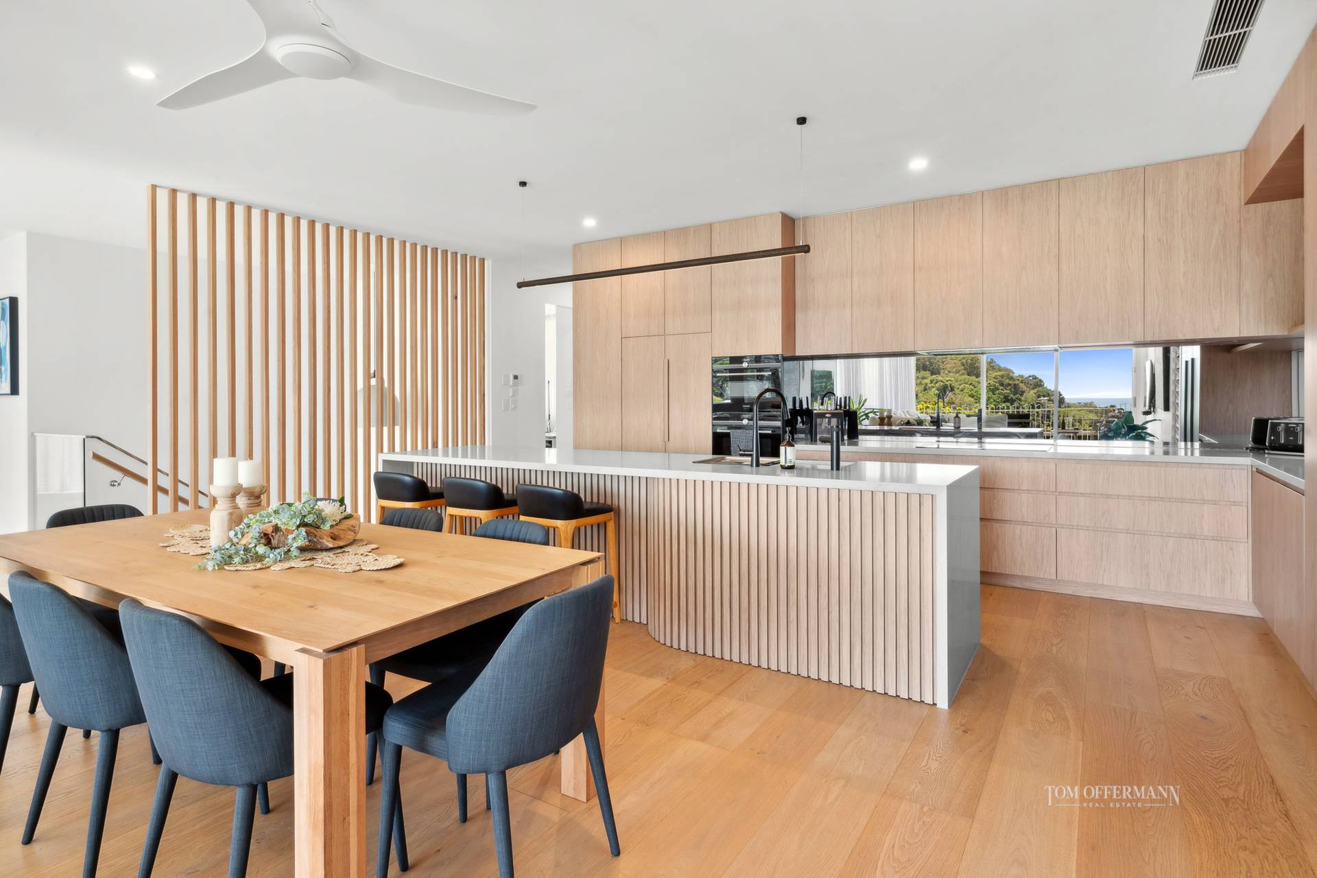 Check out the view before opening the bespoke American oak door, then admire the oh-so-high ceiling and extensive use of glass louvres and panes capturing every prevailing breeze. They also maximise natural light which seemingly shadow dances on extensive honey-hued French oak floors, and meld effortlessly with the uber-contemporary interior design
