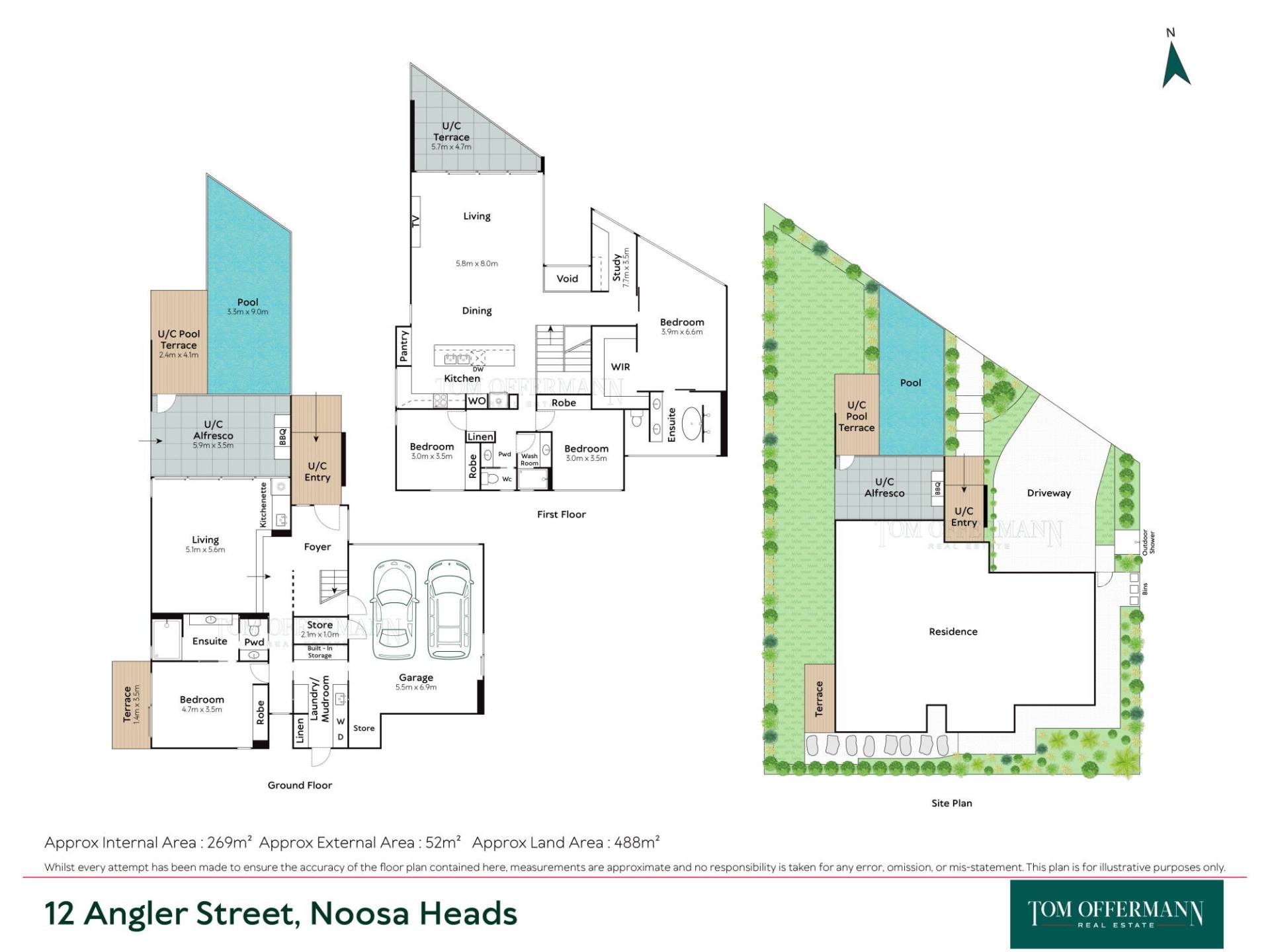 • Pool/Terraces: 3.3m x 9m w 2.4mx4.1 timber sun terrace + 5.9mx3.5m undercover terrace off living