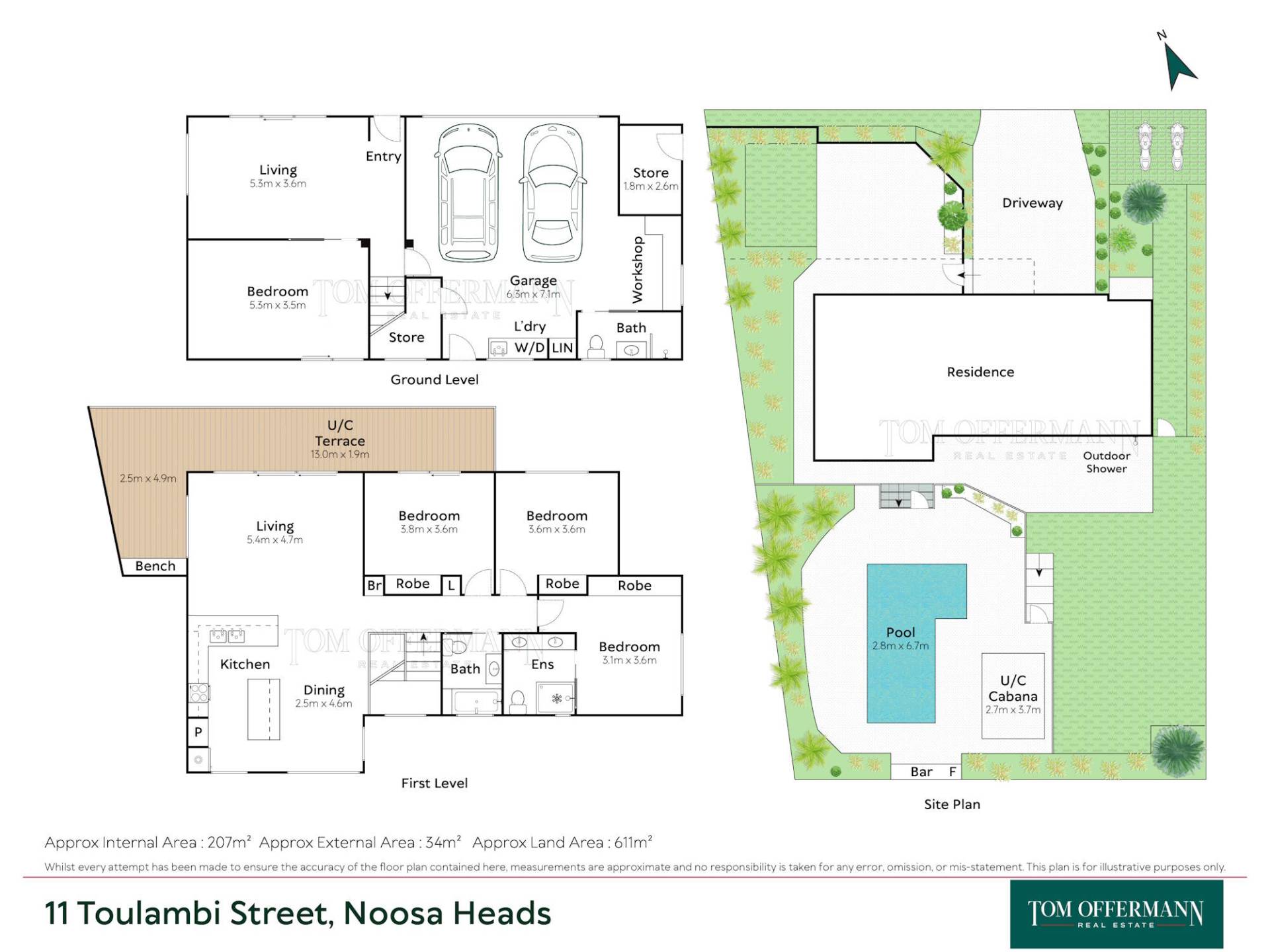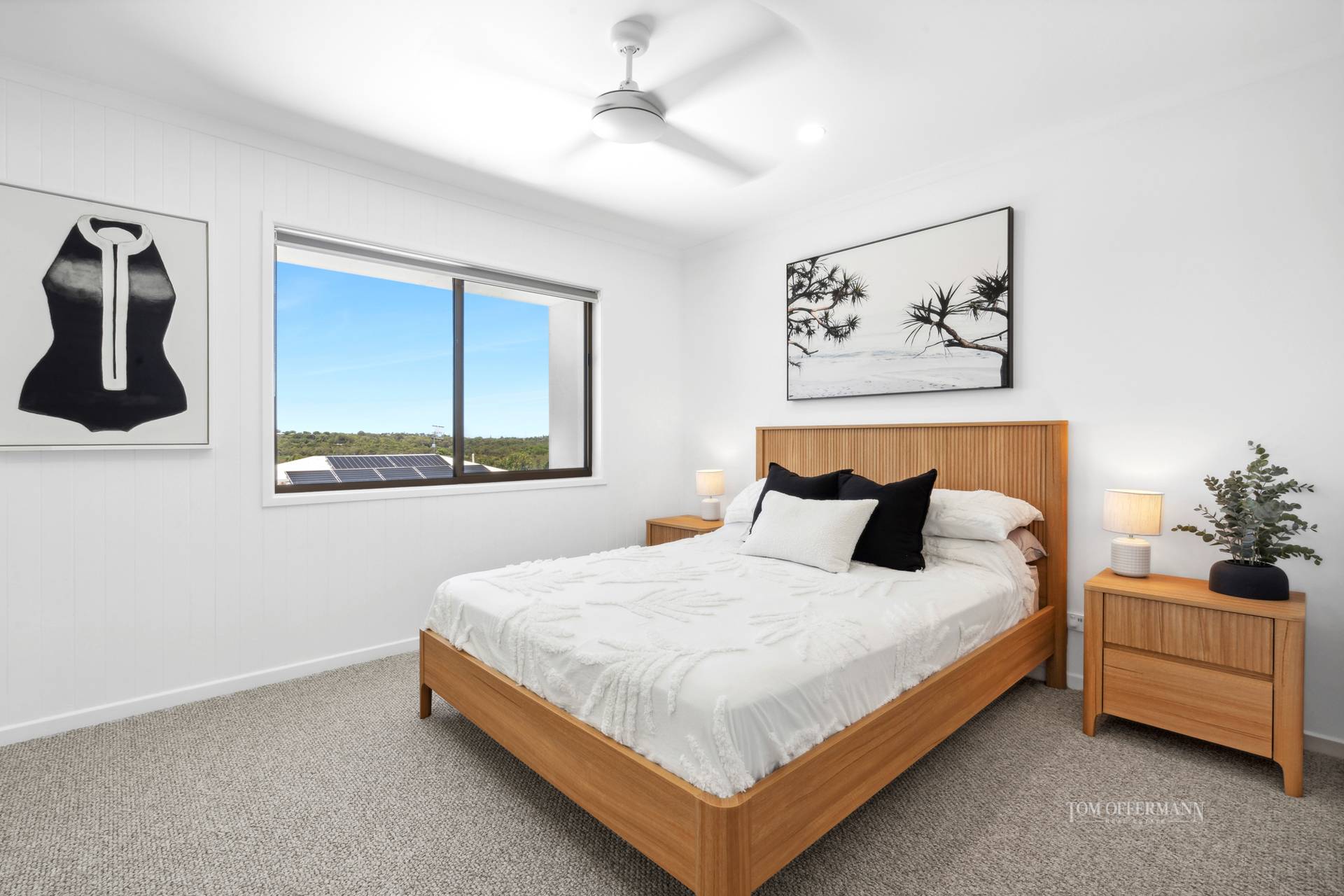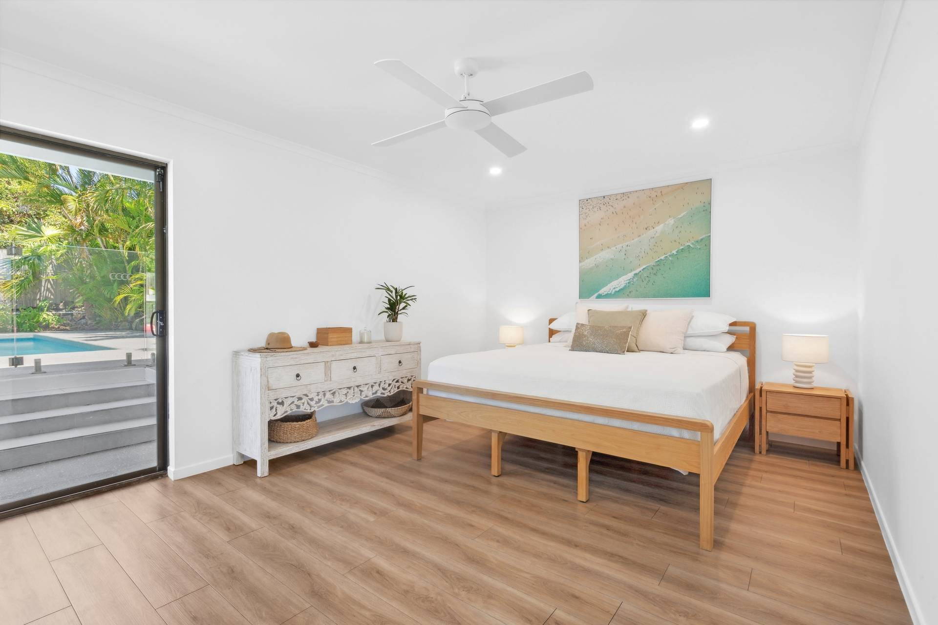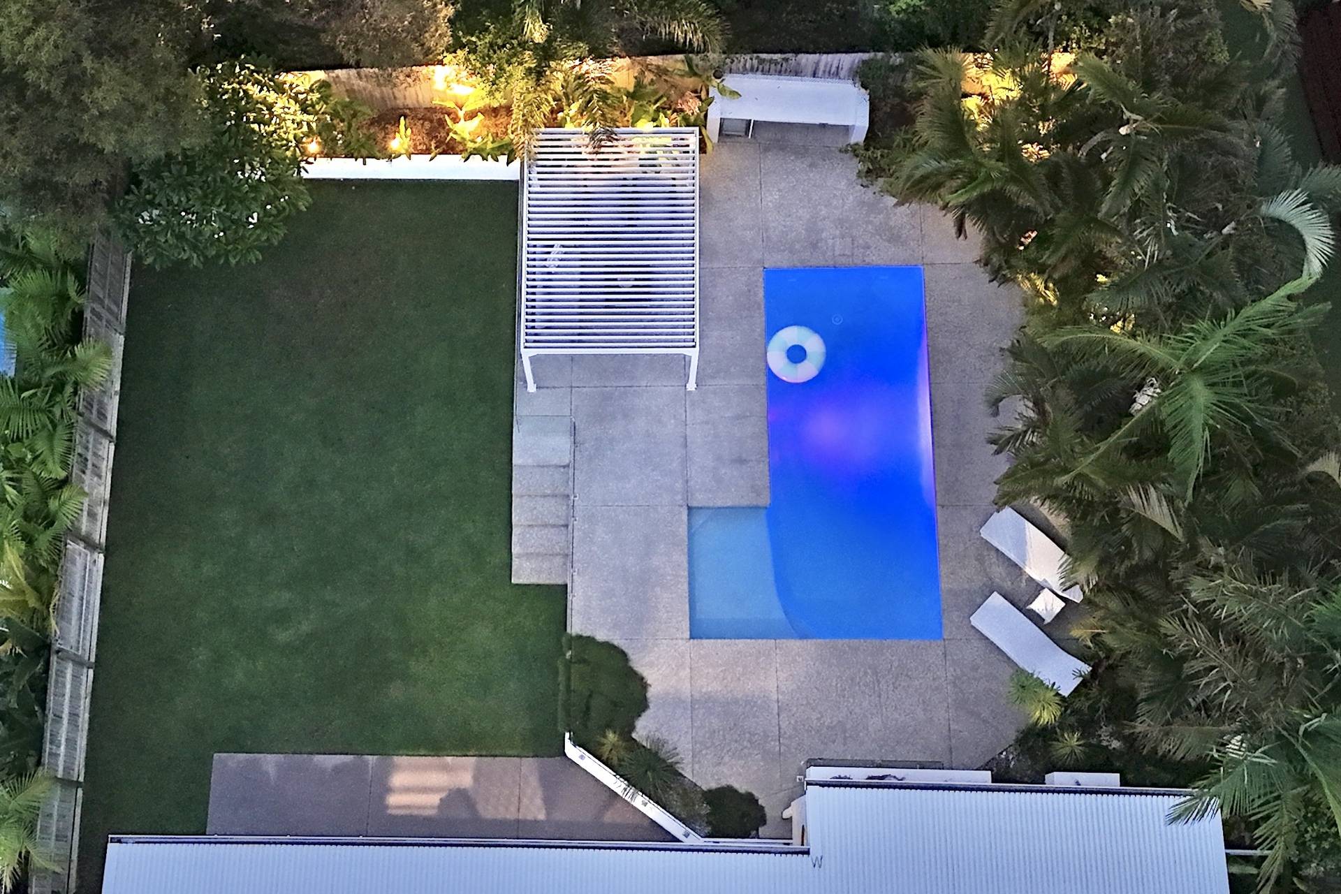 • About: oak hued flooring; fans/aircon; upstairs feature VJ walls, large porthole to view & raked ceilings; open plan living & dining w access to undercover 13mx1.9m nth terrace wraps to west side w white sail & BBQ bench; 180 degree views; ground level living w access w to front garden; sth side to pool, cabana, rear garden & play area; 4 carpeted bedrooms 3 w BIRs: 3 upstairs - premier king bedroom w verdant views + over pool; ensuite w white feature wall tiles, stone & 2 basin-topped timber cabinetry; 2 bedrooms nth aspect 1 w access to terrace; bathroom w feature tiles, bath/shower; ground level bedroom + bathroom