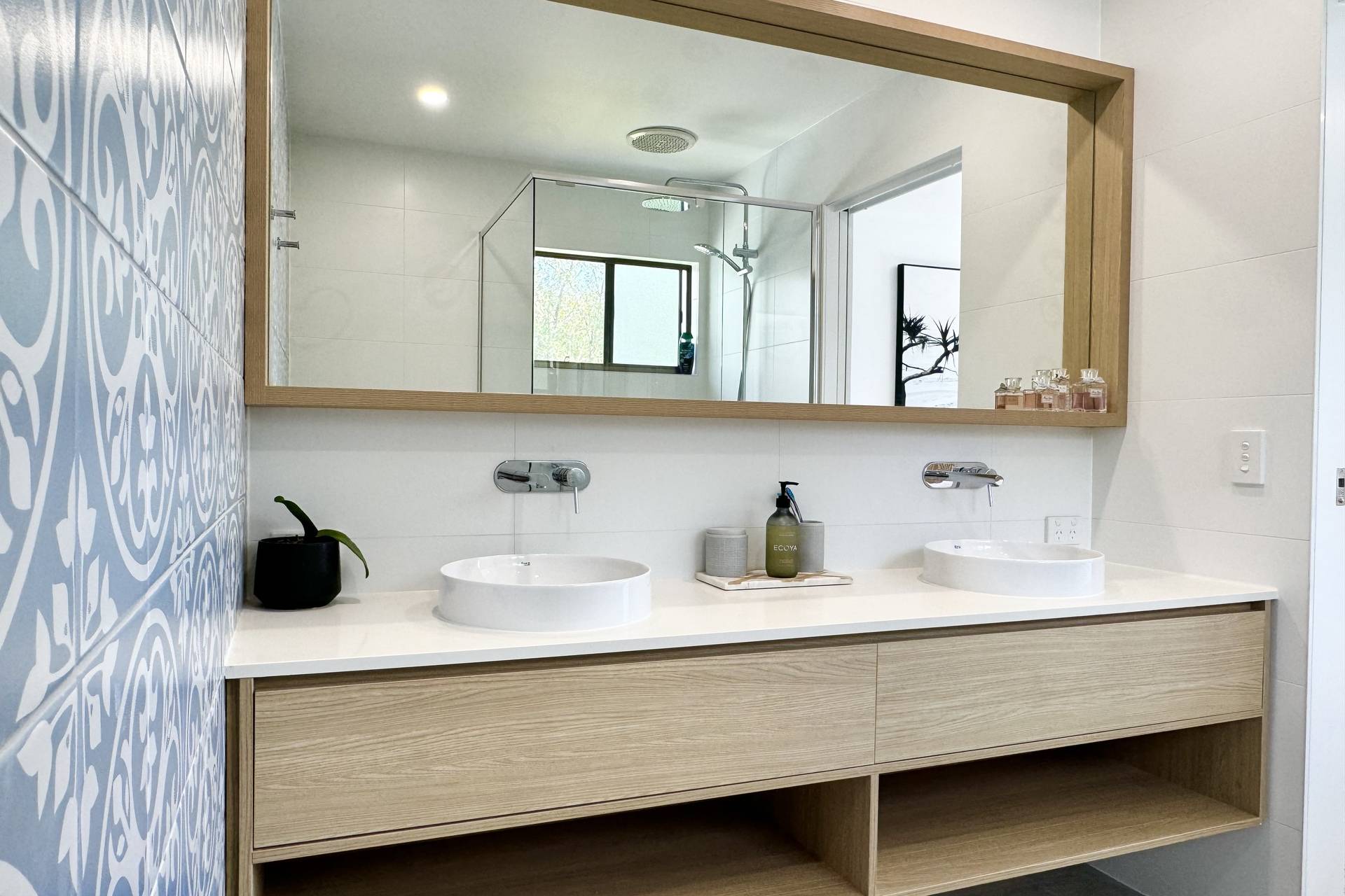 When it comes to sweet dreams, there are four bedrooms. Three upstairs are carpeted and have built-in robes. The premier king bedroom has verdant views and an ensuite with white feature wall tiles and stone topped timber cabinetry. Two bedrooms have a northerly aspect, one has access to the terrace and there's a family bathroom with feature tiles and a shower/bath. On the ground level is a bedroom, also a bathroom with stone-topped timber cabinetry and pastel grey wall tiles It is also accessible from the garden and pool area.