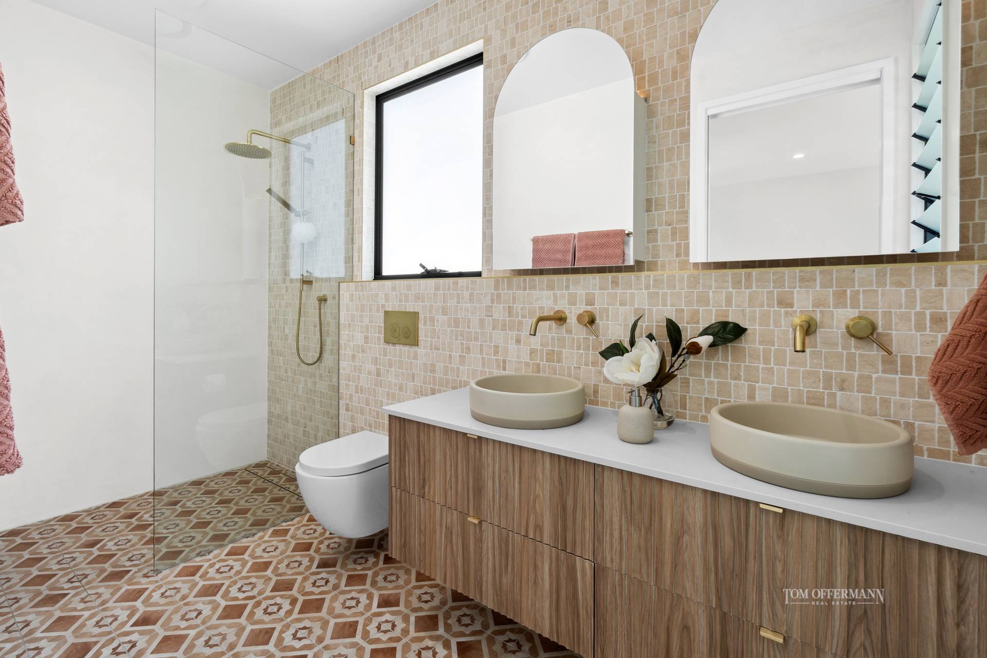 • Upstairs: hallway/mezzanine w wall of glass louvres & panes; 3 bedrooms incl premier king w creamy white, natural & spice aesthetic incl bedhead, armchair & bedside tables + undercover 3mx2.7m terrace; WIR + ensuite w Palm Springs inspired spice & natural toned feature wall & floor tiles, curved mirrors & brushed brass tapware & stone 2-basin topped timber cabinetry; nth wing 1 queen & 1 bunk w BIRs; bathroom w herringbone tiles & stone-topped single basin cabinetry