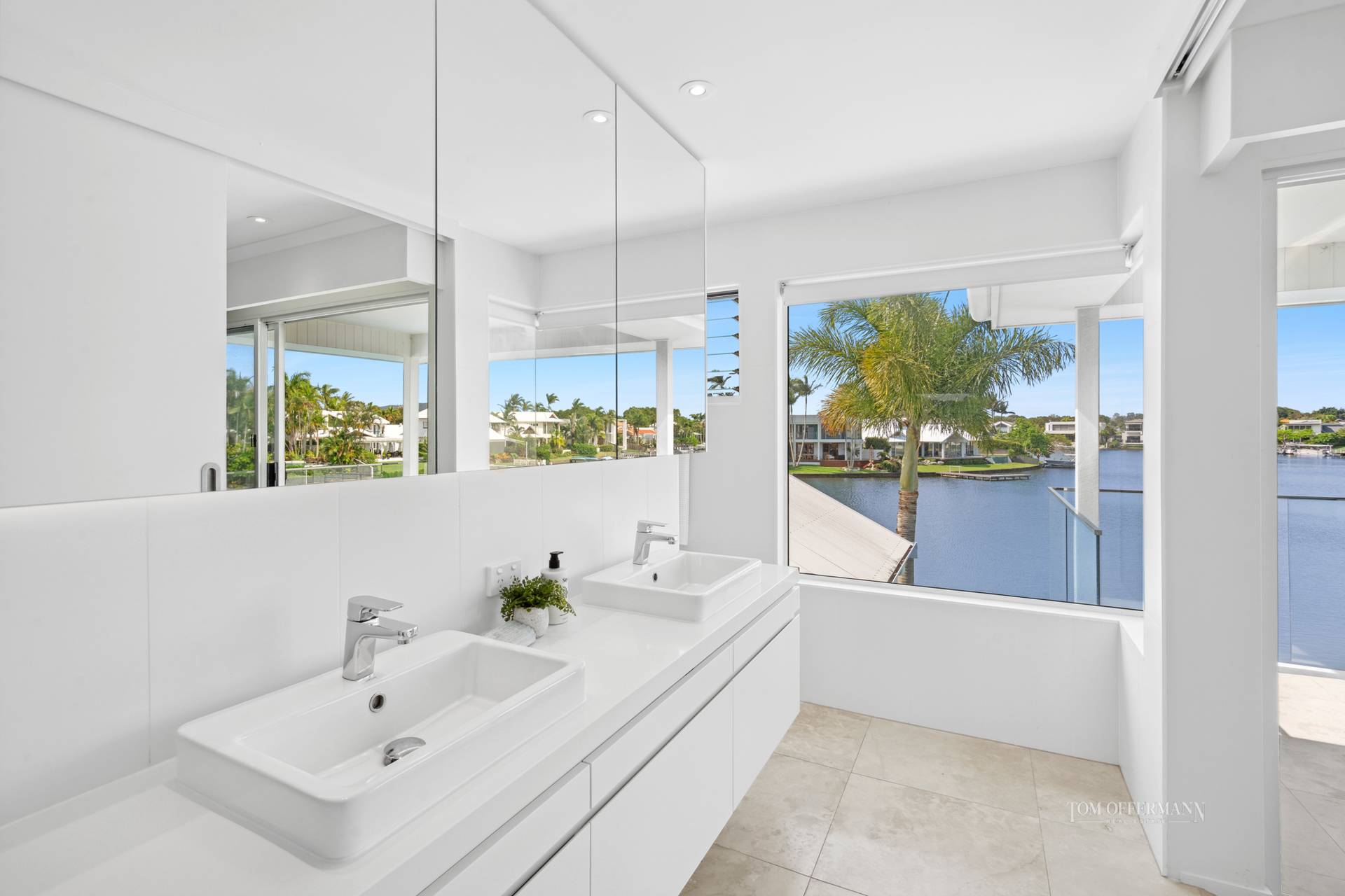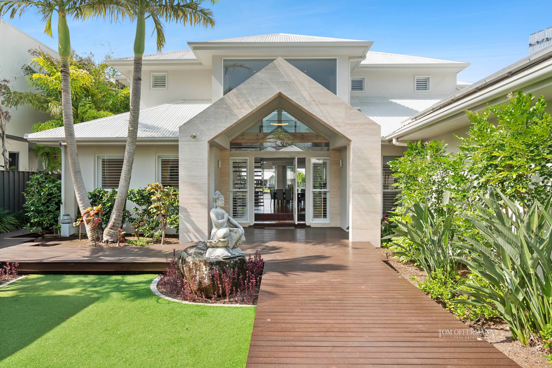 • About: Designed by Paul Clout and reinvented by Tim Ditchfield; Immaculately presented; massive white timber & glass paned pivot door, louvres either side; entry foyer w clerestory height void; polished blackbutt flooring; ducted air/fan; living & dining areas custom cabinetry, fireplace & picture window; areas defined by angles & sliding away doors; terraces incl alfresco entertaining space poolside; 5 bedrooms; 2 carpeted on 1st floor either side of mezzanine/hallway, both nth-facing w WIRs & ensuites; premier king suite retreat w terrace & nth views of waterways; custom timber bedhead; ensuite w natural hued travertine, white stone topped dble basin cabinetry & sep shower & toilet; 3 ground level w timber floors, BIRs & bathroom w white stone topped single basin cabinetry & free-standing bathtub; 2-car garage w store & internal access; laundry w travertine tiles, plenty of storage & drying area access