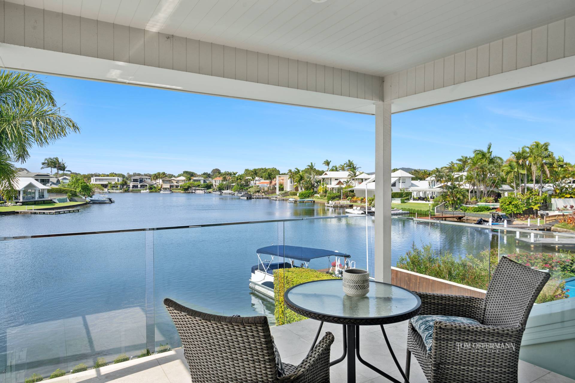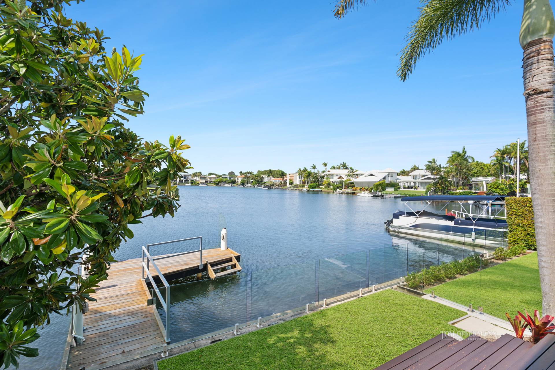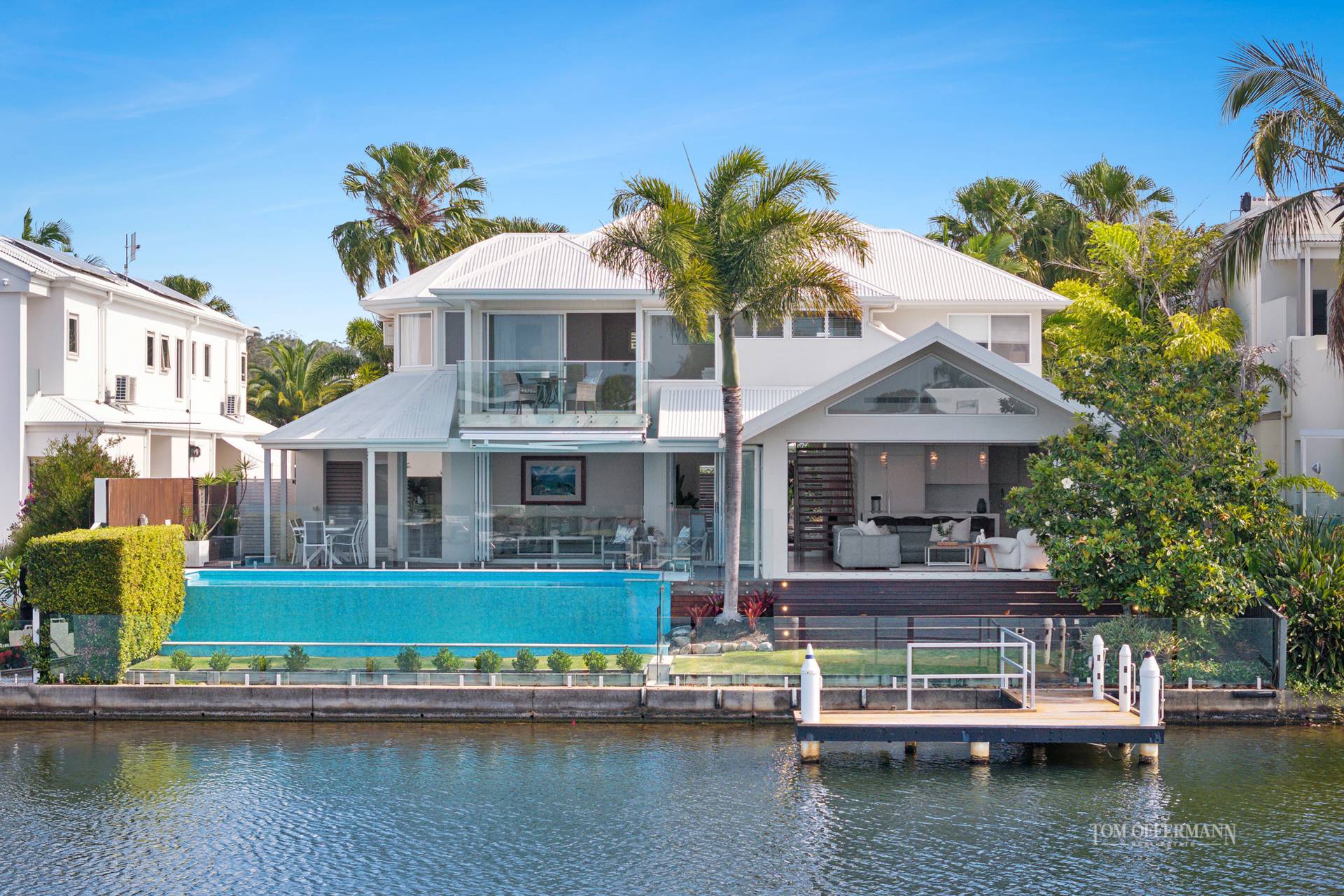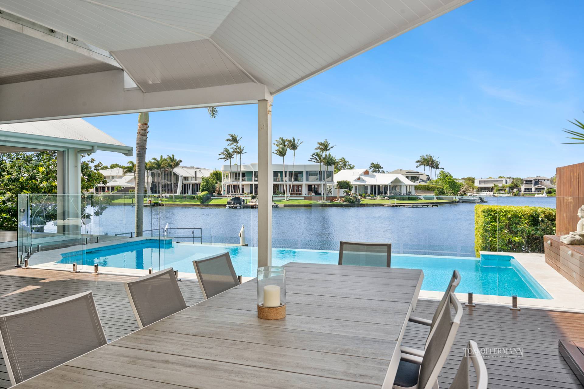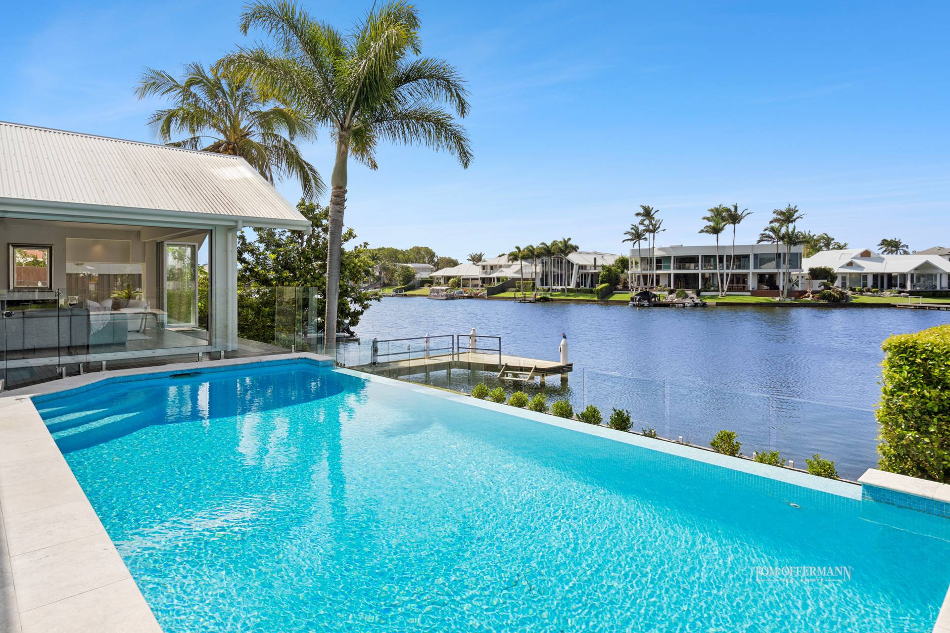 • Pool & Terrace: 9.7mx4m travertine edge; undercover main terrace + lawn to revetment wall w glass fencing to water/canal