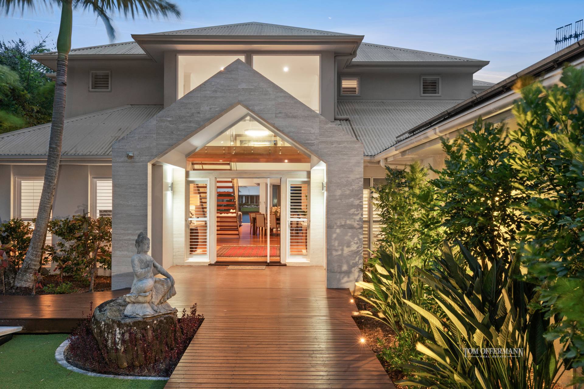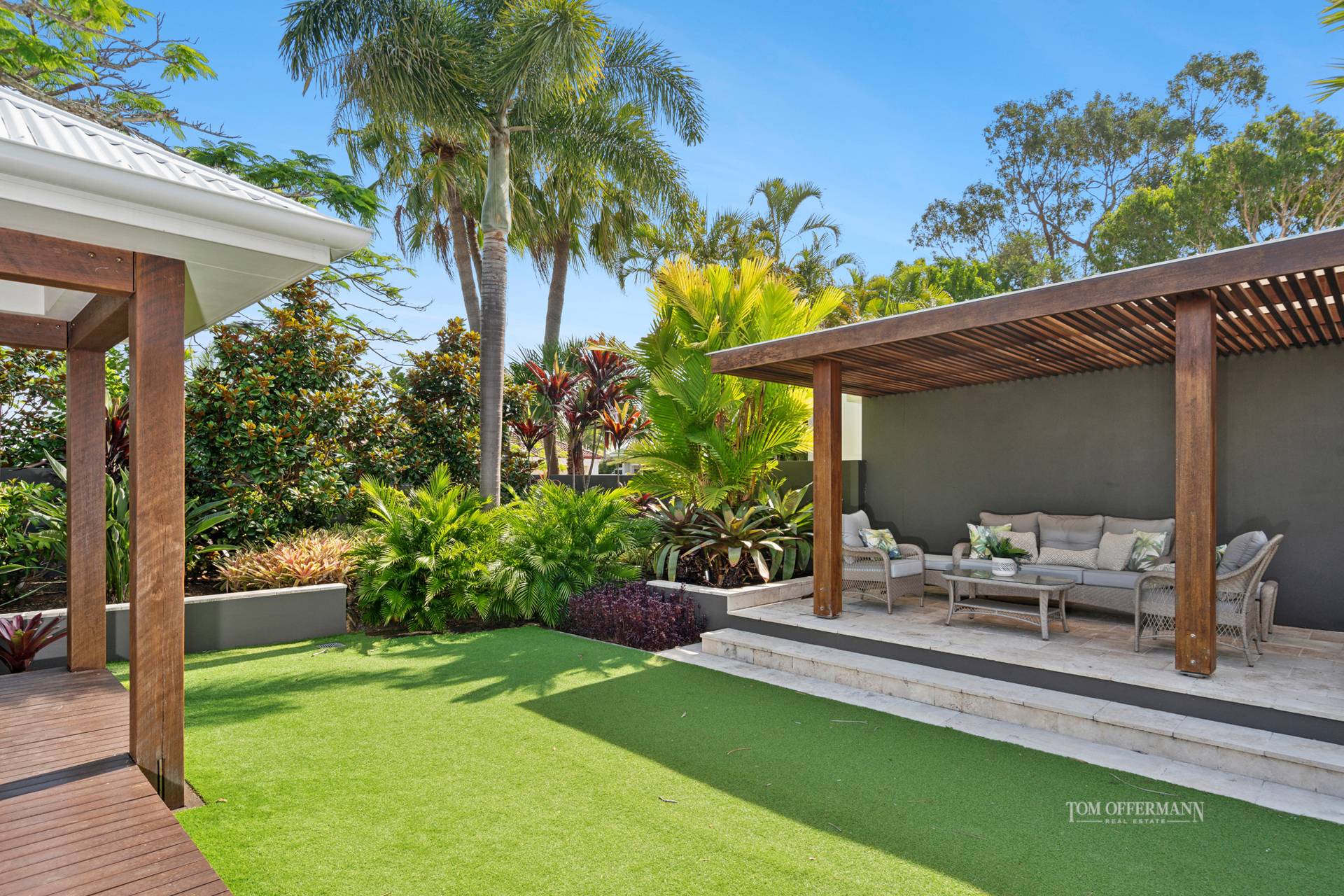 It is intriguing from the cul de sac with its lush landscaping and imposing timber gate, but behind the public persona, a walkway enhanced by a lush tropical garden with a chic cabana centrepiece, reveals itself as ostensibly a private and serene sanctuary.