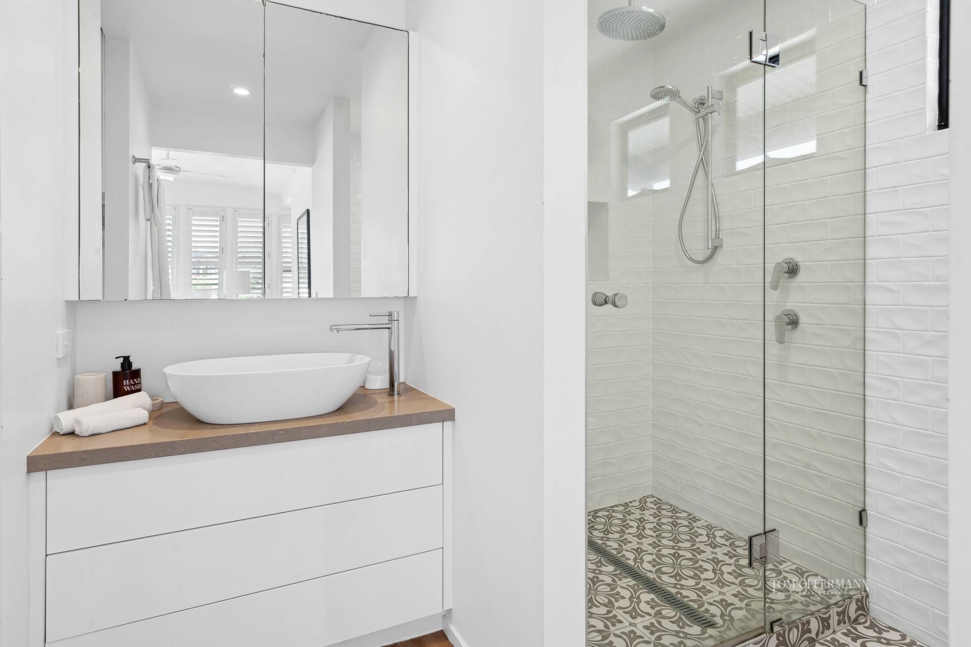 There are four bedrooms. Upstairs is the premier suite with north-east facing terrace suggesting a morning cuppa accompanied by a sea view, also a television, walk-n robe and an all-white ensuite. Two bedrooms have built-in robes and desks, and the bathroom has a natural stone feature and shower/bath. On the street level is an extra-large bedroom with television and built-in robe, and the bathroom with white stone double basin-topped cabinetry, plus separate toilet are nearby.