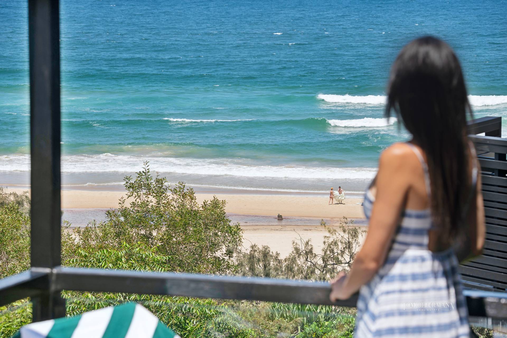 Perched confidently within the dune, viewing northward from the Noosa National Park Headland of Sunshine Beach, sweeping across the Coral Sea, bright blue like a cloudless sky, and a lush rainforest back garden, the scene is truly picture-perfect.