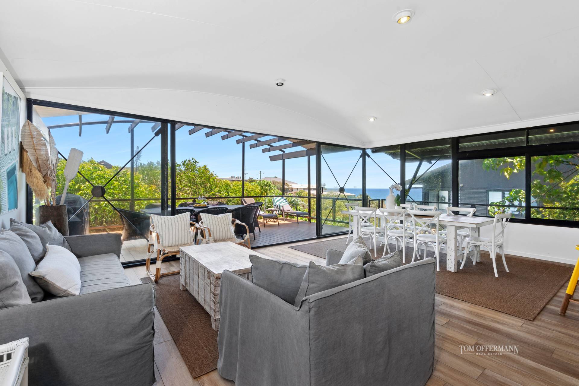 From the street, take the tree fern-fringed timber walkway to the entry. Push aside the statement custom timber front door and behold the bright beachy aesthetic and natural sunlight shadow dancing across seemingly endless washed oak-toned flooring. Living and dining spaces of varying scale, ceiling heights, curved lines and mood, morph to outdoors where the main covered terrace with sea views and the sound of waves breaking onshore, wet the appetite for entertaining whatever the reason and season.