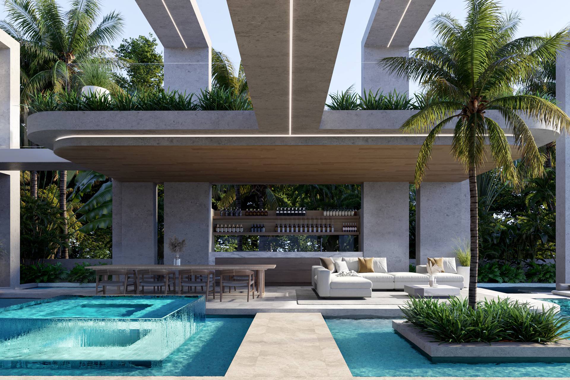 On the entry level water vistas have starring roles in almost every space. Liberal use of disappearing glass panes merge the interiors to the natural surrounds and alfresco living where bridges connect seemingly 'floating' terraces to the luminescent pool, spa, pond and spill in a fashion to the wide beach and perfect-for-swimming sparkling shallows.