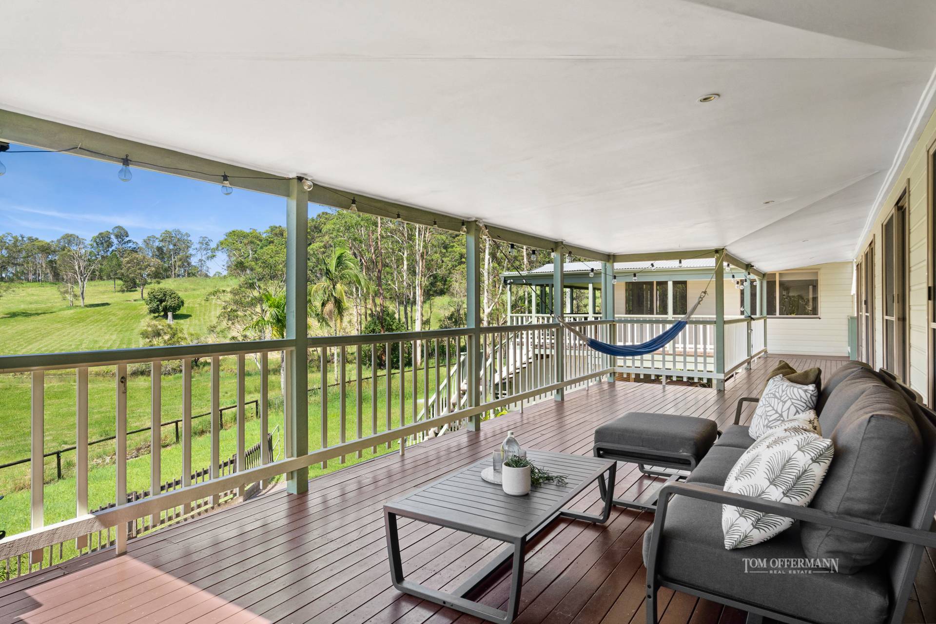 Picture a substantial Queenslander-inspired residence, comprising two massive wings, with multiple, serious living and bedroom spaces in both, and most accessing the north-facing 50+ metre-long verandah. A clever design which captures panoramas over the verdurous small pastures and lush landscapes, plus beyond to Mt Cooroy.