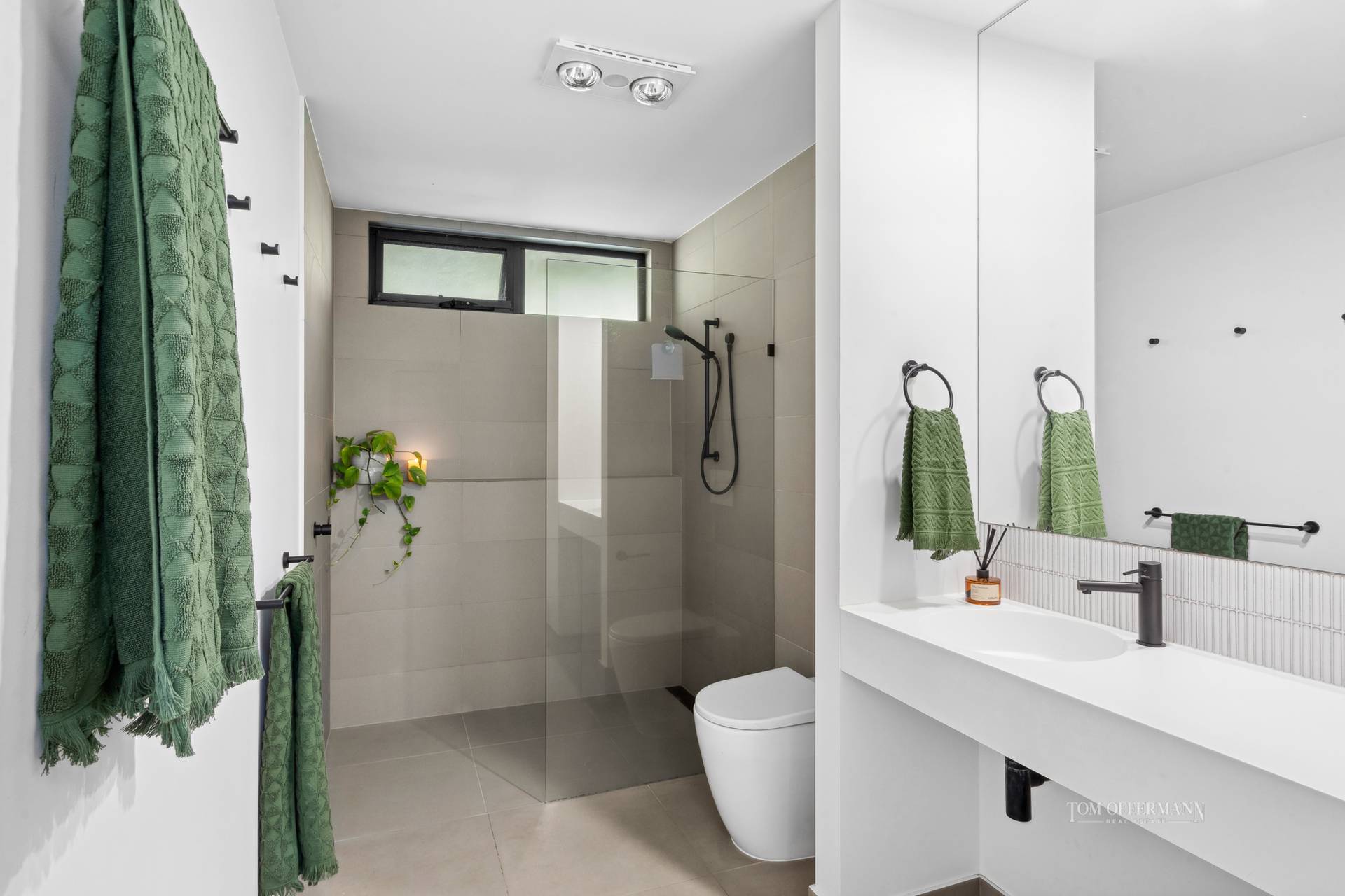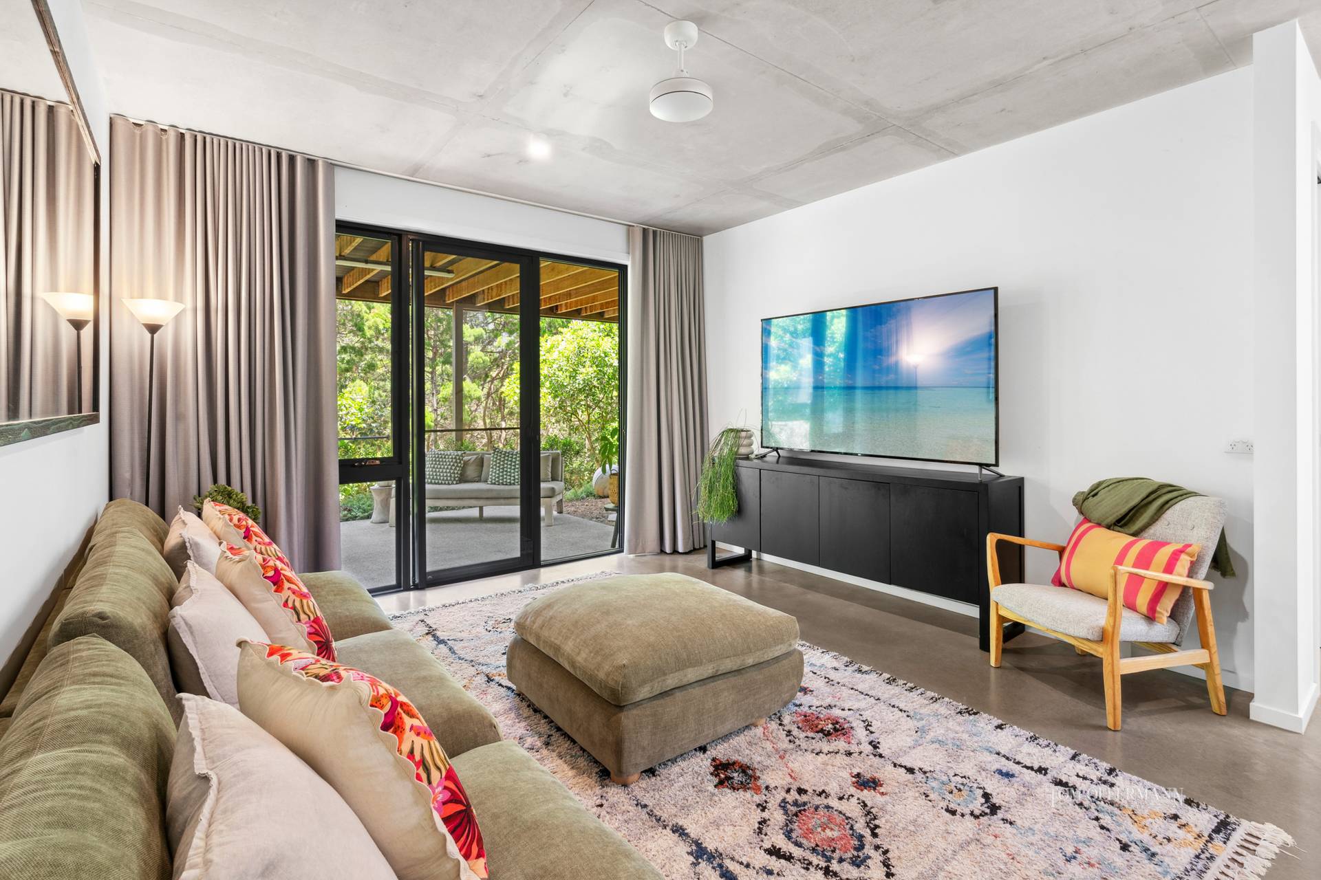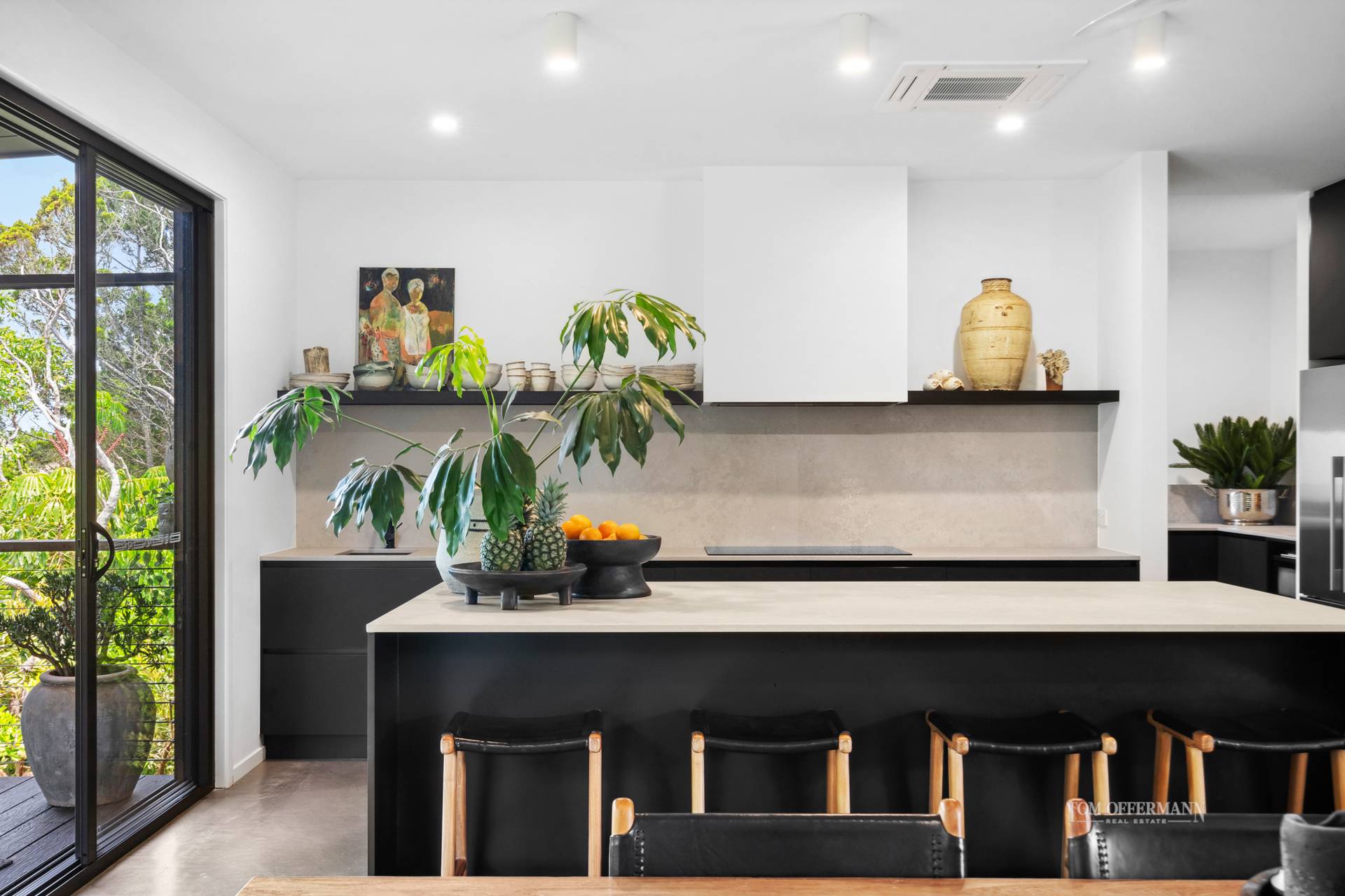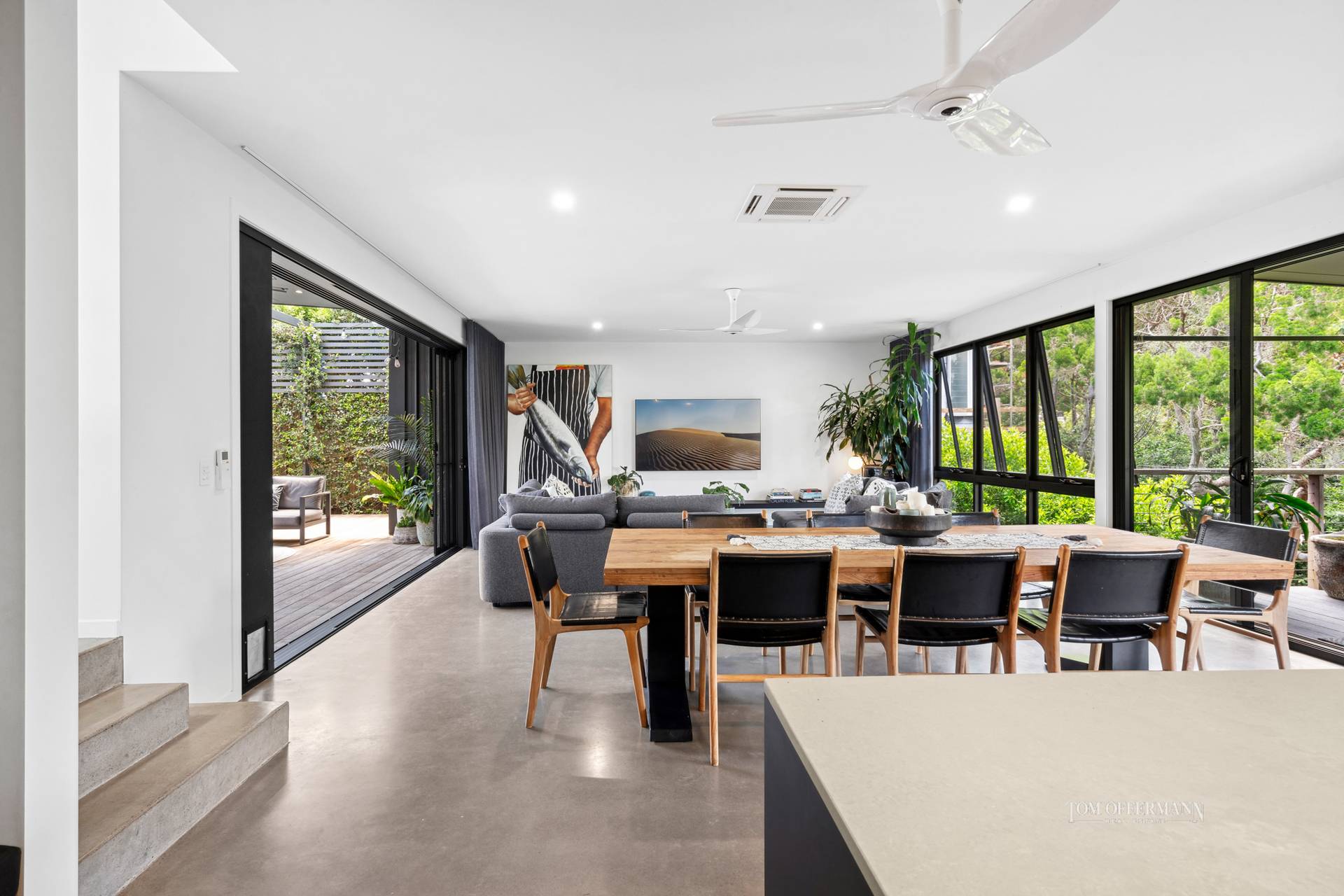 The heart of the home flows effortlessly from the light-filled hallway overlooking the central courtyard and sparkling pool. The seamless open-plan living spaces are perfect for both relaxing and hosting friends. Floor-to-ceiling windows and stack-back doors bring the outdoors in, with a gorgeous outlook into the treetops of the coastal reserve, ensuring privacy and the sounds of abundant local birdlife. Step outside onto expansive entertaining decks and enjoy coastal breezes and easy access to the pool- ideal for summer days.