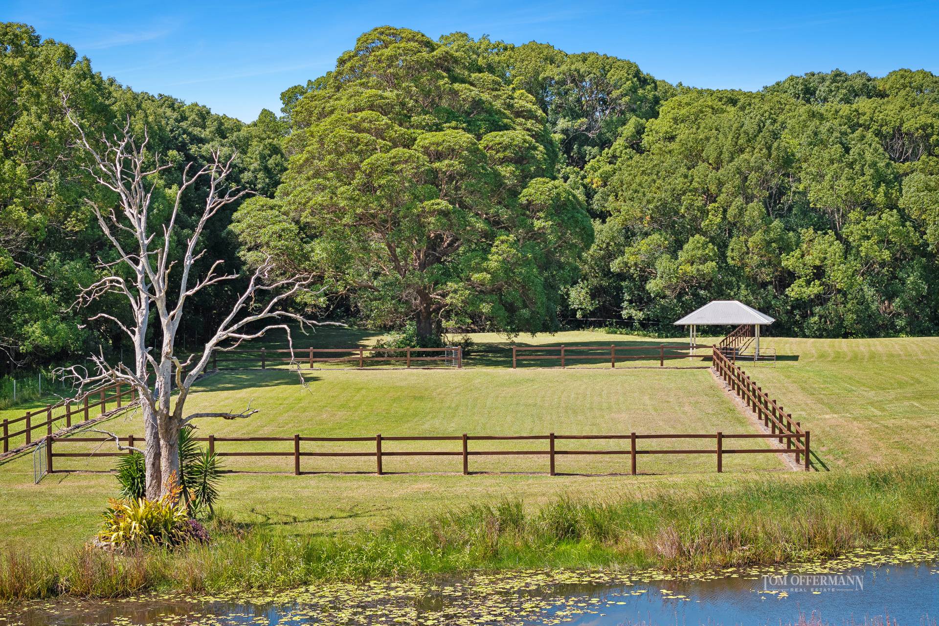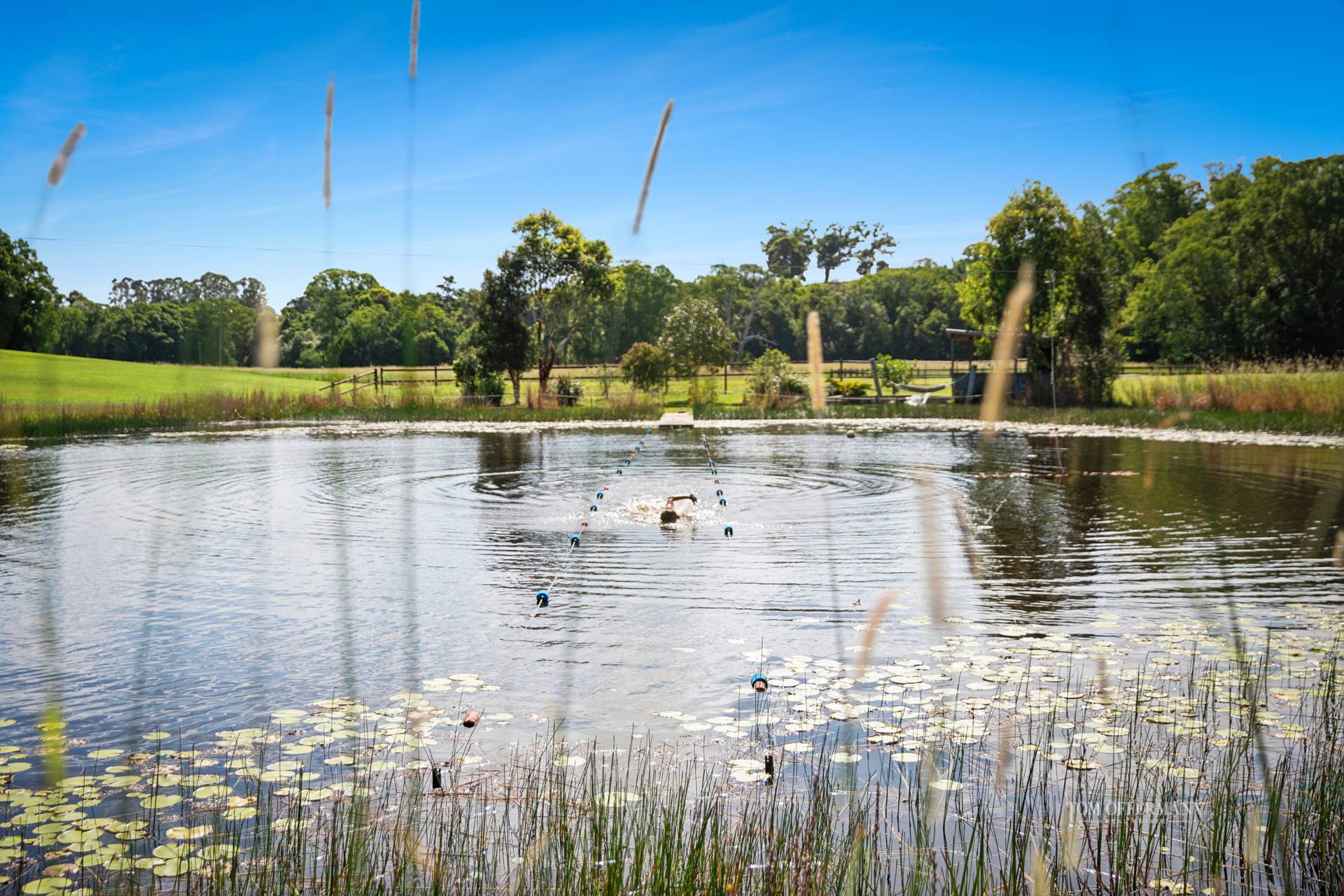 Look beyond to the meandering fresh water Six Mile Creek with platypus habitats, which borders the easy 4.3ha estate. Abutting are four paddocks, an arena, horse shelters and water troughs, designed for equestrian pursuits. There are two lily-covered dams. The larger known as party central - not surprising given it has a jetty, camp kitchen, fire pit, and a 100m zipline … just for fun!