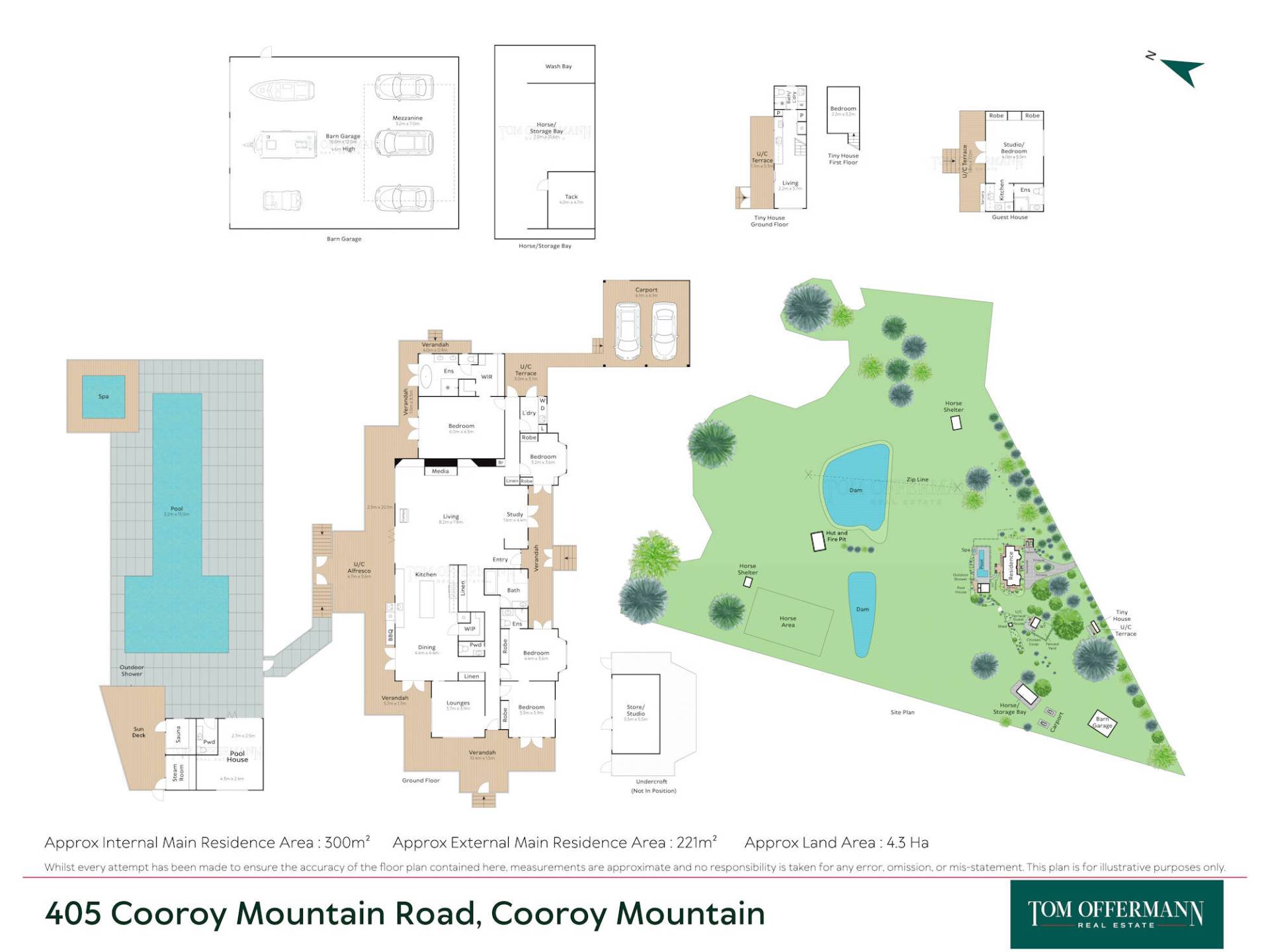 - Property: borders Six Mile Creek w platypus; 2 dams 1 w 100m zipline, jetty, camp kitchen & fire pit; 4xpaddocks w shelter & water troughs; arena suit show jumpers; barn/garage w 4.6m ceiling, roller door & mezzanine; 3-bay stable/storage w tack room, wash bay & concrete floor; guest cottage w studio/living, ensuite, aircon/fans, kitchenette w cooktop, micro/convec, fridge + servery window to terrace; Tiny House 2022 w terrace; loft b/room; living, kitchen, bathroom/laundry w washer