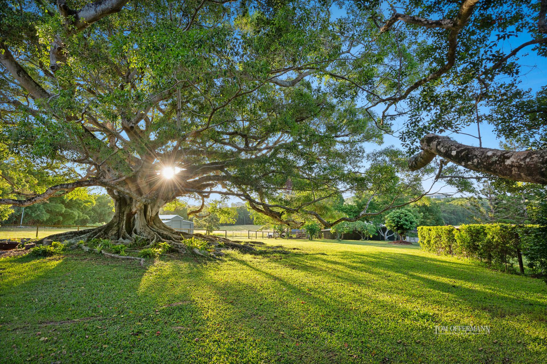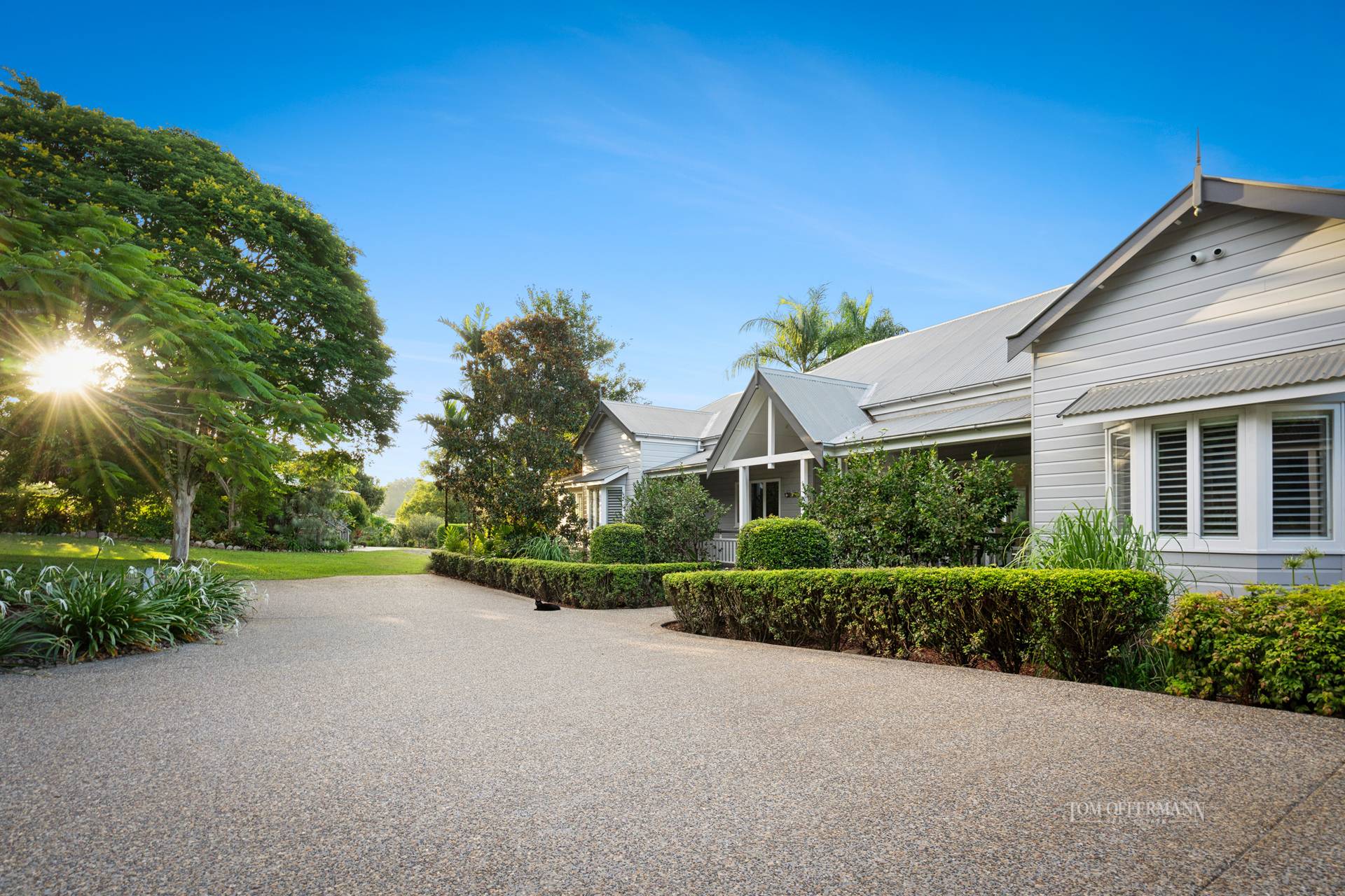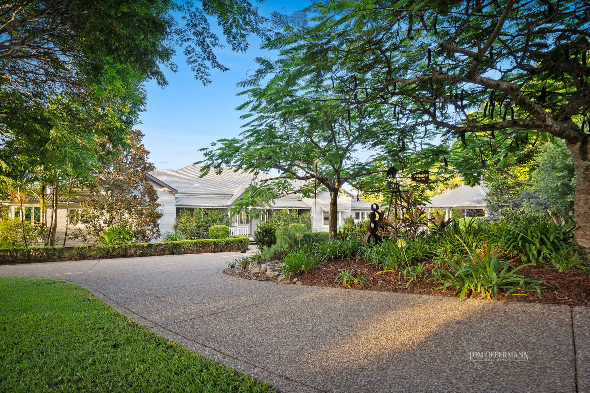 Picture exclusive Banyan Estate, Admire the tall entrance gates opening to reveal a dramatic circular driveway sculpted by nature's best verdant offerings, centrepiece Poinciana, botanical style gardens with grand wide arboured 150yr old Moreton Bay fig, mature mango trees and tropical magnolias.
