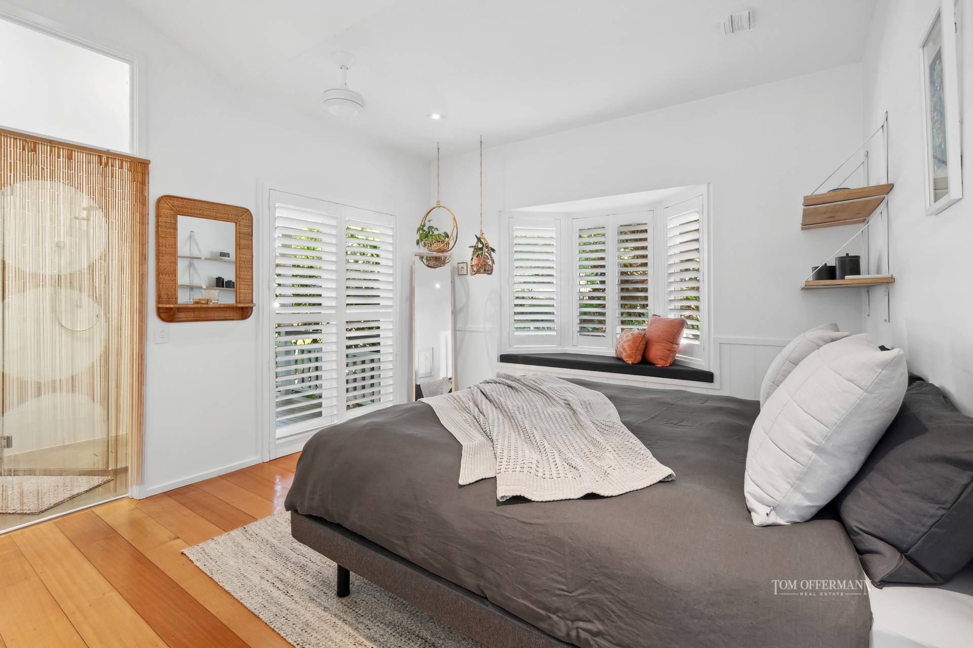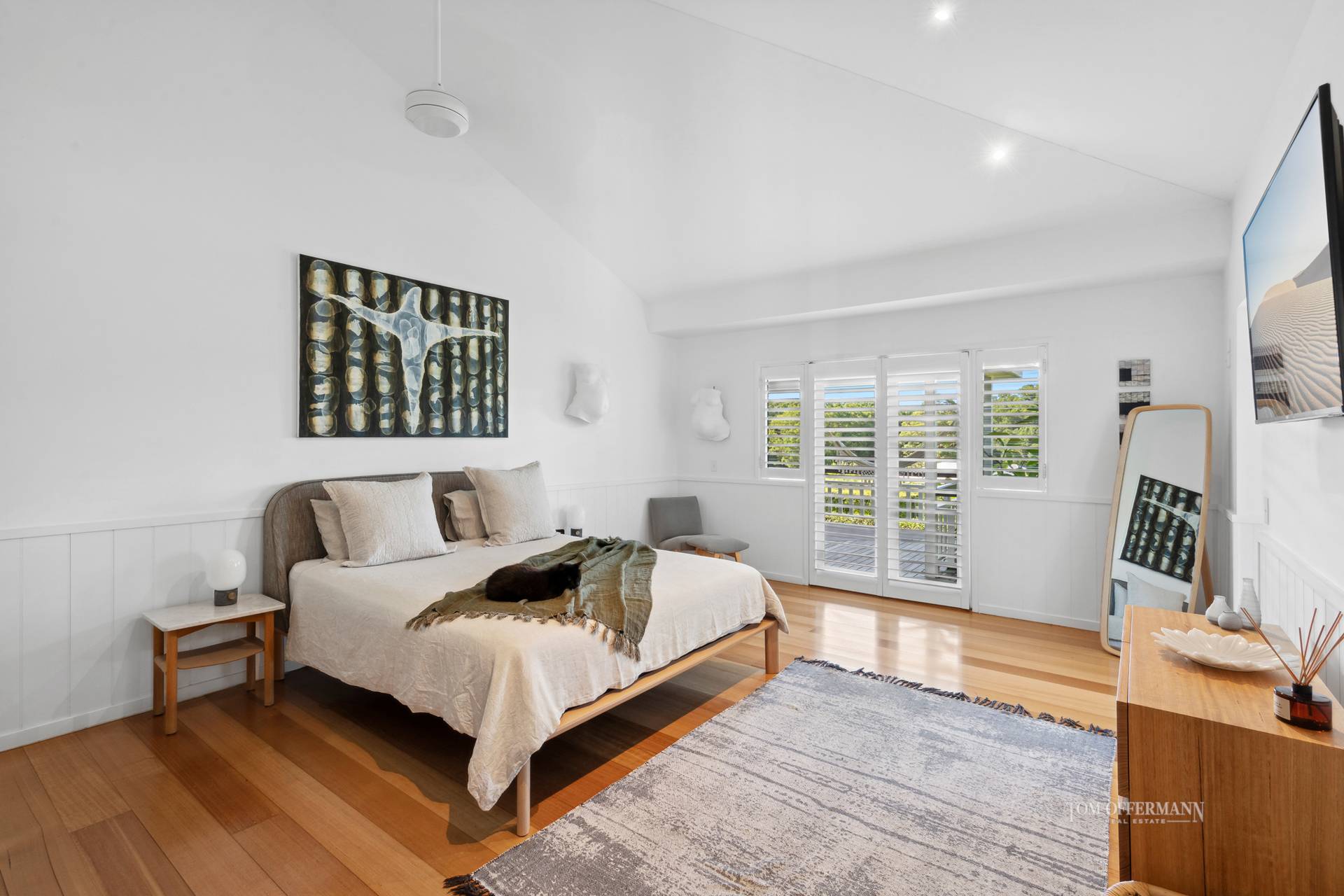 - About: built 1997; entry foyer w wide white timber framed glass paned door; 3.6m raked ceilings; blackbutt floors; VJ panelling & dado features; most rooms access verandah via French doors; plantation shutters & wispy sheers; aircon/BigAss fans; laundry w cat door; security cameras linked to phones; undercroft storage & office; living - multiple; main w column-style wood burner; custom cabinetry; study/leisure space; lounge off dedicated dining; 4 b/rooms - premier off hall + private entry off verandah; carpeted; WIR; ensuite w bath; 2-basin-topped timber cabinetry; 4th b/room w BIRs; sth wing 2 b/rooms w VJ panelled BIRs, 1 w bay window; ensuites w burnished concrete tiles; 1 w bath